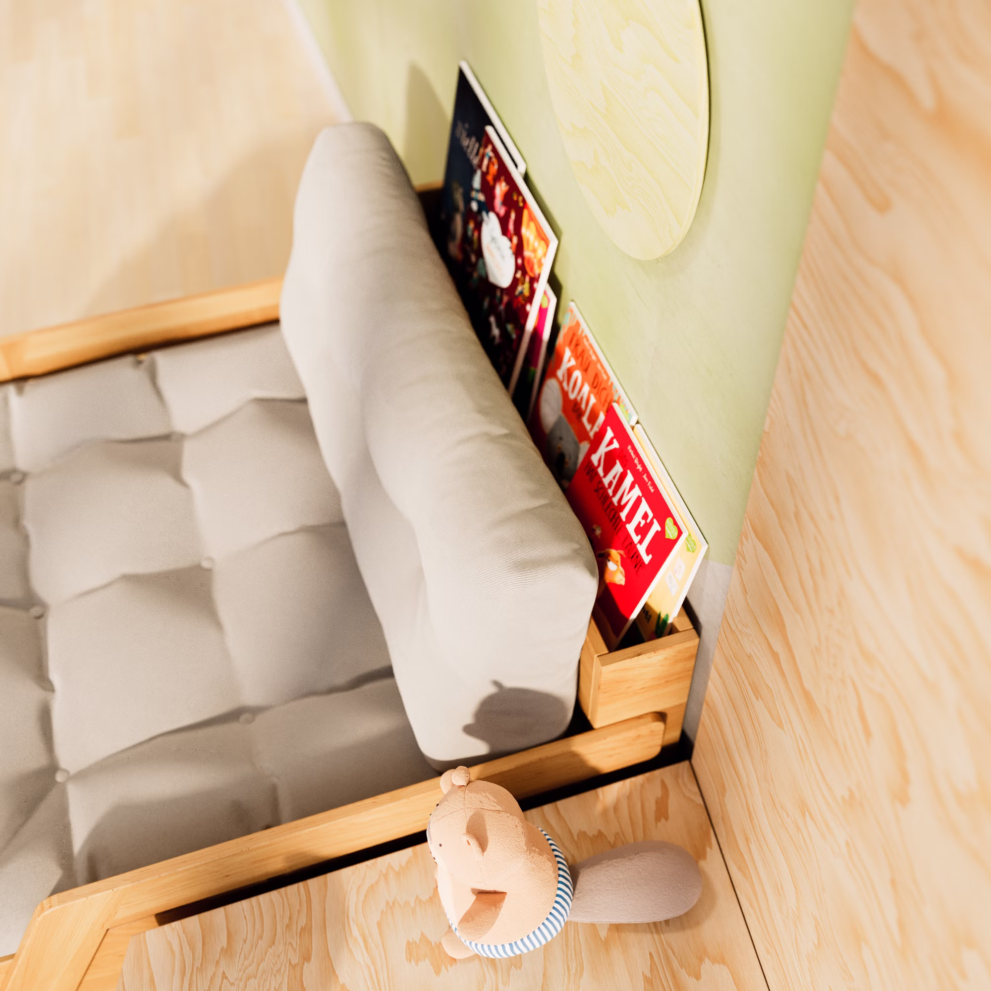 Ein besonderes Highlight ist das integrierte Ablagefach in der Rückenlehne: Hier finden Bücher, Lieblingsspielzeug oder andere Schätze ihren Platz – ordentlich verstaut und jederzeit griffbereit.