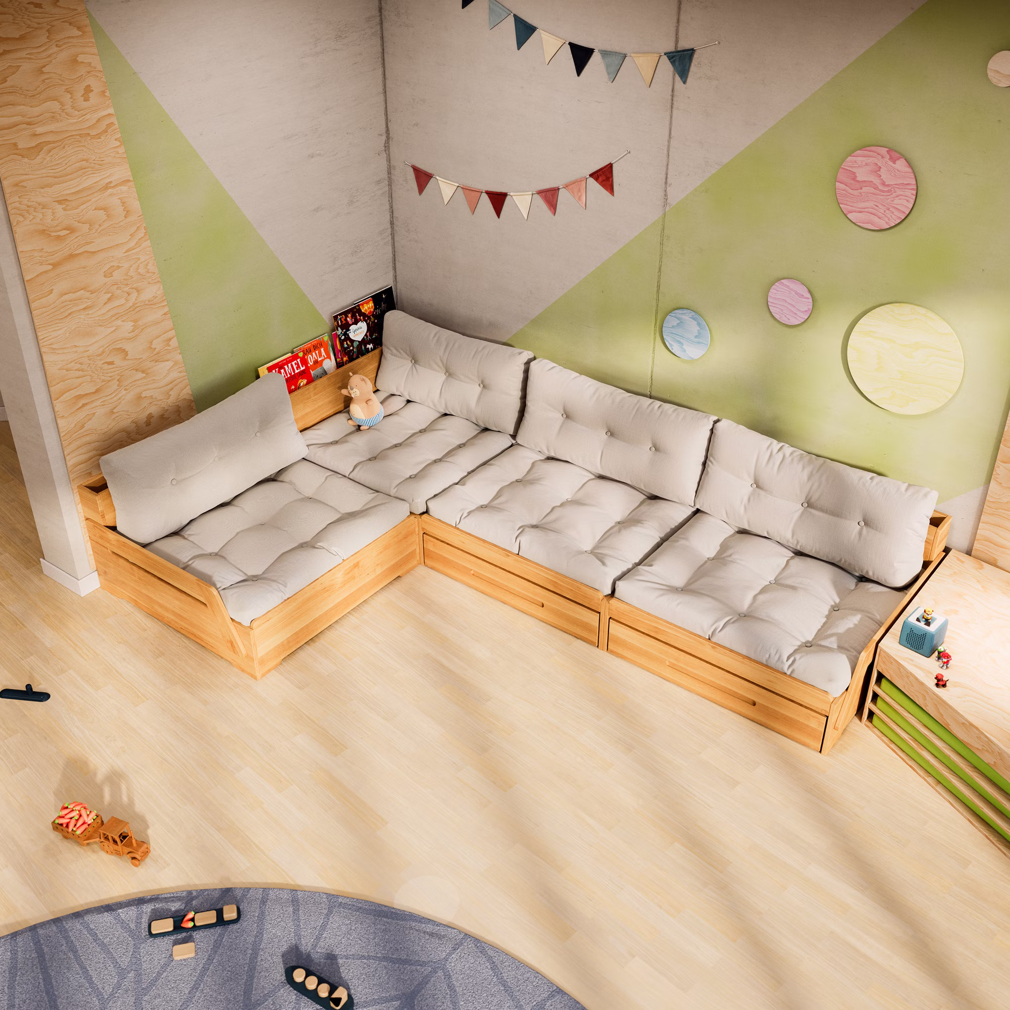 • 1x Lina Spielsofa und Schlafsofa Eckmodul (inkl. Lattenrost und integriertes Ablagefach in der Rückenlehne)
