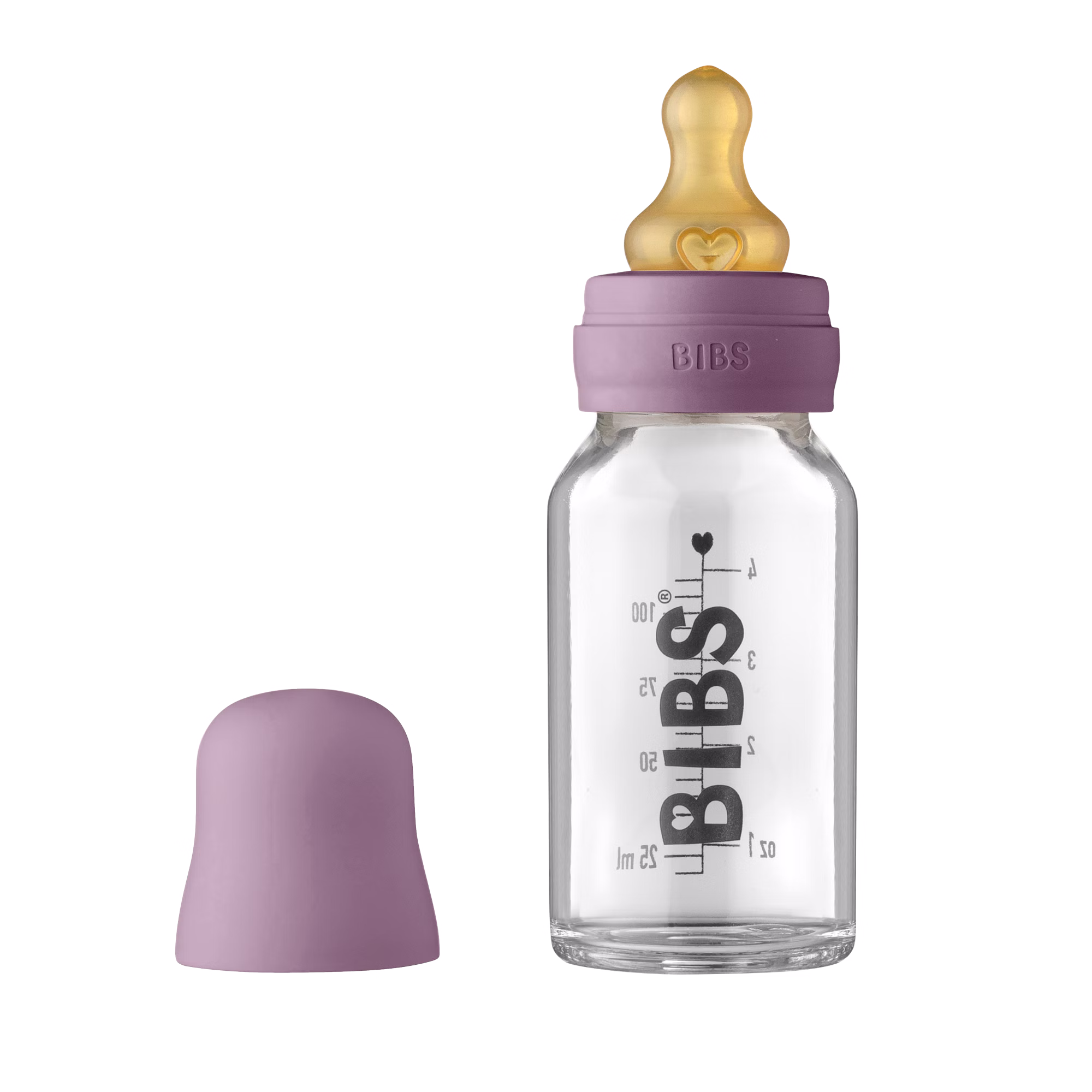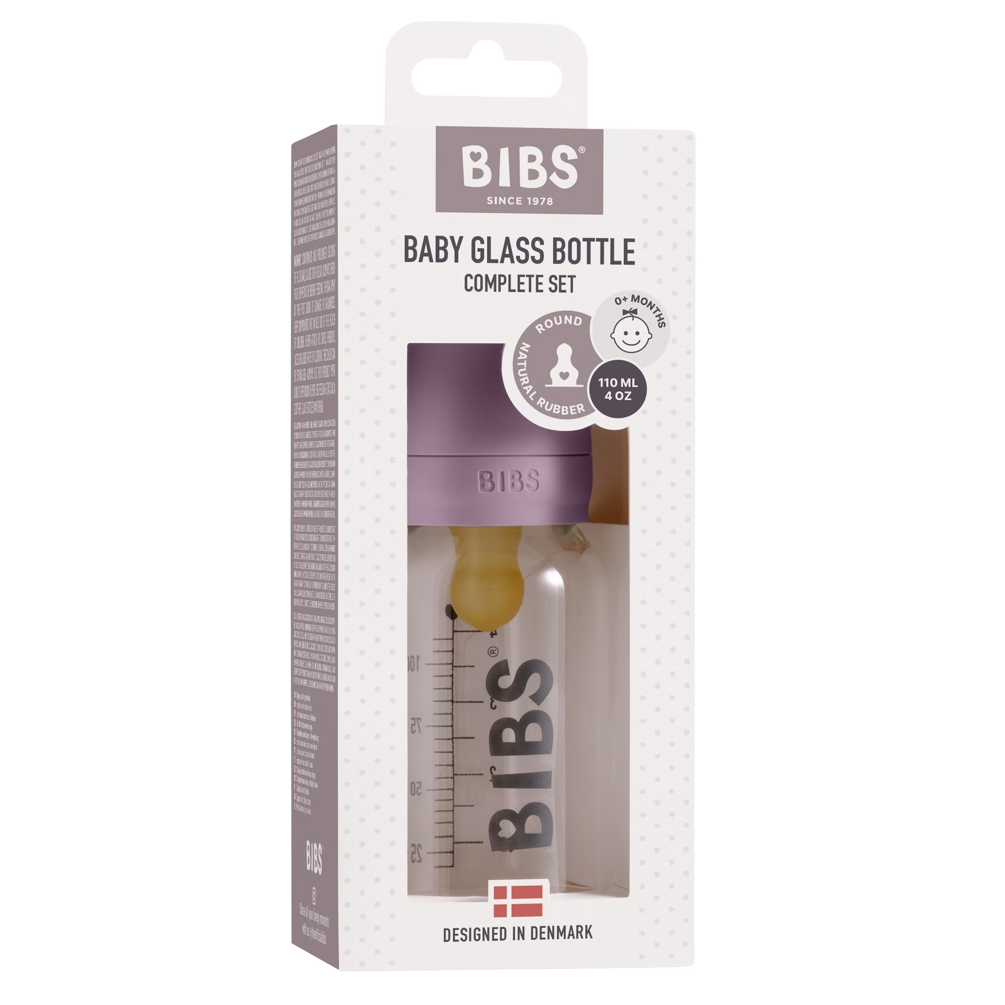 Dieses Set beinhaltet: Glasflasche 110 ml, Kappe, 1 Sauger (langsamer Fluss), Milchsperre, Schraubkappe, Klapptrichter.