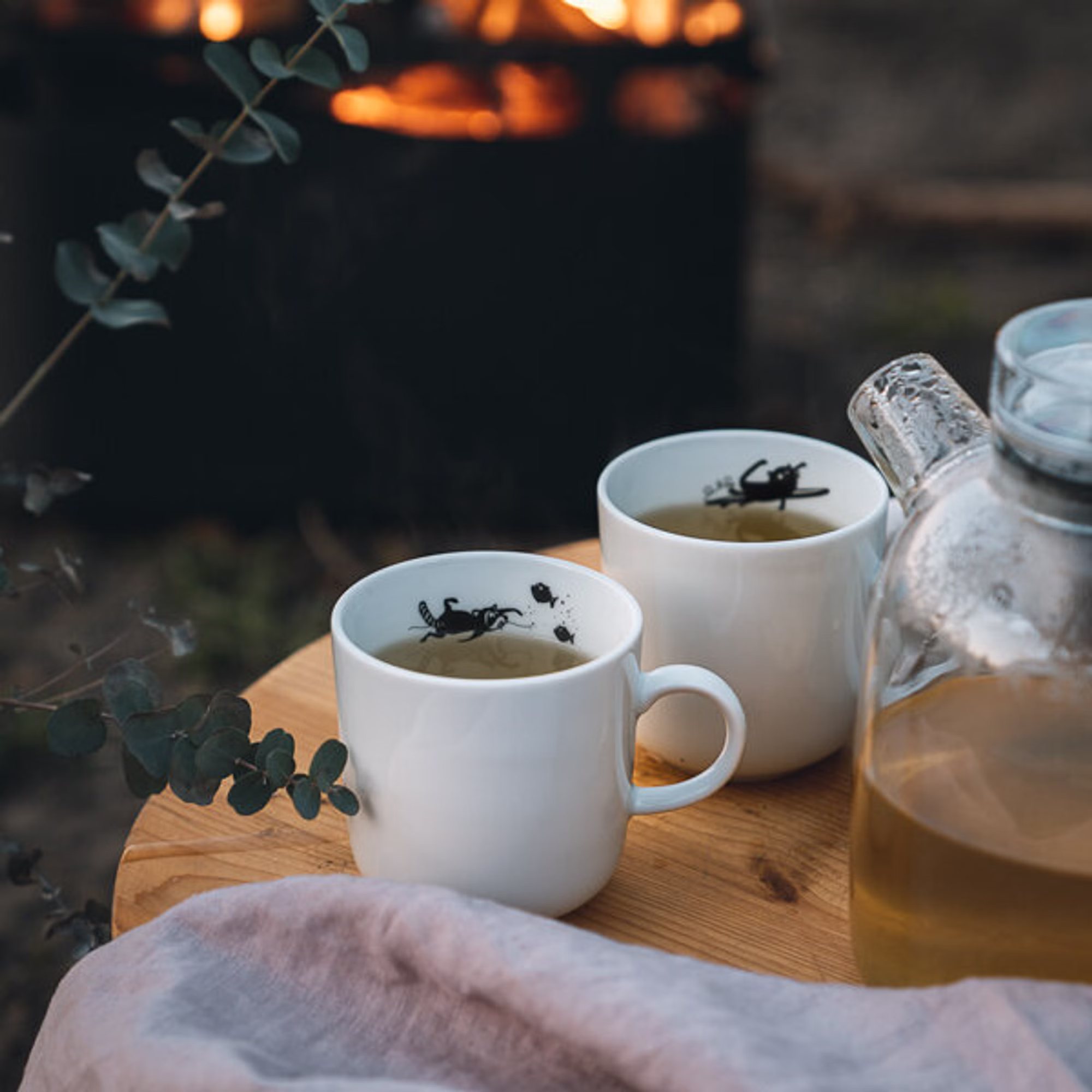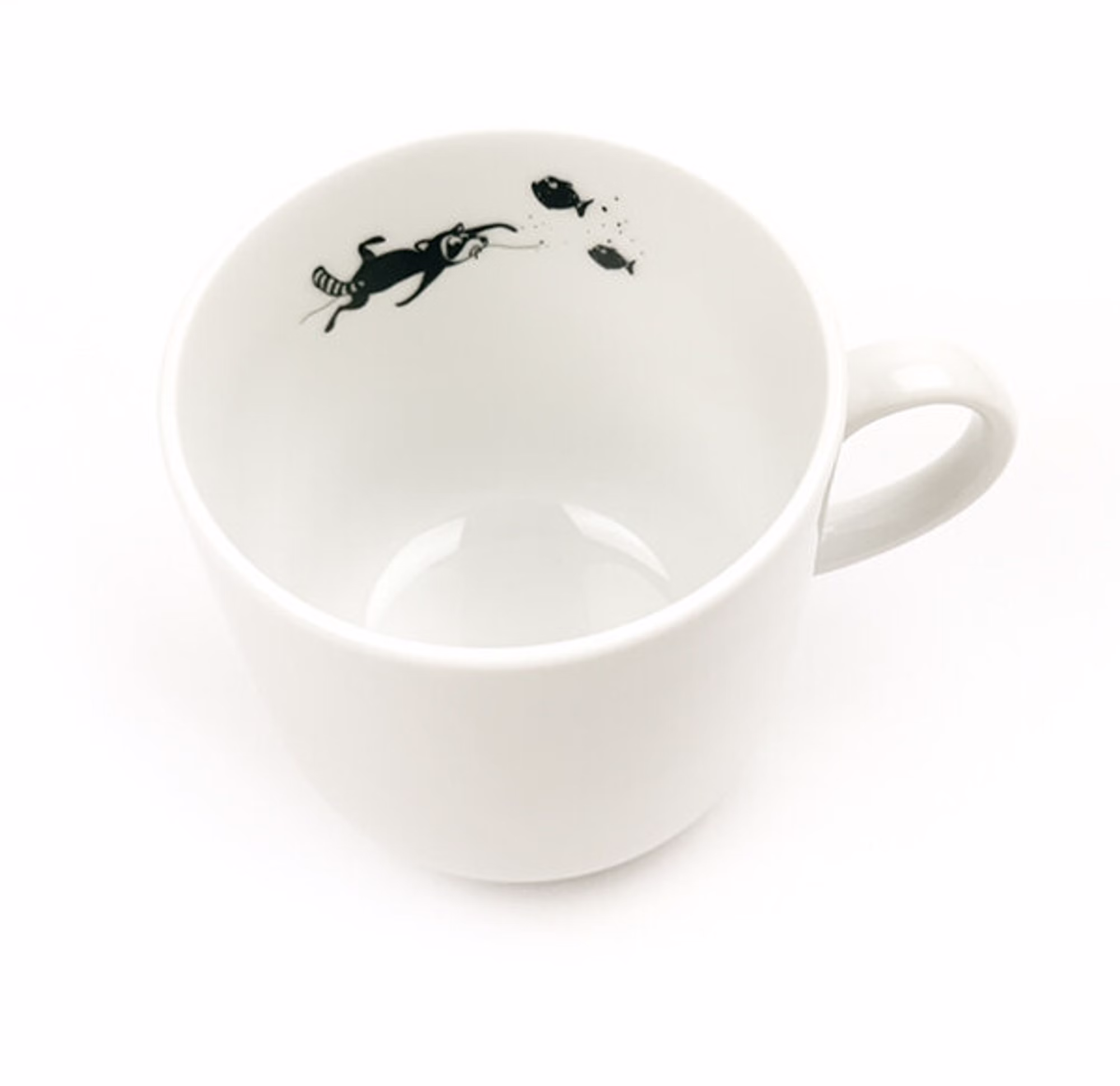 Diese hochwertige Tasse aus Porzellan bringt gute Laune auf den Tisch. Im Inneren schwimmt Waschbär Mats entspannt mit den Fischen – ein charmantes Motiv mit liebevollem Detail. Die Tasse liegt angenehm in der Hand, ist spülmaschinengeeignet und damit perfekt für den täglichen Einsatz.