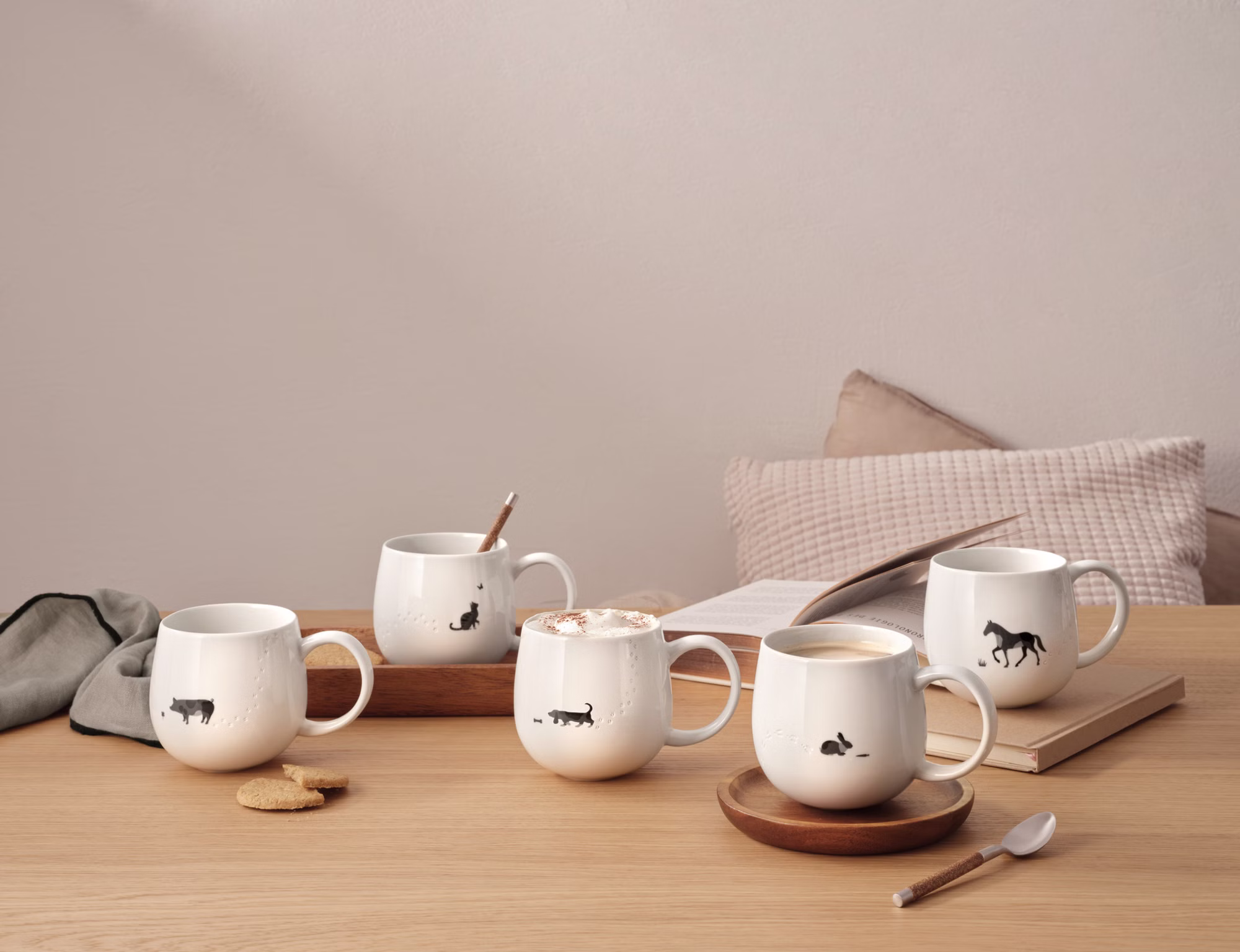 Diese liebevoll gestaltete Tasse mit Pferde-Fußspuren bringt ein Stück Reiterhof an den Frühstückstisch.
