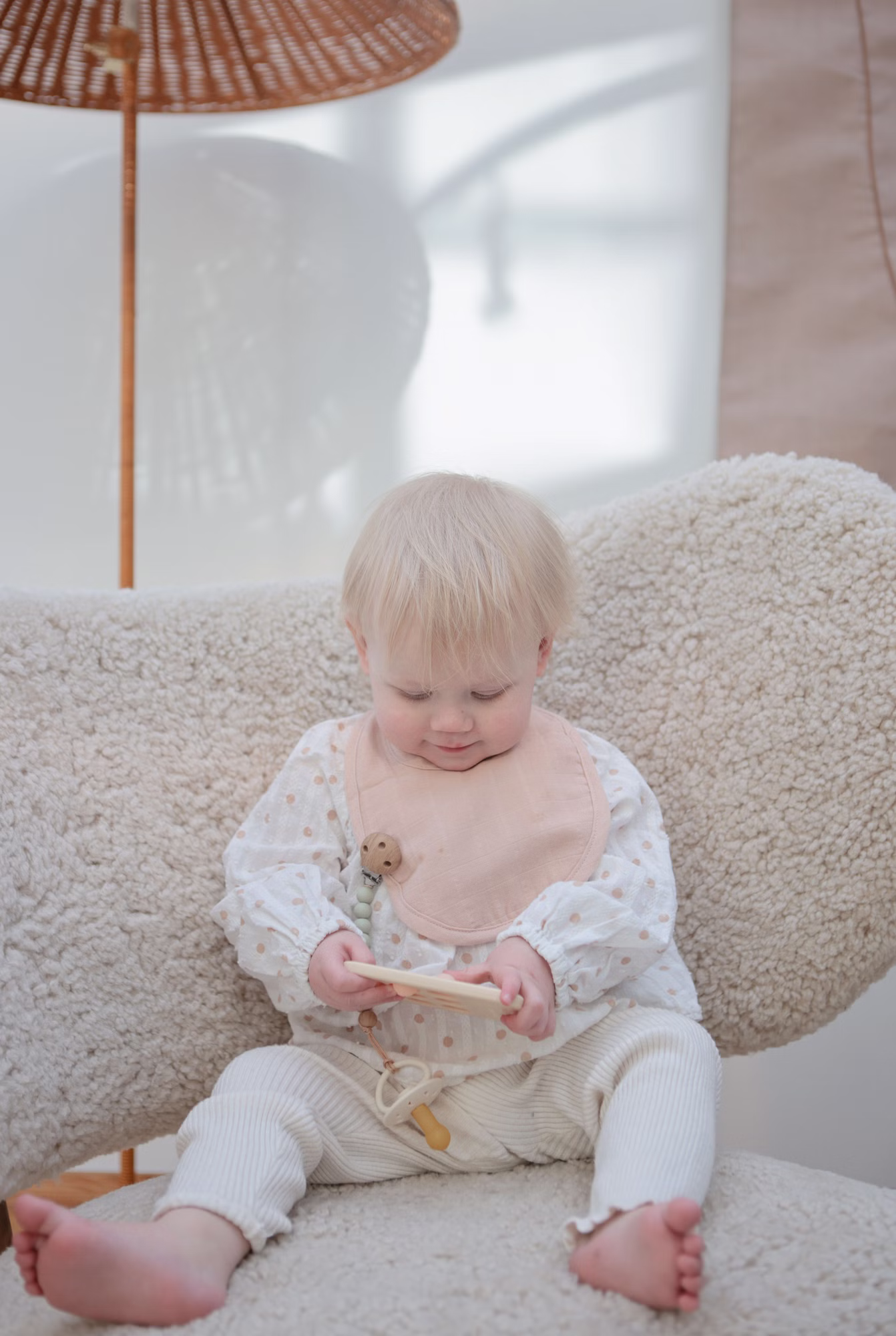 Die Musselin-Lätzchen sind weich und anschmiegsam und haben einen doppelten Druckknopfverschluss, damit zahnende Babys den ganzen Tag trocken bleiben.