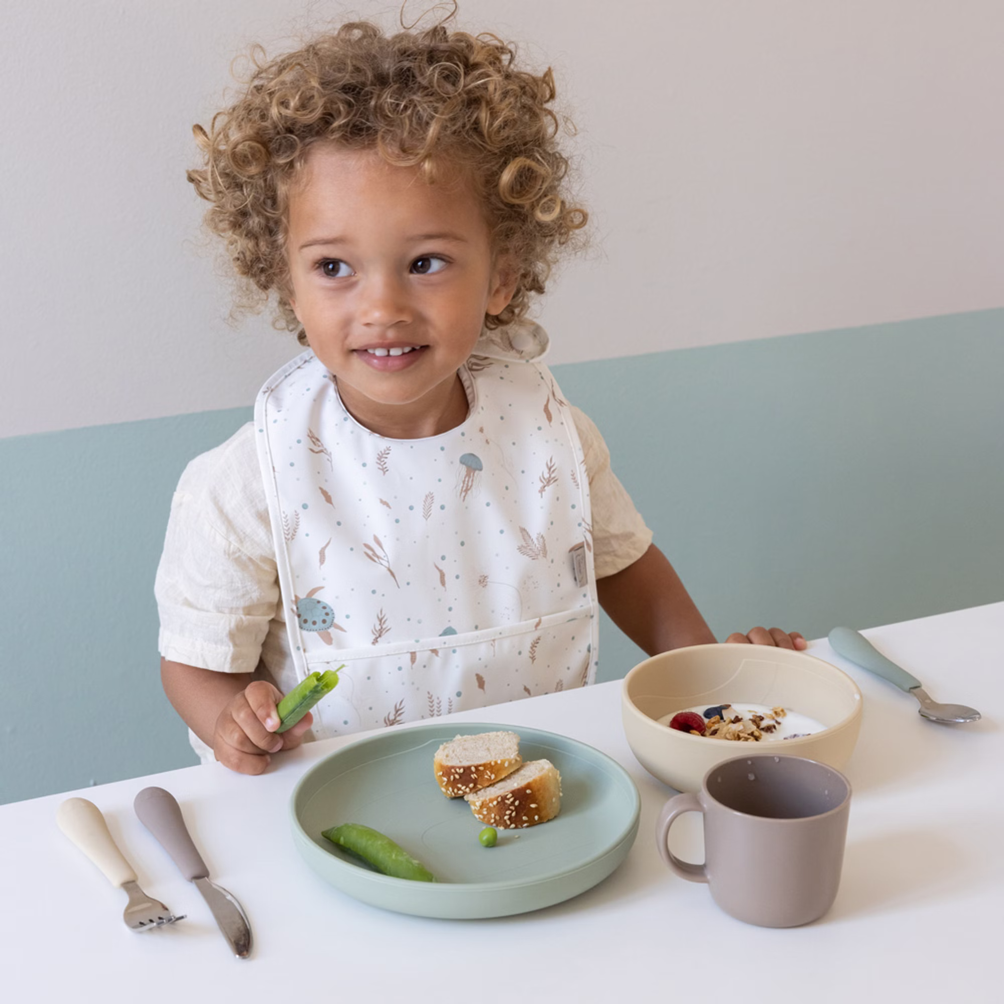 Ein alltägliches Must-Have für die etwas chaotischen Mahlzeiten. Wird in einem Zweier-Set mit zwei Lätzchen geliefert, einem bedruckten und einem einfarbigen.