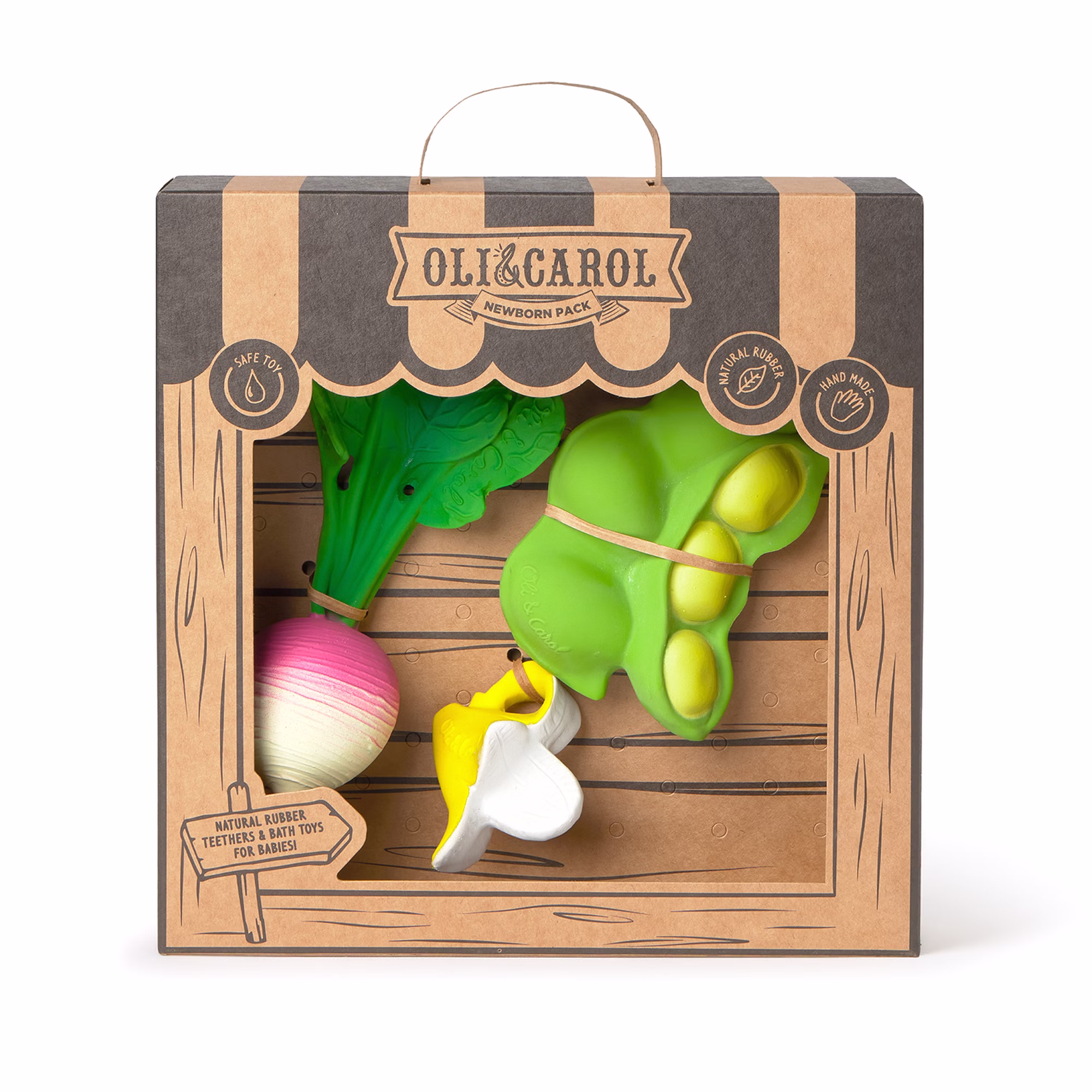 Dieses Baby-Geschenkset mit Obst und Gemüse enthält die wundervollen Beißringe Radischen und Erbsen für Babys sowie den klassischen Mini-Beißring Banane für Neugeborene.