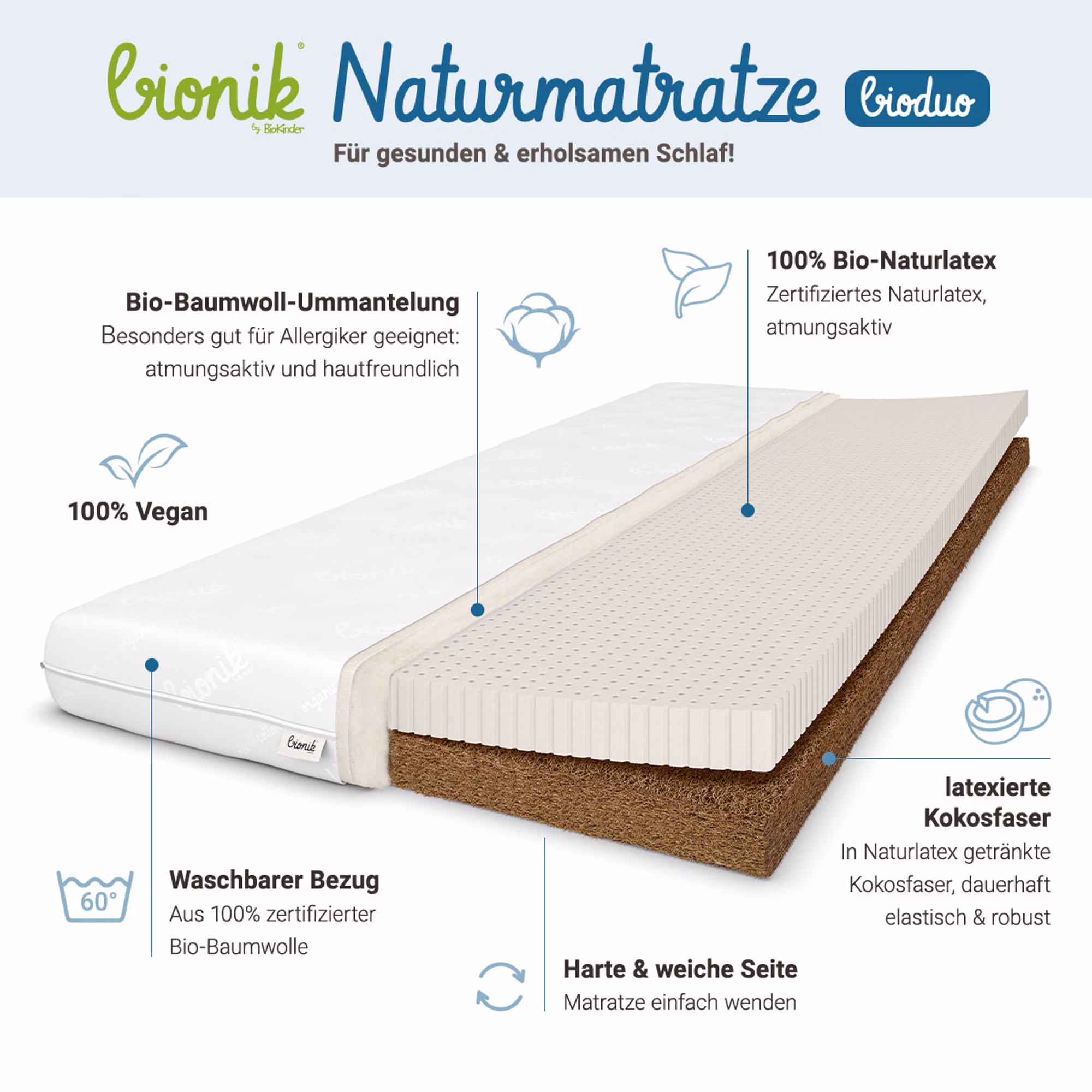 Die bionik Bioduo Baby- und Kleinkindmatratze mit einem Kern aus 3 cm latexierter Kokosfaser und 4 cm Naturlatex ist zum Wenden und bietet Babys und Kleinkindern die Option einer härteren und einer weicheren Seite, ganz nach Alter und persönlicher Vorliebe.