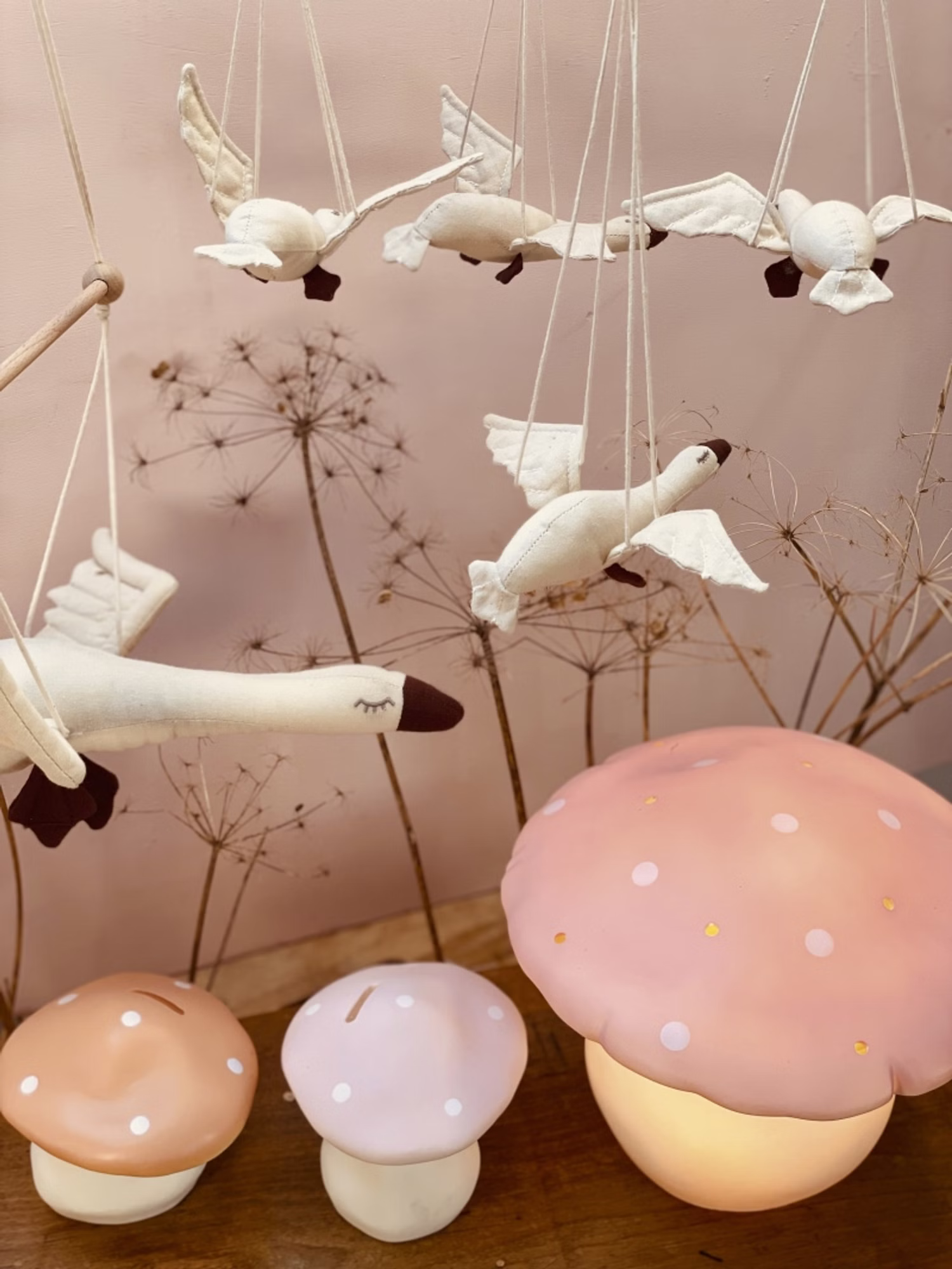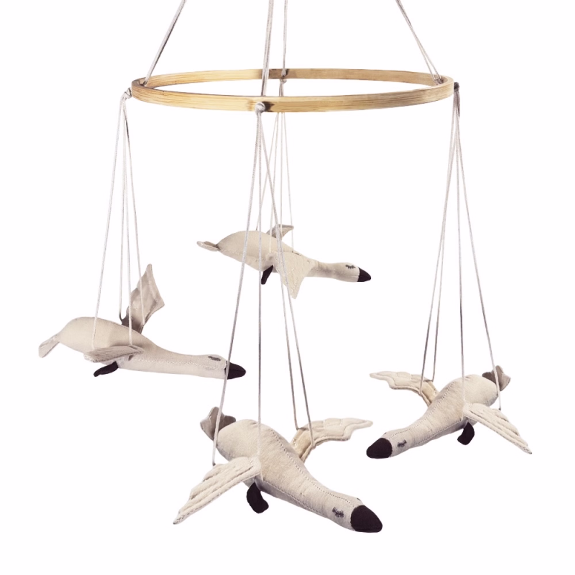 Die vier Gänse aus Baumwolle zaubern eine ganz besondere Atmosphäre in den Raum. Mit sanften Bewegungen fliegen sie durch die Luft und sorgen für die perfekte Ablenkung über dem Wickeltisch oder dem Babybett. Zusätzlich wirken sie beruhigend und begleiten Ihr Baby sanft in den Schlaf.