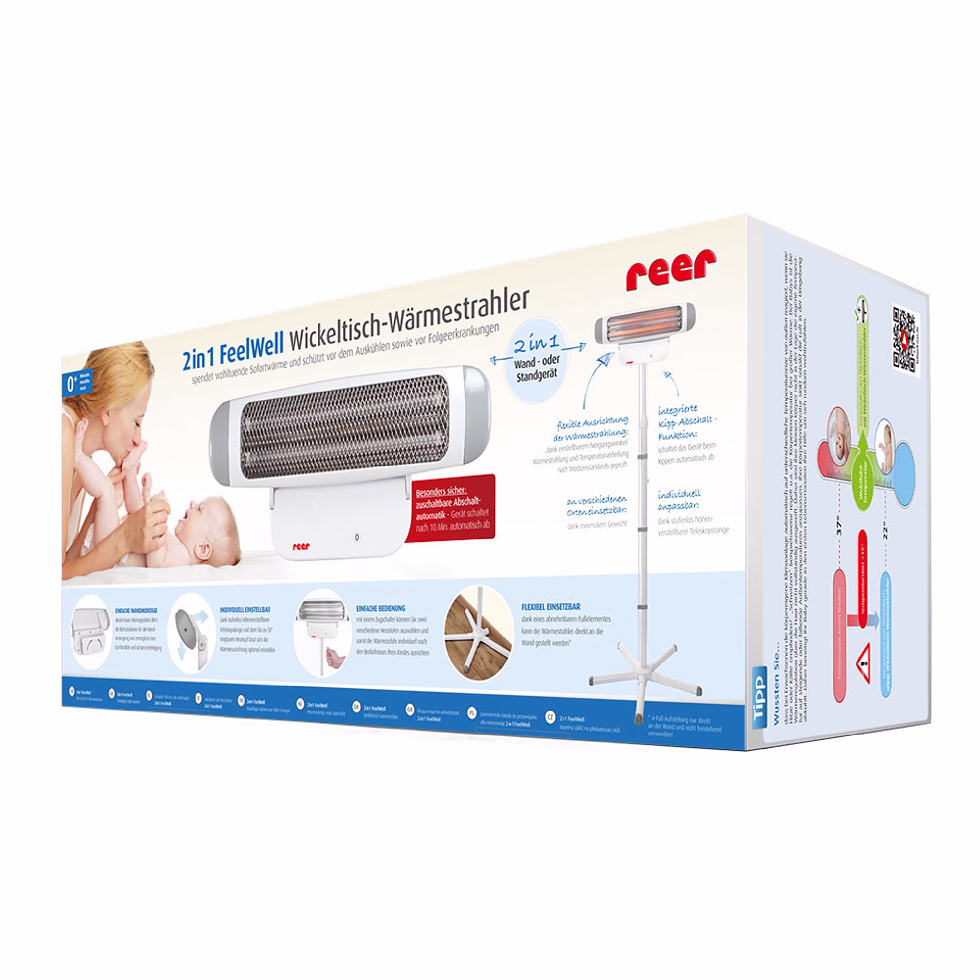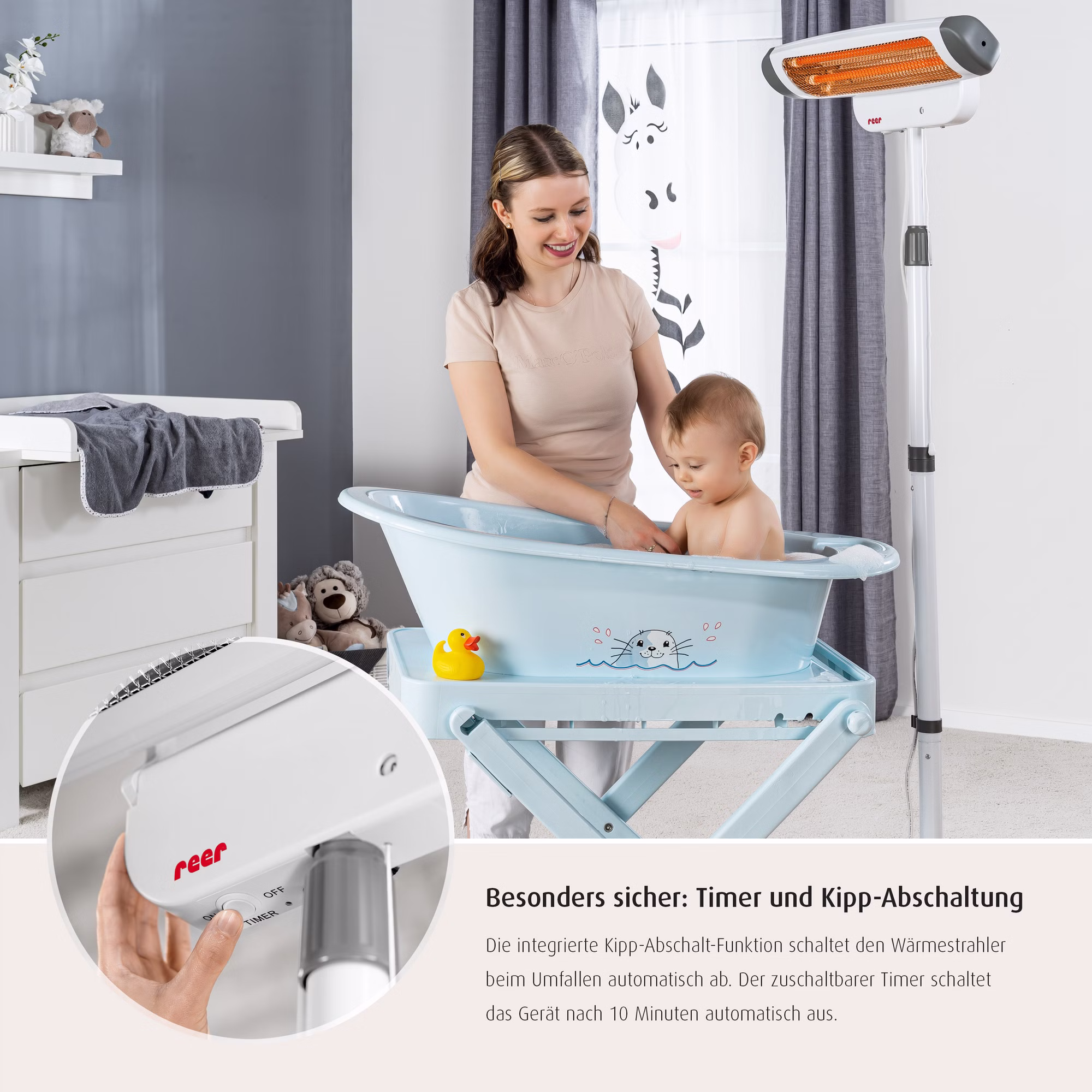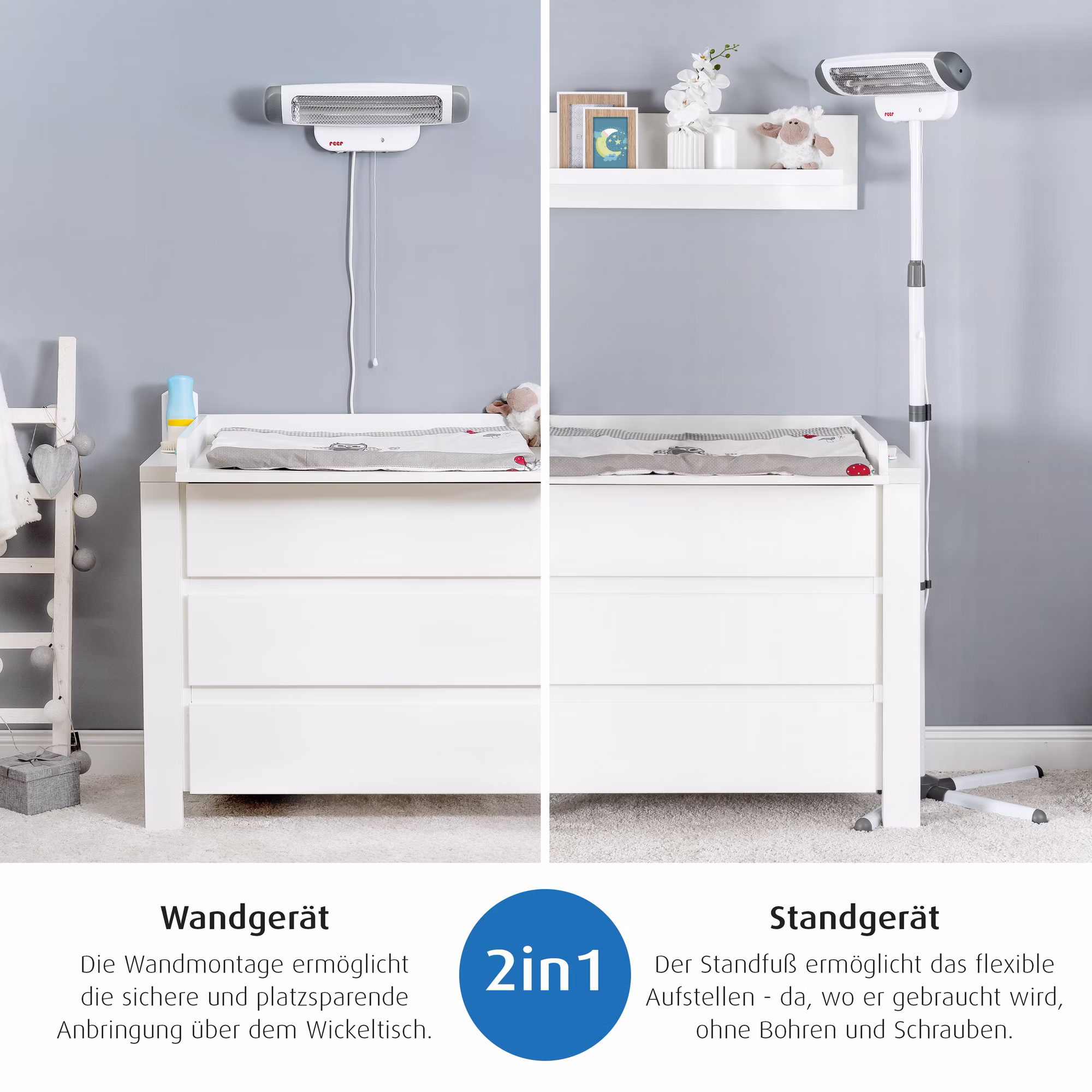 Gerade nach dem Baden oder beim Wickeln können, besonders Säuglinge sich schnell auskühlen. Der 2in1 Wickeltisch Wärmestrahler von Reer beugt dem vor, indem er sofort angenehme und wohltuende Wärme spendet. Der Strahler kann an der Wand montiert, oder mit dem Ständer neben dem Wickeltisch frei positioniert werden. Die abnehmbaren Standfüße erlauben dem Heizstrahler auch eng an dem Wickeltisch oder auch an der Wand zu stehen. Die höhenverstellbare Teleskopstange (155-185 cm) und der bis zu 50 Grad neigbare Heizkopf ermöglichen es dort Wärme zu spenden, wo sie gebraucht wird. Das Gerät ist dank des Zugschalters sehr leicht zu bedienen. Es ist mit einem Zug im Handumdrehen eingeschaltet und sorgt sofort für eine wohltuende Wärmeausstrahlung. Durch einen erneuten Zug an der Zugschnur kann die Heizstufe verändert, oder das Gerät wieder ausgeschaltet werden. Die intigrierte Kipp-Abschalt-Funktion sorgt dafür, dass sich das Gerät beim Umfallen automatisch abschaltet. Nach Aktivierung des zuschaltbaren Timers, geht der Wärmestrahler automatisch aus und macht den Wickeltisch Wärmestrahler somit besonders sicher.