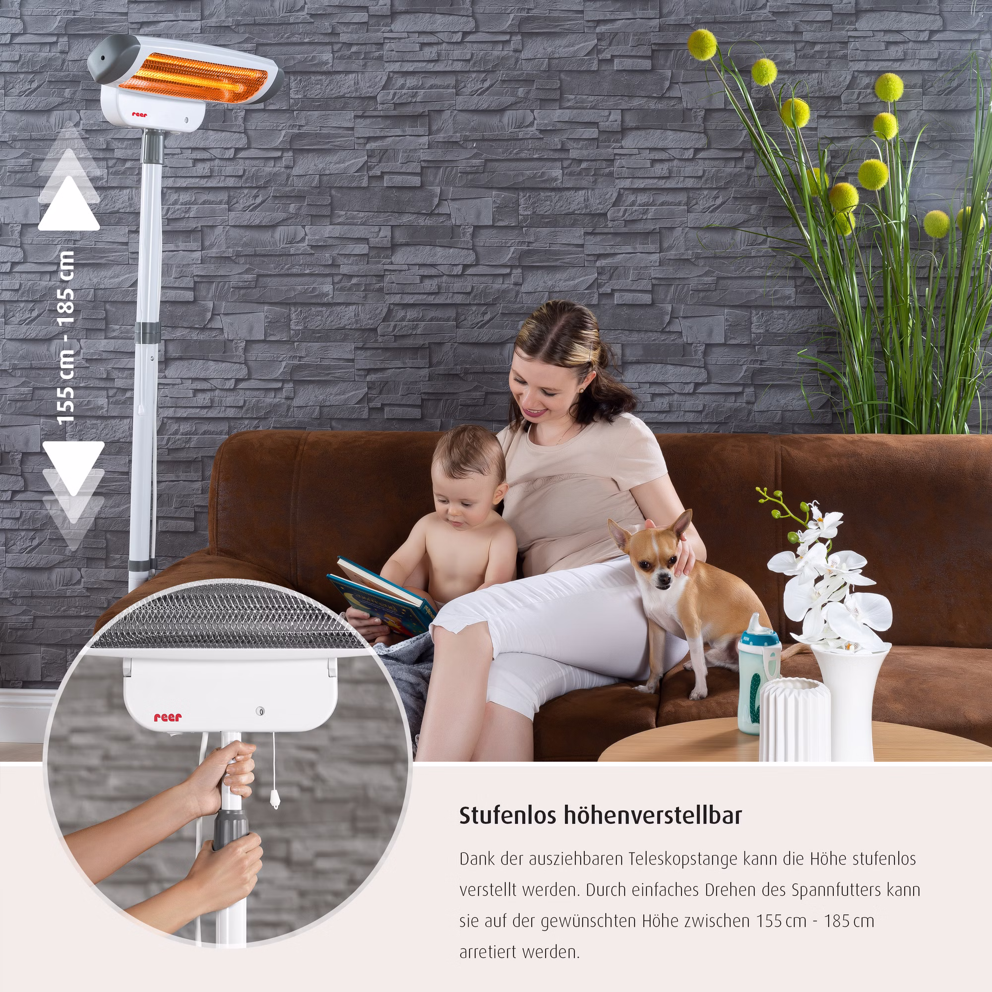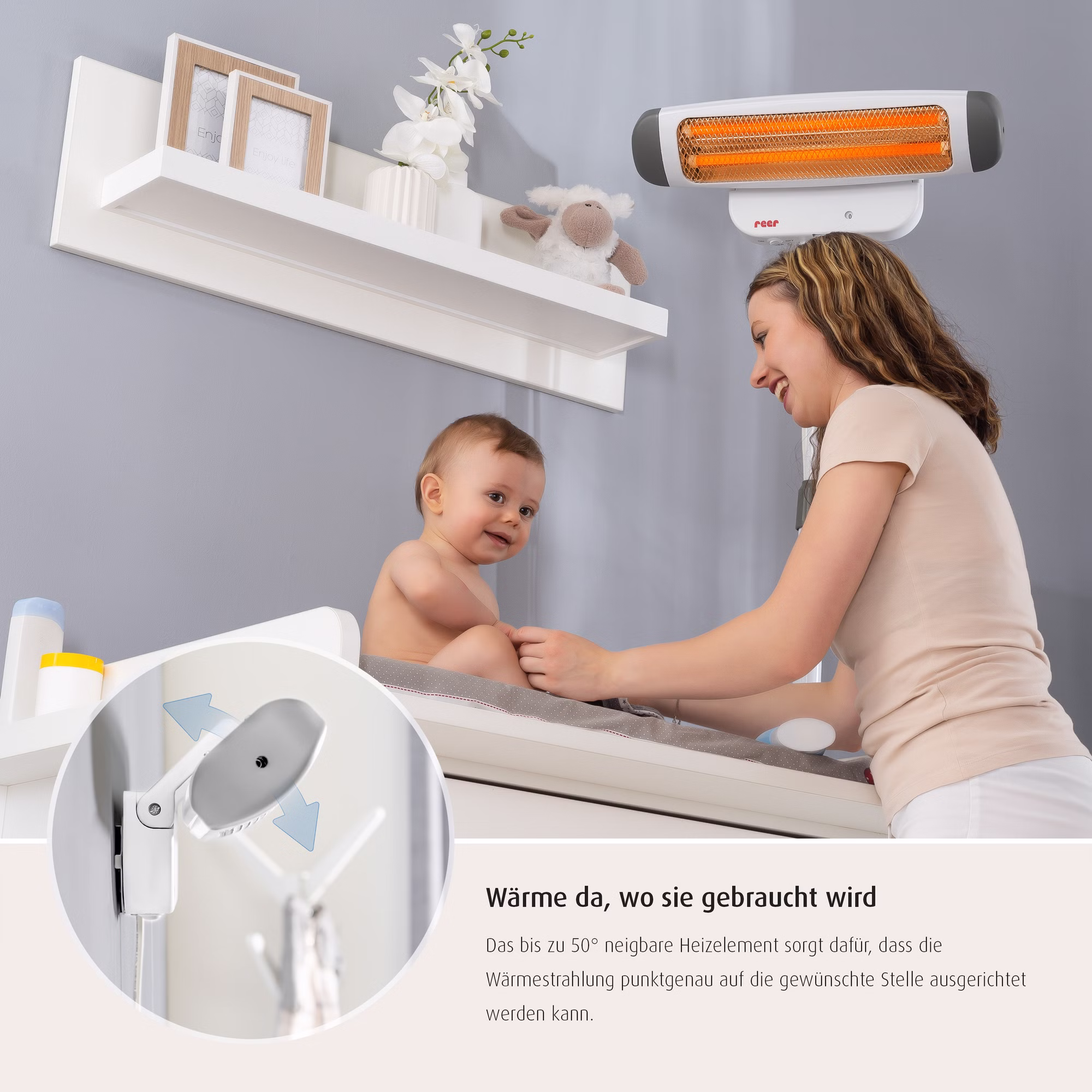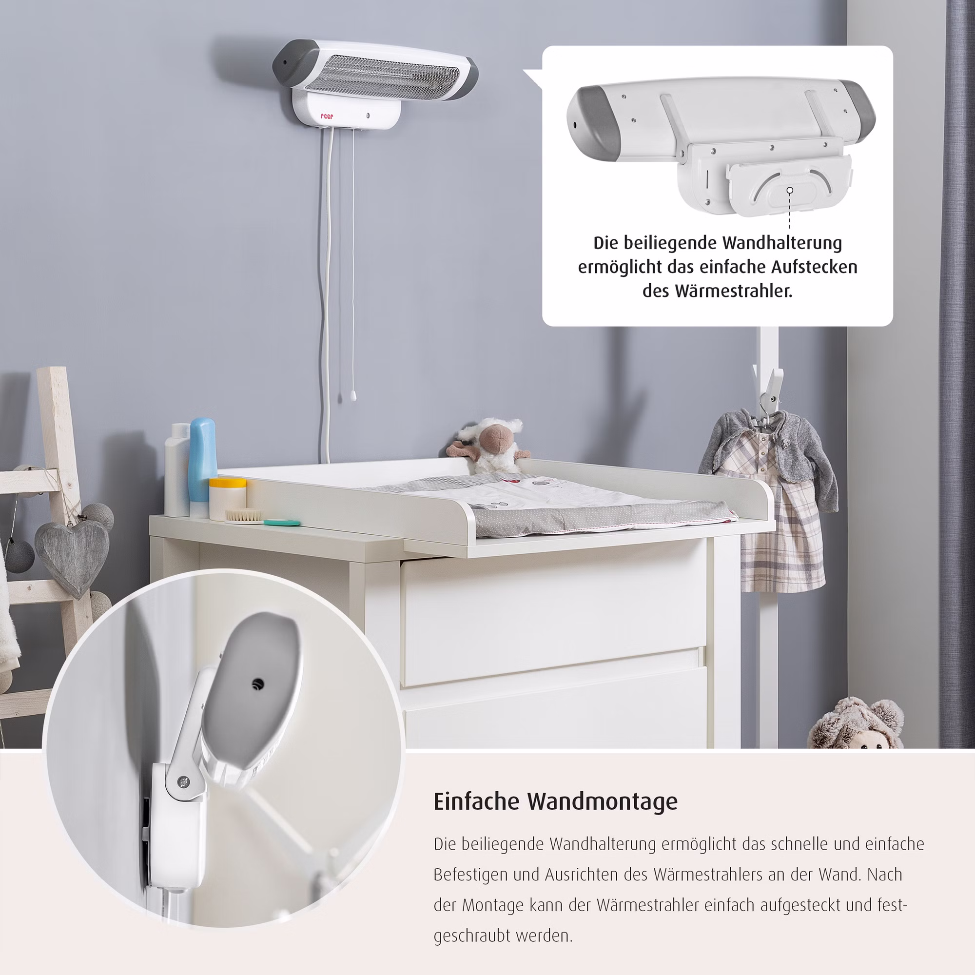Gerade nach dem Baden oder beim Wickeln können, besonders Säuglinge sich schnell auskühlen. Der 2in1 Wickeltisch Wärmestrahler von Reer beugt dem vor, indem er sofort angenehme und wohltuende Wärme spendet. Der Strahler kann an der Wand montiert, oder mit dem Ständer neben dem Wickeltisch frei positioniert werden. Die abnehmbaren Standfüße erlauben dem Heizstrahler auch eng an dem Wickeltisch oder auch an der Wand zu stehen. Die höhenverstellbare Teleskopstange (155-185 cm) und der bis zu 50 Grad neigbare Heizkopf ermöglichen es dort Wärme zu spenden, wo sie gebraucht wird. Das Gerät ist dank des Zugschalters sehr leicht zu bedienen. Es ist mit einem Zug im Handumdrehen eingeschaltet und sorgt sofort für eine wohltuende Wärmeausstrahlung. Durch einen erneuten Zug an der Zugschnur kann die Heizstufe verändert, oder das Gerät wieder ausgeschaltet werden. Die intigrierte Kipp-Abschalt-Funktion sorgt dafür, dass sich das Gerät beim Umfallen automatisch abschaltet. Nach Aktivierung des zuschaltbaren Timers, geht der Wärmestrahler automatisch aus und macht den Wickeltisch Wärmestrahler somit besonders sicher.
