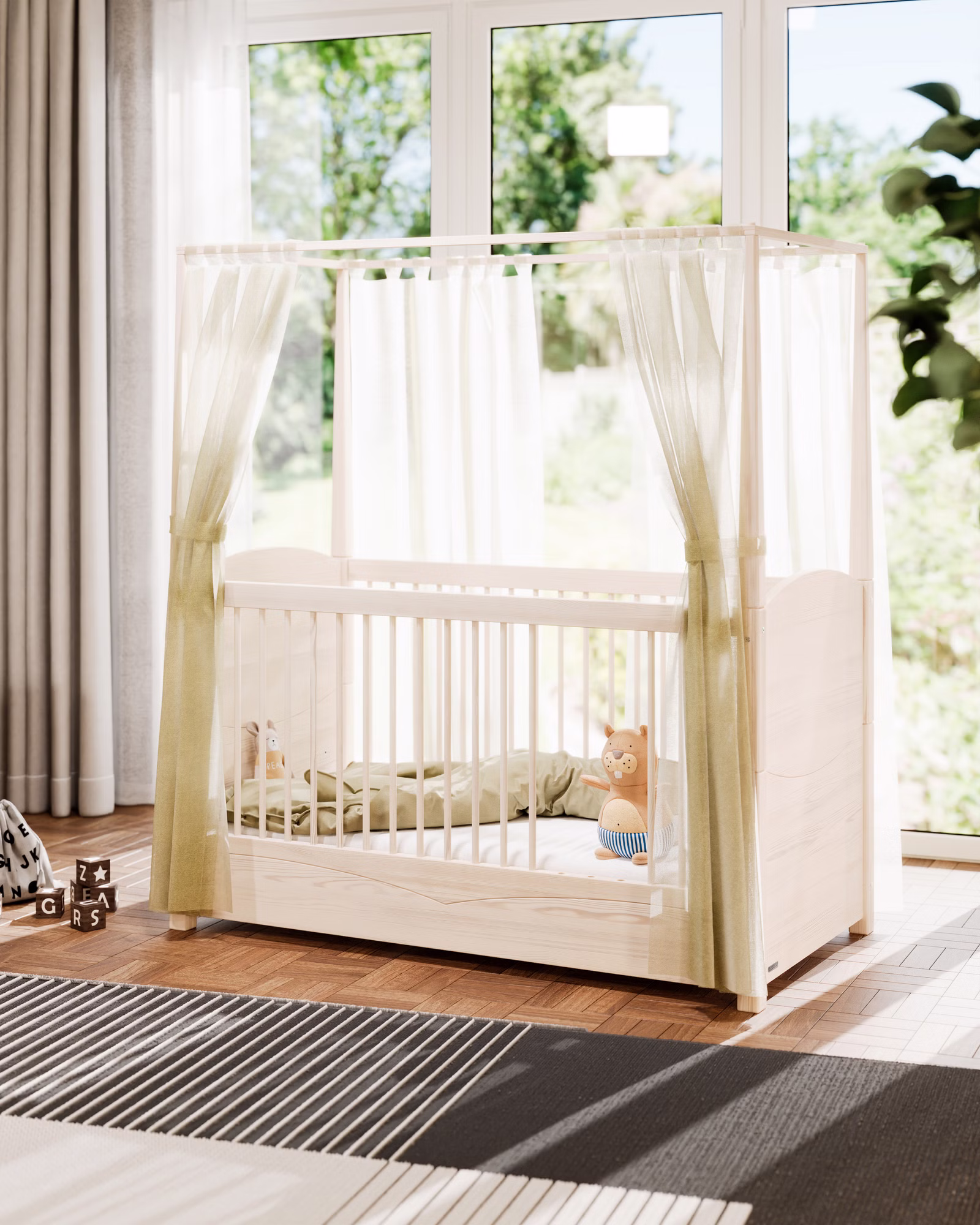 Mit dem Himmelbett-Aufsatz verwandelt sich das Luca Babybett in ein traumhaftes Himmelbett.