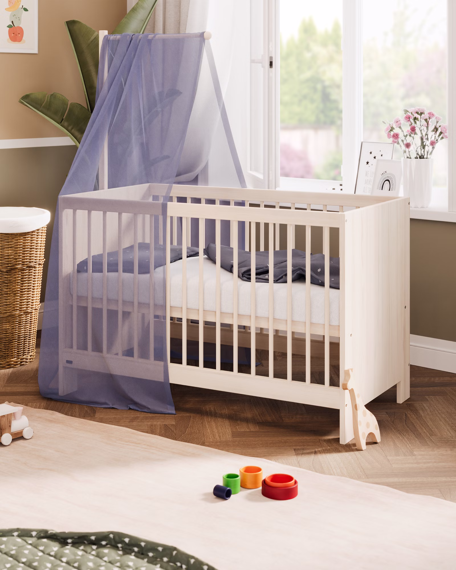 • In Höhe 40 cm auch als Beistellbettchen am Elternbett geeignet (der Lattenrost wird an Kopf- und Fußende fest verschraubt)