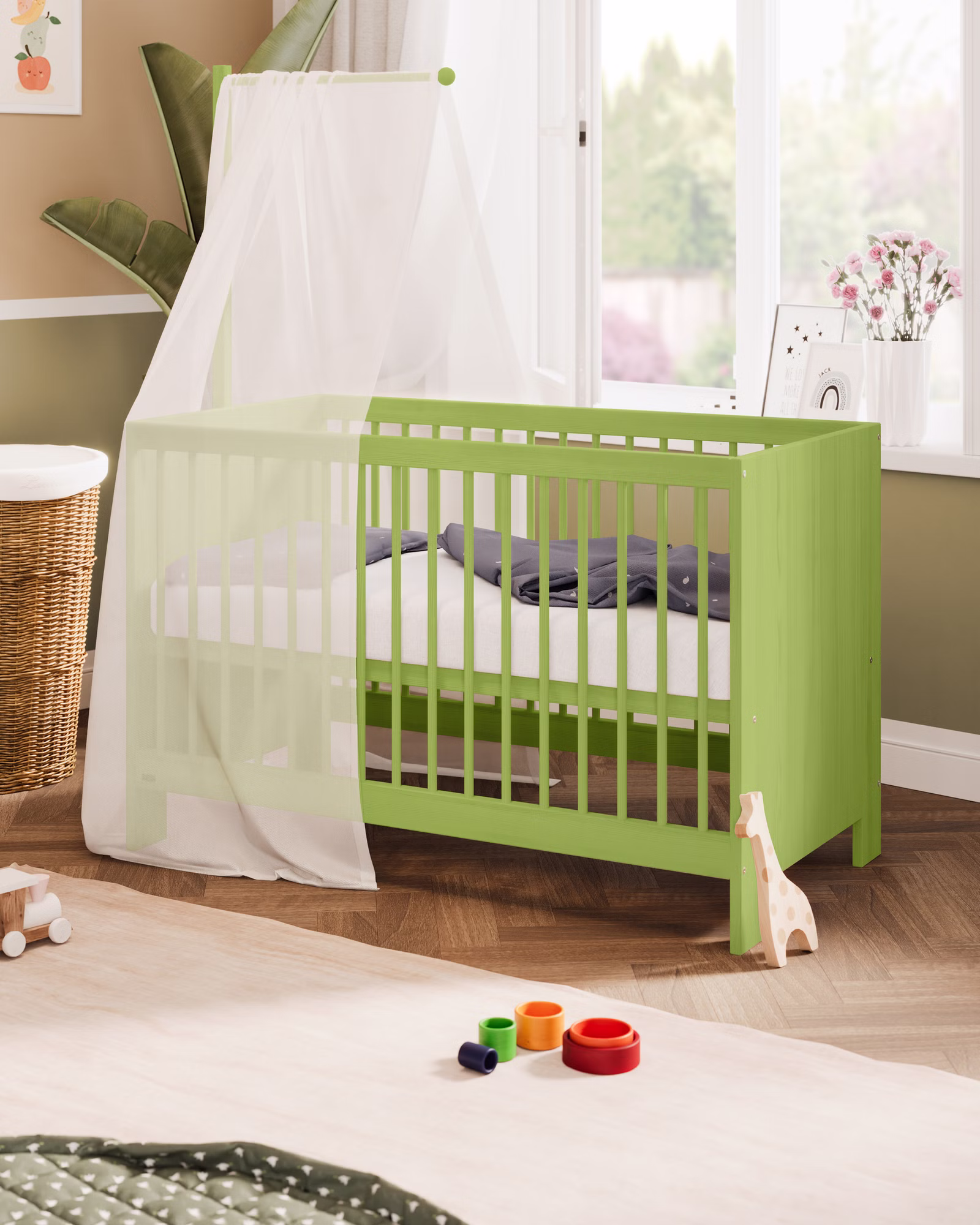 Ein nachhaltiges Baby- und Kleinkindbett. Liegefläche: 60 x 120 cm, Außenmaß: H 80 x B 124 x T 66 cm.