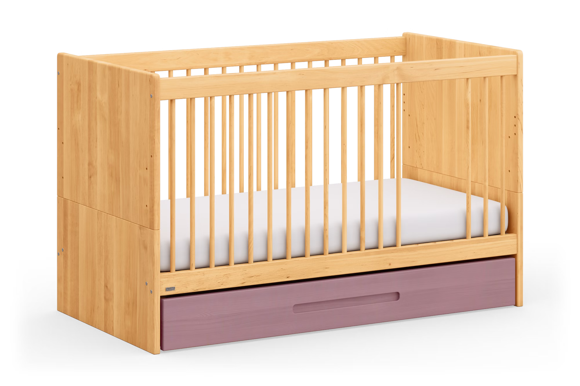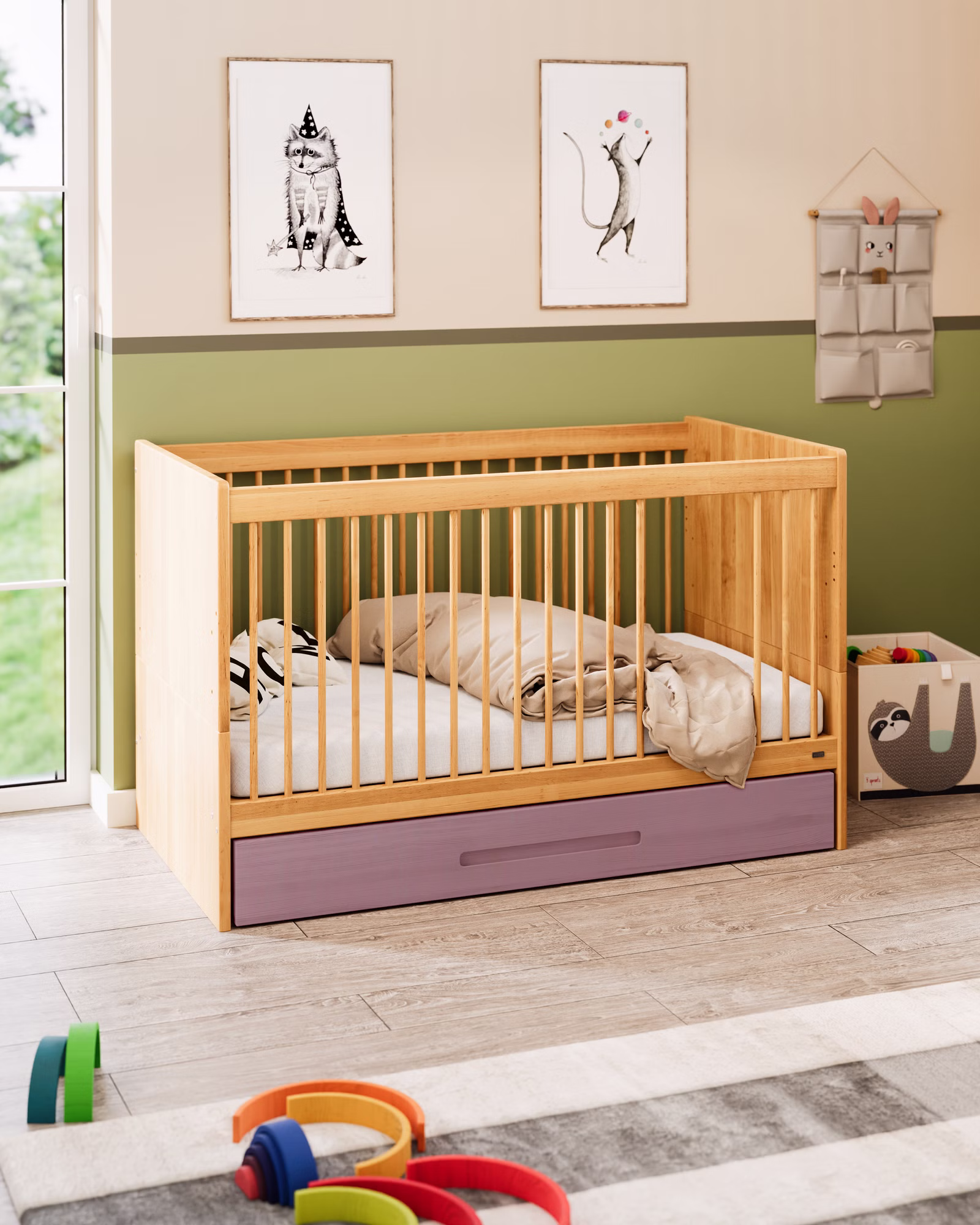Unser formschönes Lina Babybett ist aus biologischem Massivholz gefertigt und fügt sich dank der praktischen Details ideal in jedes Baby- und Kinderzimmer ein.