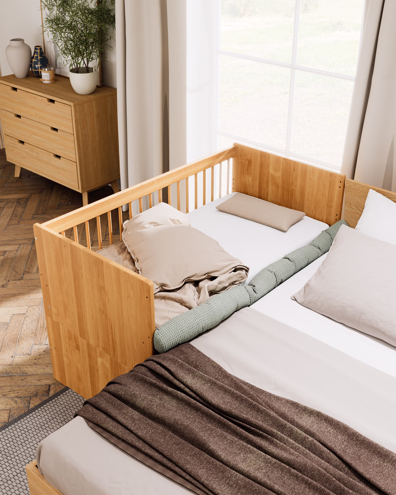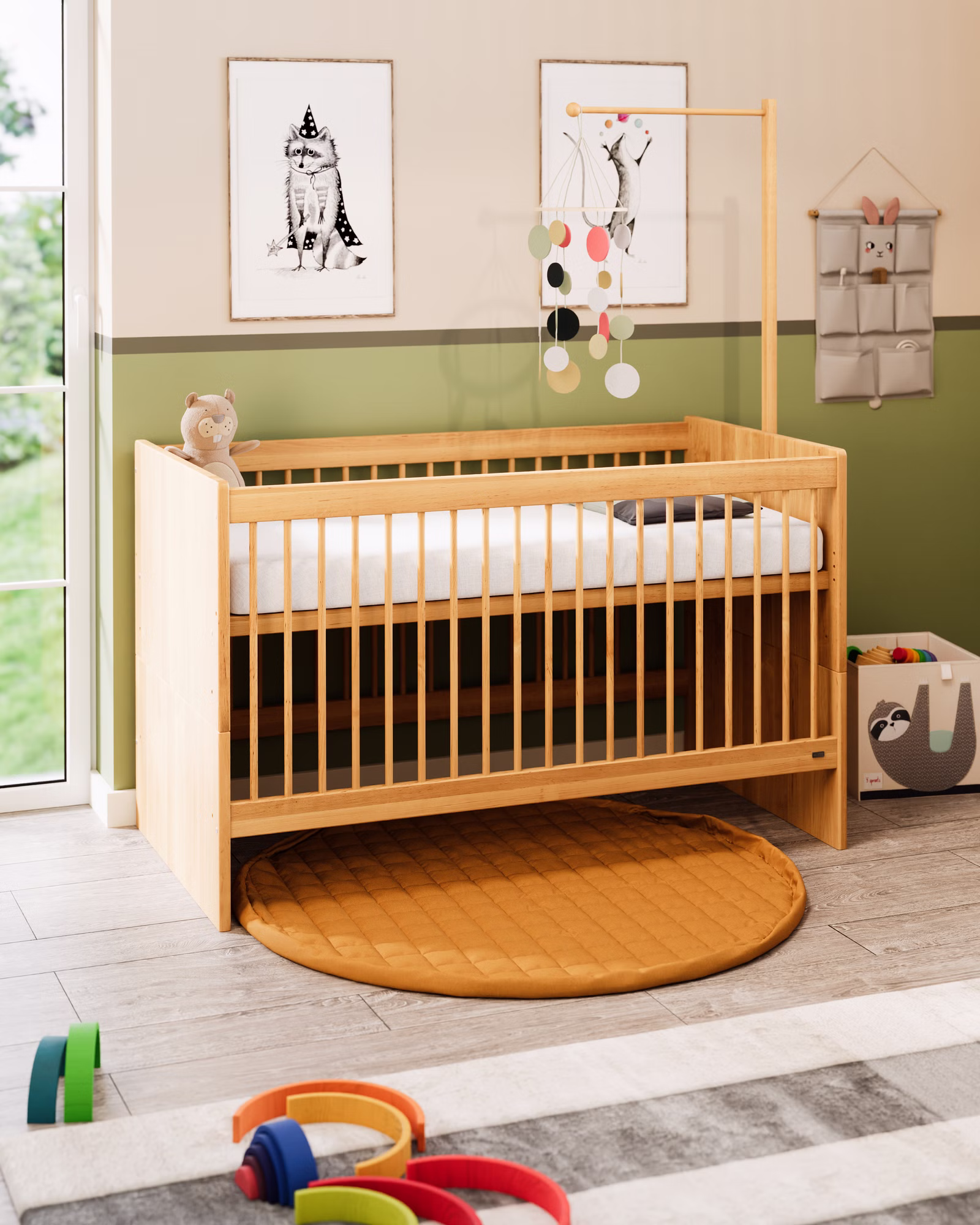 Unser formschönes Lina Babybett ist aus biologischem Massivholz gefertigt und fügt sich dank der praktischen Details ideal in jedes Baby- und Kinderzimmer ein.