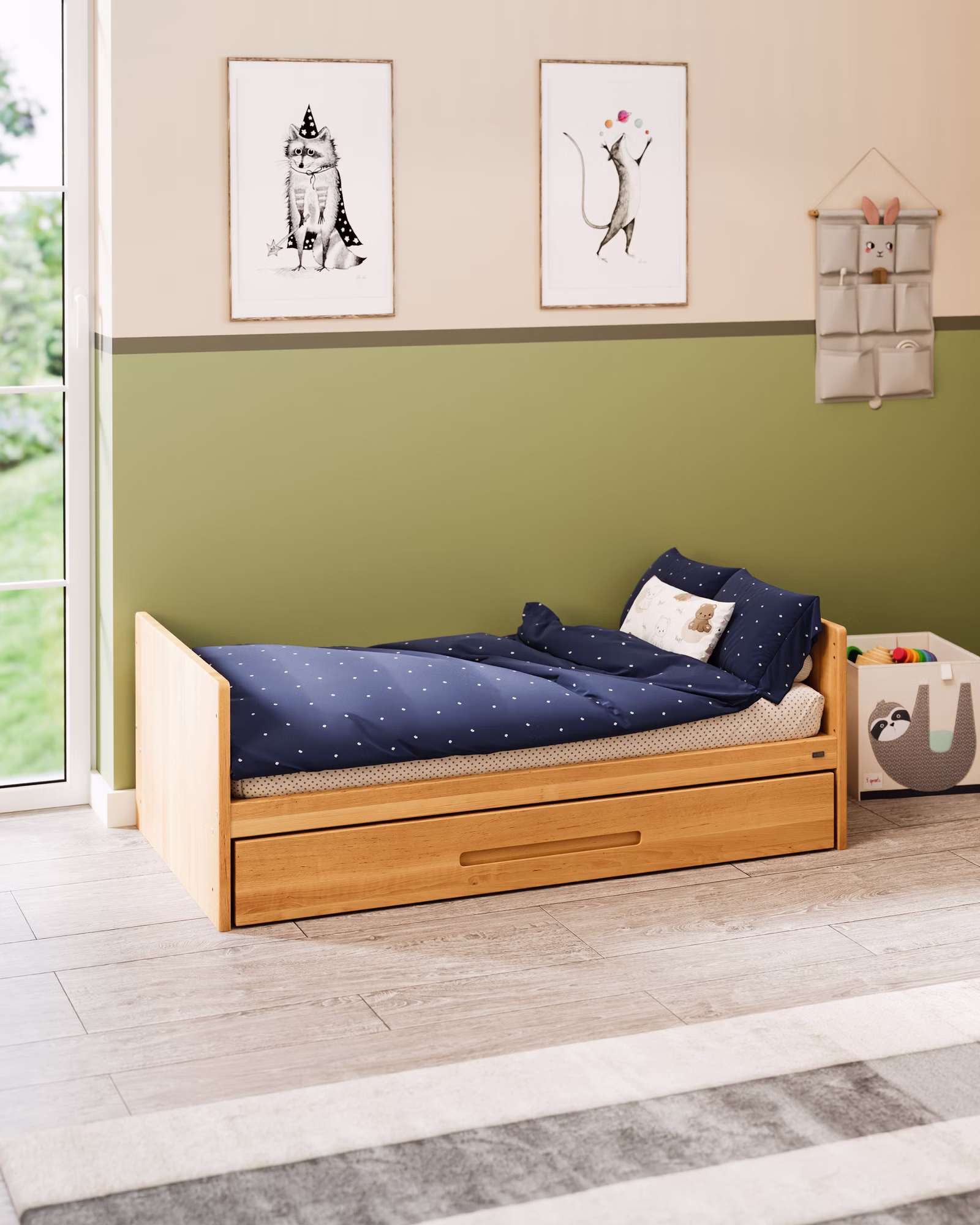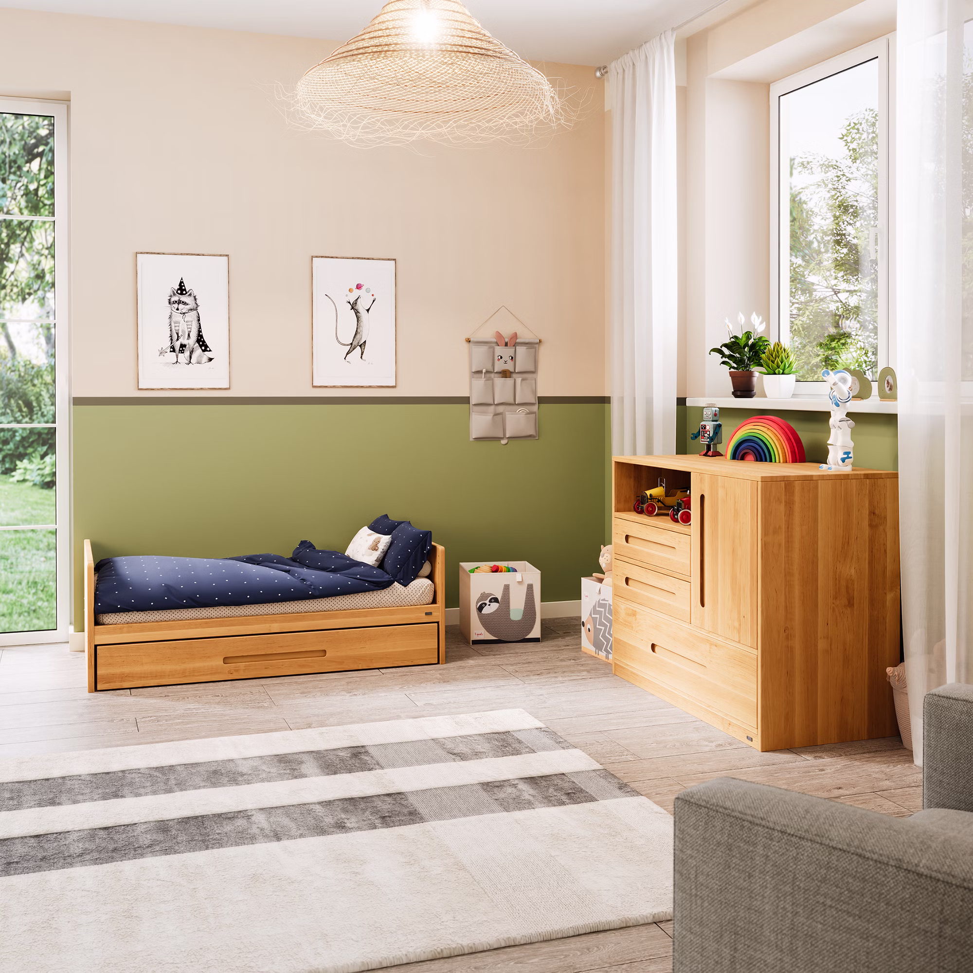 - Umbaumöglichkeit zum vollwertigen Kinderbett dank mitgelieferter Bettseiten. So wächst Lina als nachhaltiges Möbelstück lange mit.