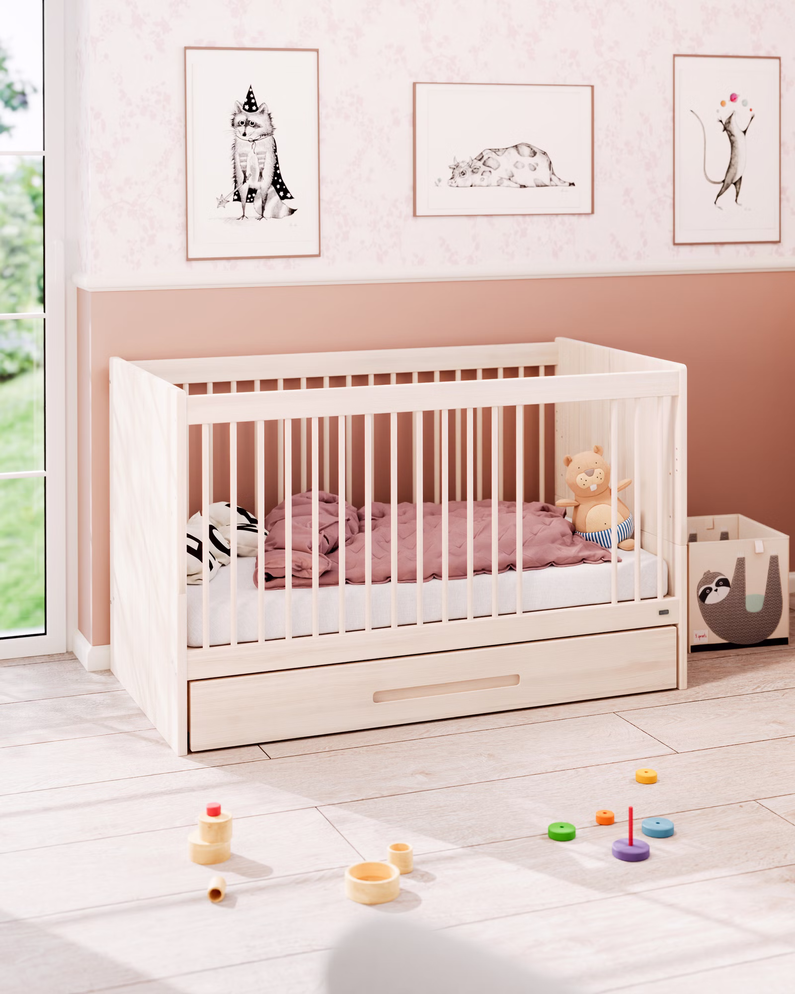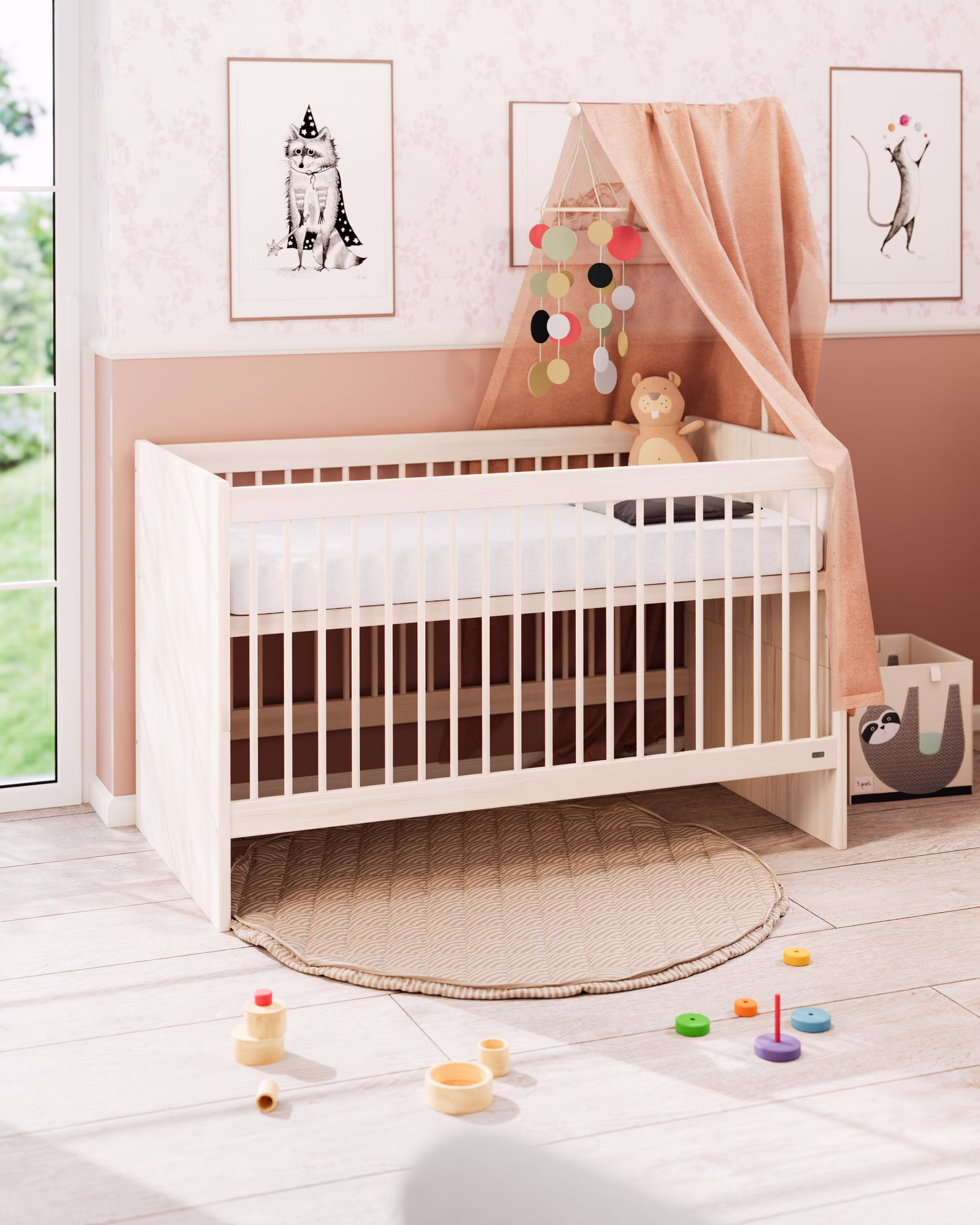 Unser formschönes Lina Babybett ist aus biologischem Massivholz gefertigt und fügt sich dank der praktischen Details ideal in jedes Baby- und Kinderzimmer ein.