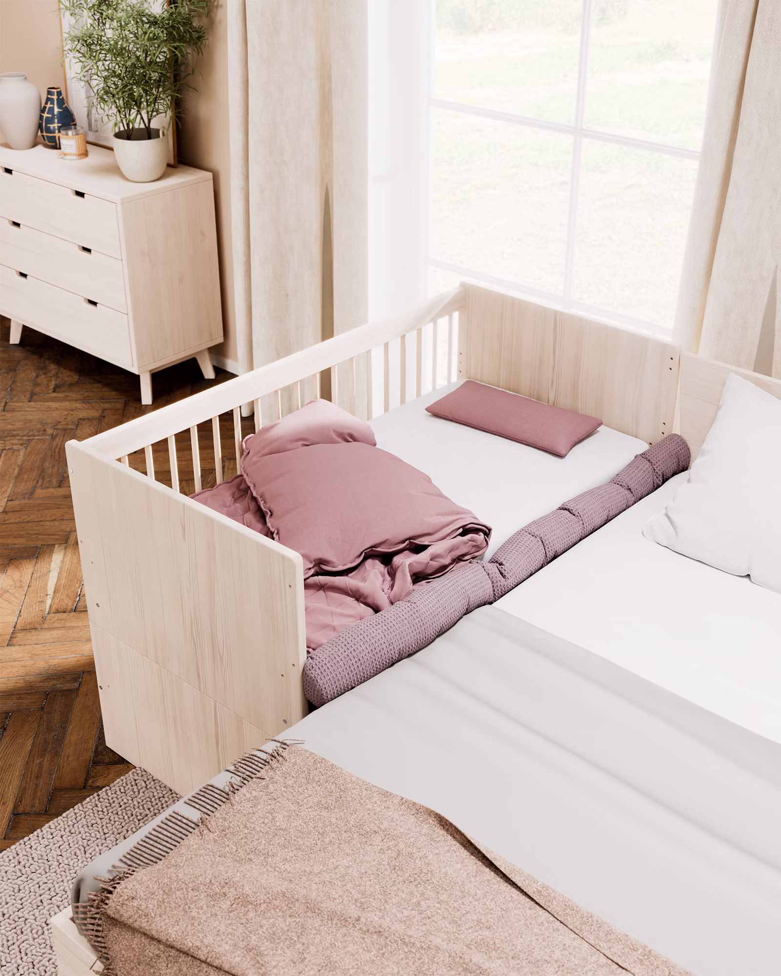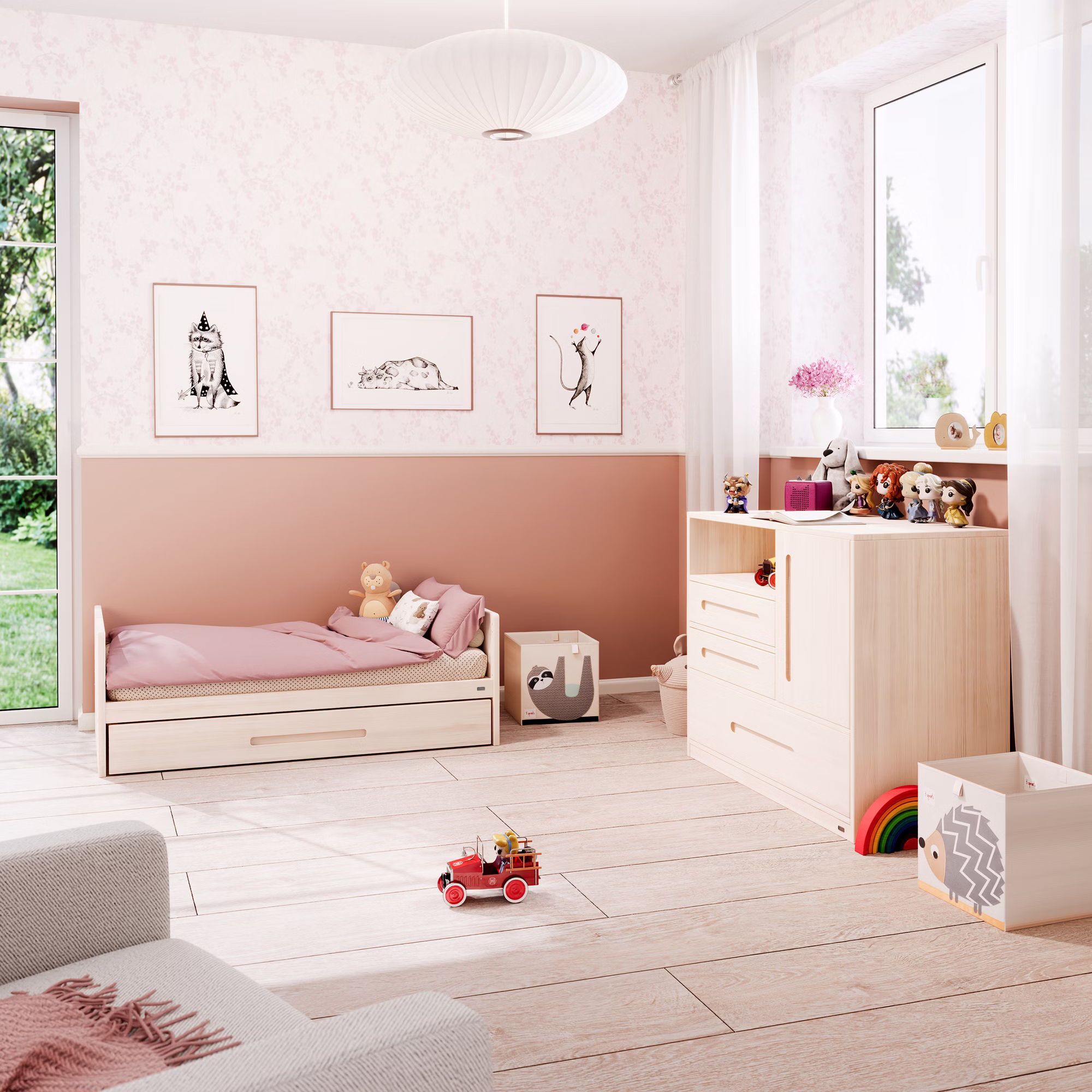 - Umbaumöglichkeit zum vollwertigen Kinderbett dank mitgelieferter Bettseiten. So wächst Lina als nachhaltiges Möbelstück lange mit.