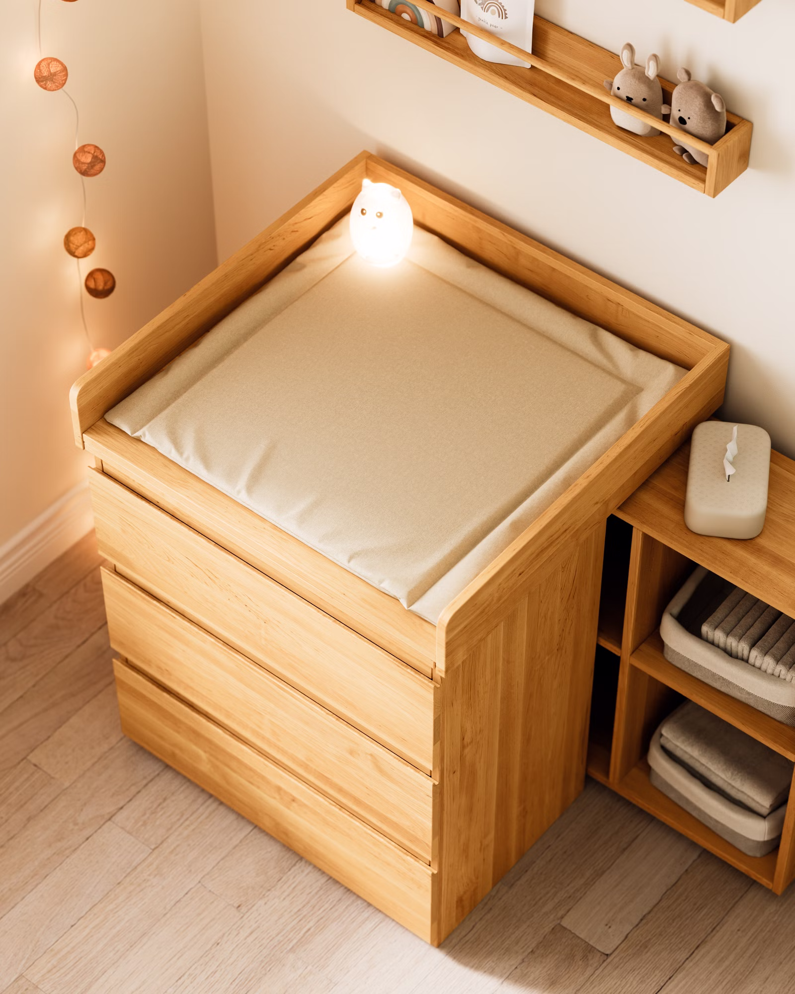 Die Wickelkommode dient zunächst zum Wickeln und kann später mühelos in ein vielseitiges Möbelstück für das Kinderzimmer umgewandelt werden, um Kleidung, Spielzeug und mehr aufzubewahren.