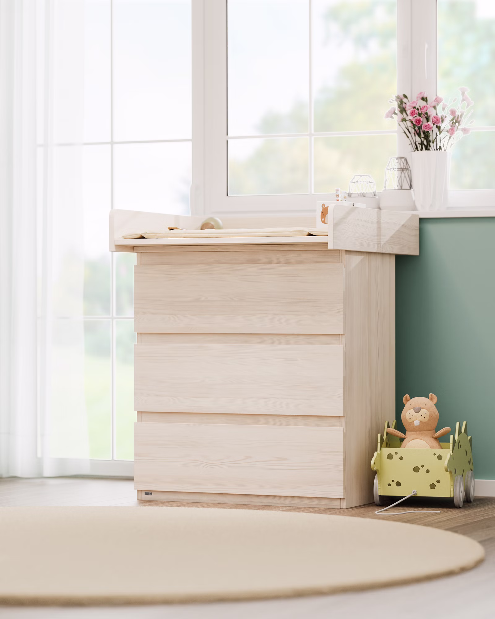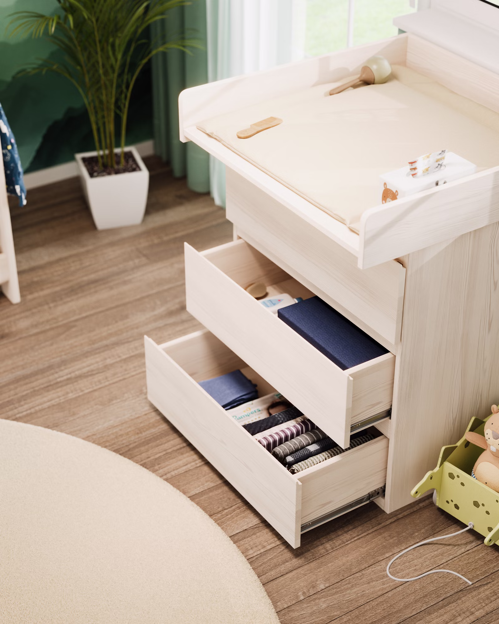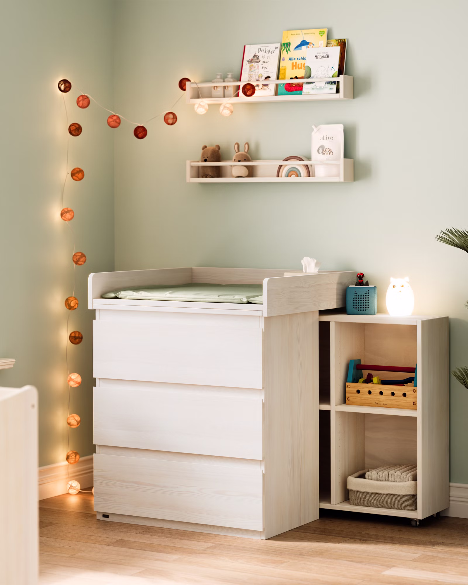 Die Wickelkommode dient zunächst zum Wickeln und kann später mühelos in ein vielseitiges Möbelstück für das Kinderzimmer umgewandelt werden, um Kleidung, Spielzeug und mehr aufzubewahren.