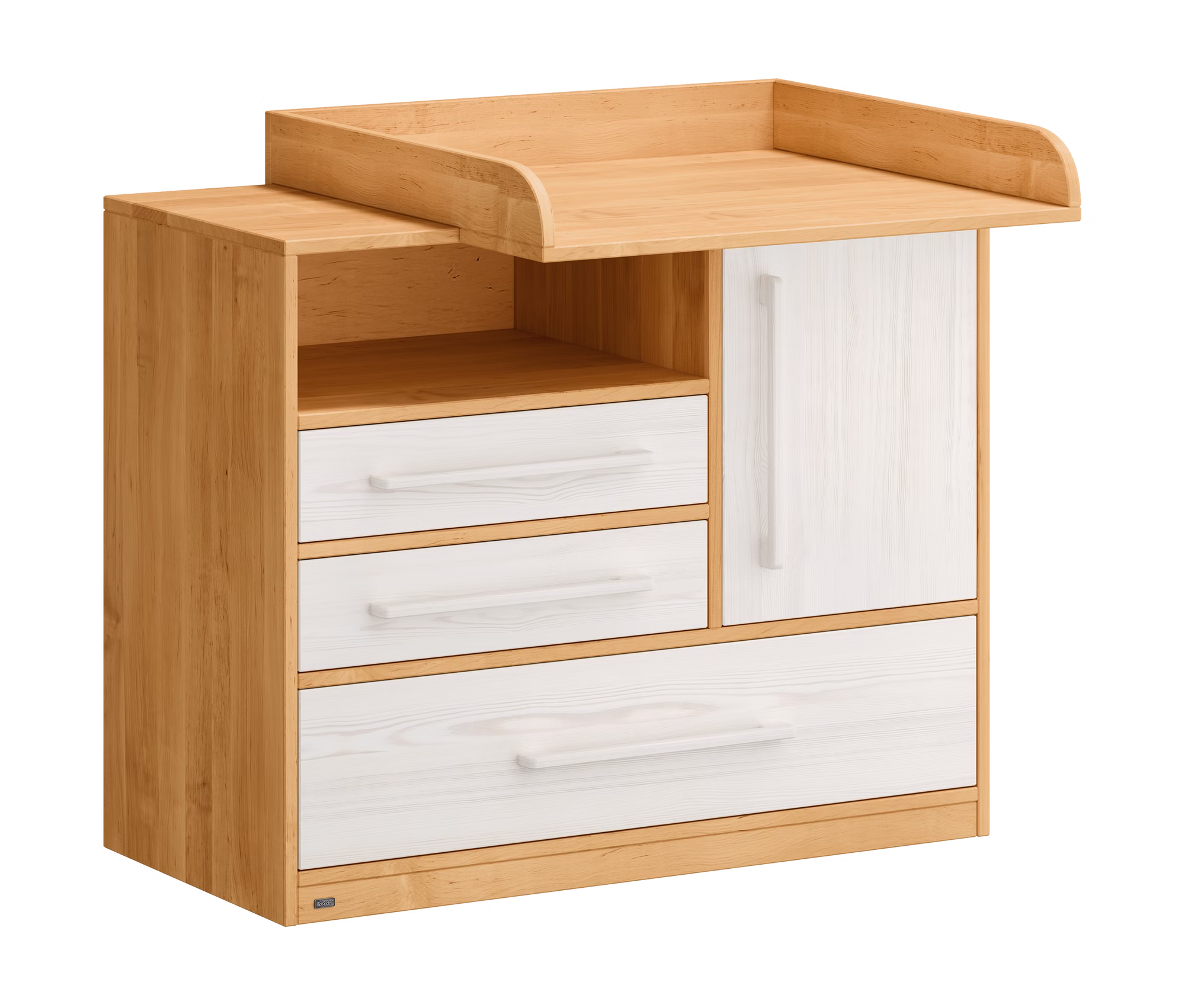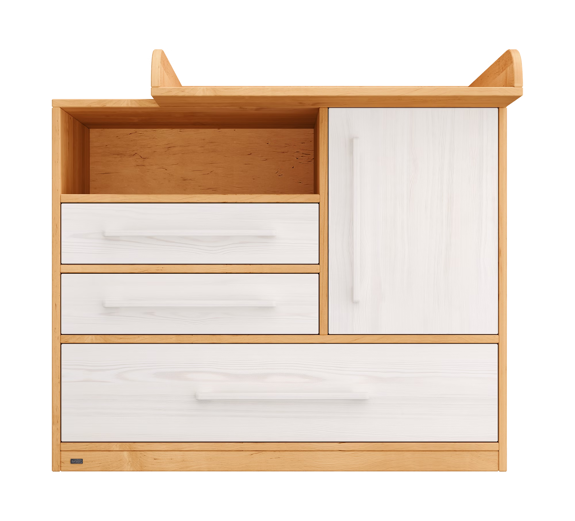Für die Zeit nach dem Wickelalter lässt sich der Wickelaufsatz einfach abnehmen und Henry fügt sich als vollwertiges Möbelstück harmonisch in jede Kinderzimmereinrichtung ein. Die eleganten Griffe und das geometrische Design sorgen dabei für einen zeitlosen Charme.