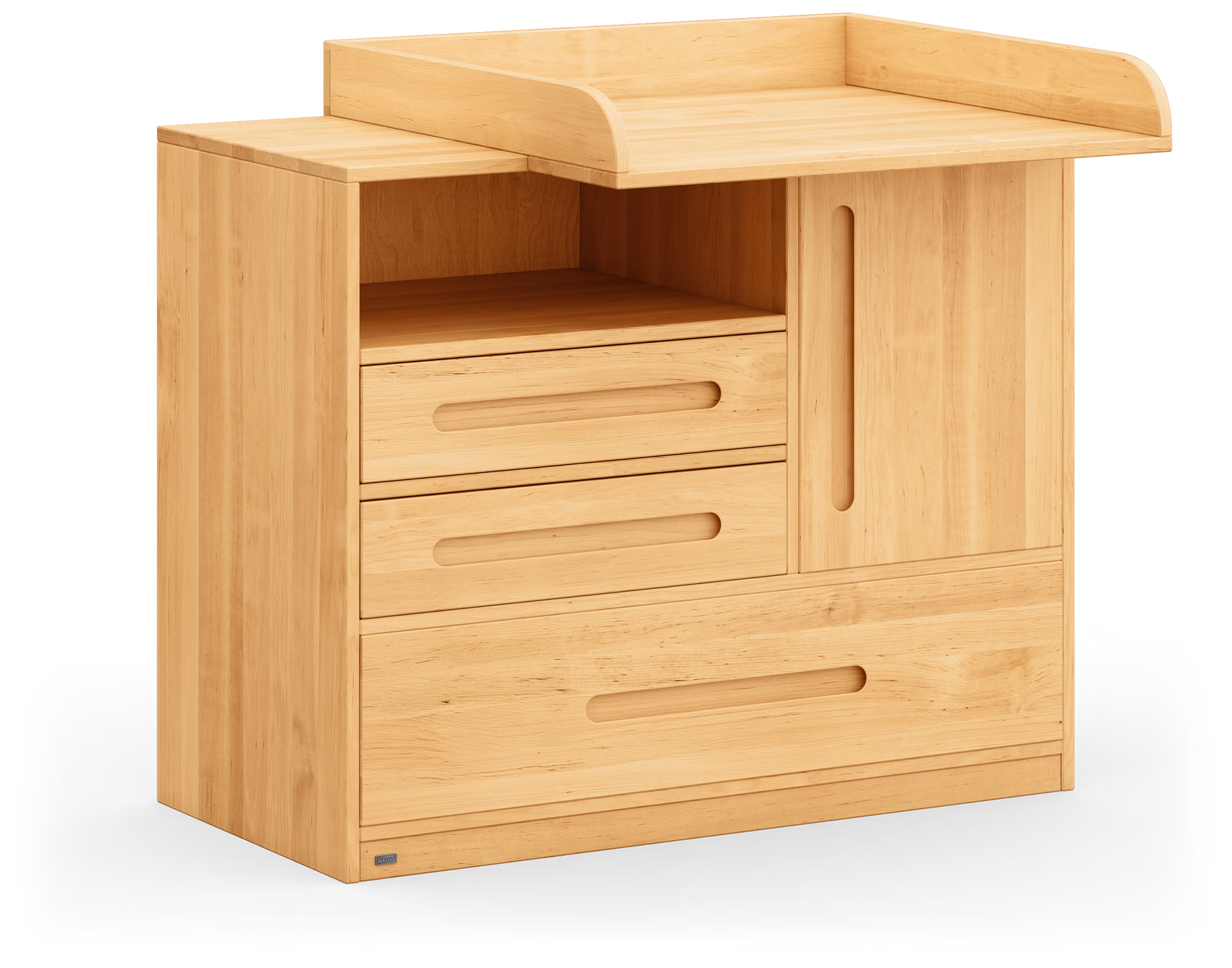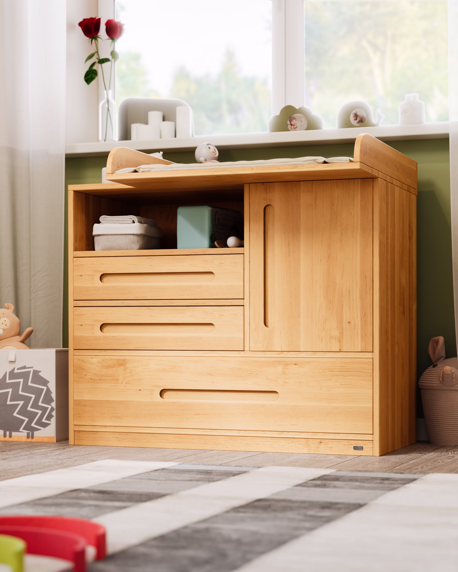 Für die Zeit nach dem Wickelalter lässt sich der Wickelaufsatz einfach abnehmen und Lina fügt sich als vollwertiges Möbelstück harmonisch in jede Kinderzimmereinrichtung ein. Die formschönen gefrästen Griffmulden und das geometrische Design sorgen dabei für einen zeitlosen Charme.