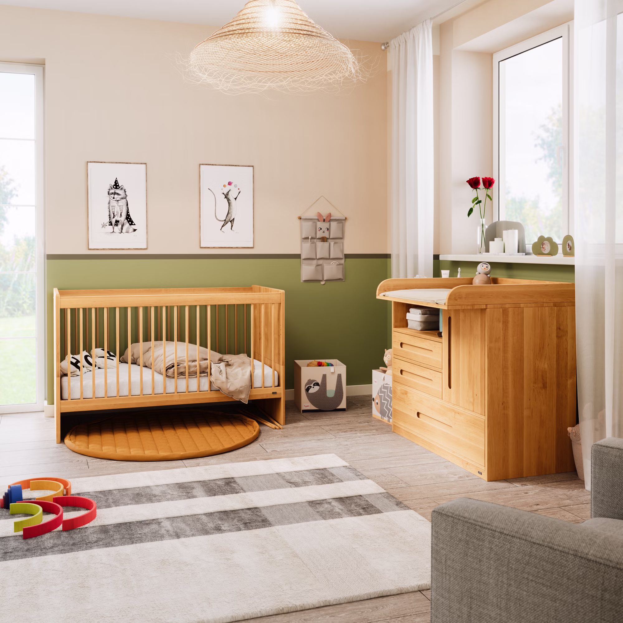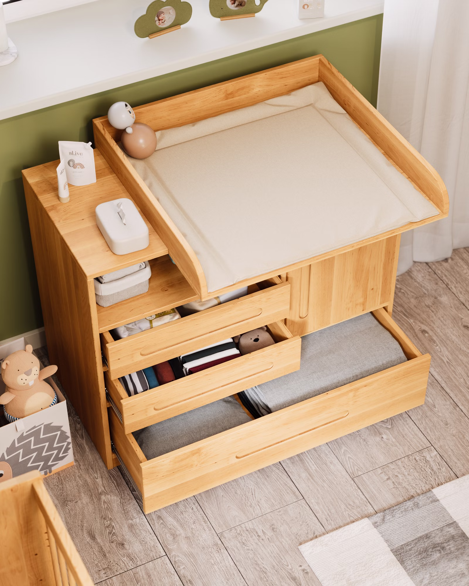 Unsere Lina Wickelkommode ist wandelbar und bietet viel Platz für Wickel- und Pflegeutensilien. Die drei geräumigen Schubladen sind mit kugelgelagerten Leichtlaufschienen mit Selbsteinzug und Soft-Close-Mechanismus für ein sicheres und geräuscharmes Schließen ausgestattet. Zudem lassen sie sich voll ausziehen und bieten so Einblicke bis in den hintersten Bereich der Schublade.