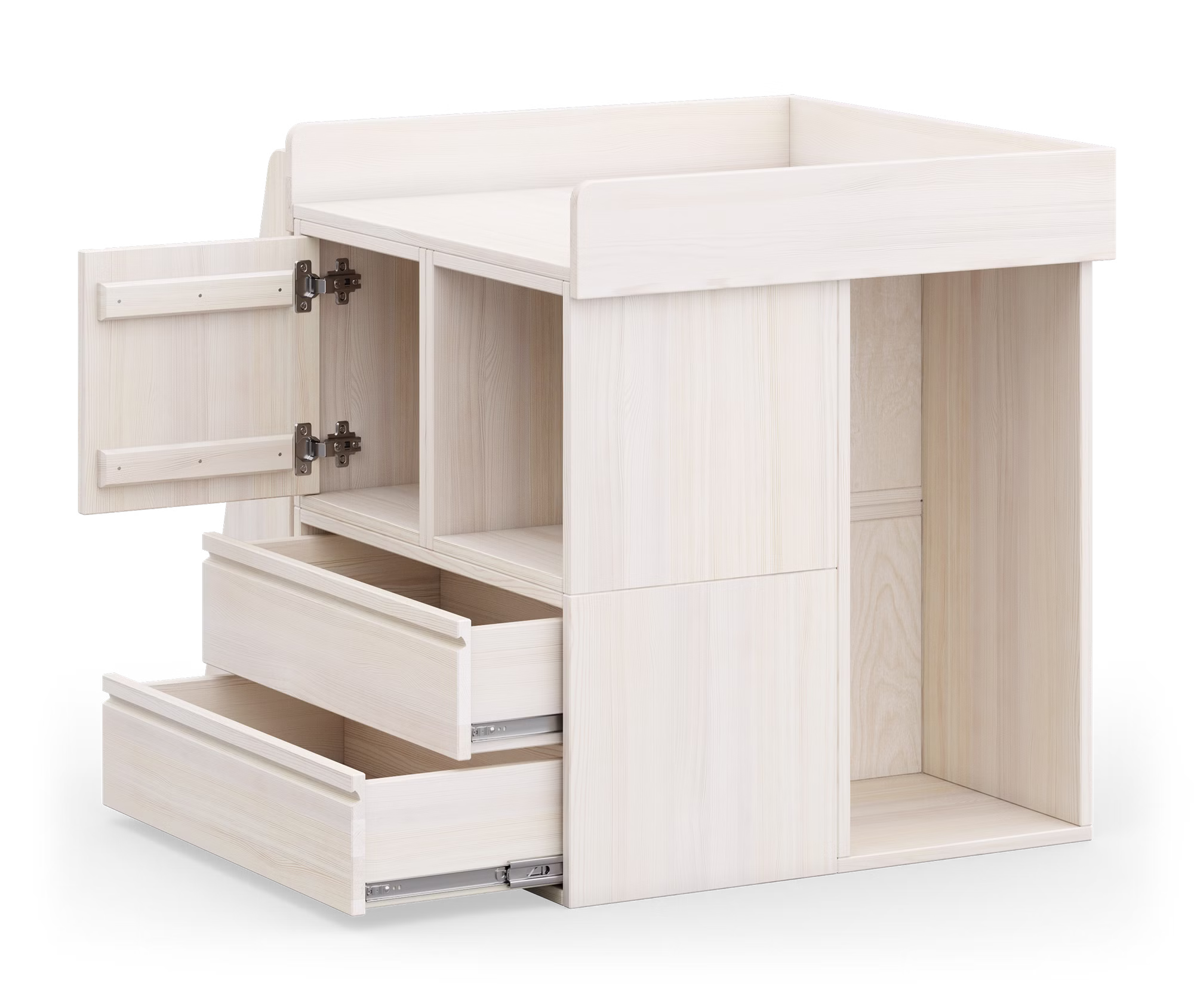 Die acht Laura Elemente dieses praktischen Sets lassen sich zu einem individuellen Wickeltisch zusammenfügen, der immer wieder neu gestaltet werden kann. Der formschöne und ergonomische Wickeltisch ist dabei gleichzeitig rückenschonend und geräumig, sodass sich Wickelutensilien und Kleidung bequem verstauen lassen. Die offenen Regalwürfel bieten zudem einen schnellen und direkten Zugriff auf die wichtigsten Gegenstände. Die elegant gefrästen Griffmulden der Türen und Schubladen ermöglichen ein leichtes Öffnen und Schließen und machen das Set auch optisch zu einem echten Blickfang.