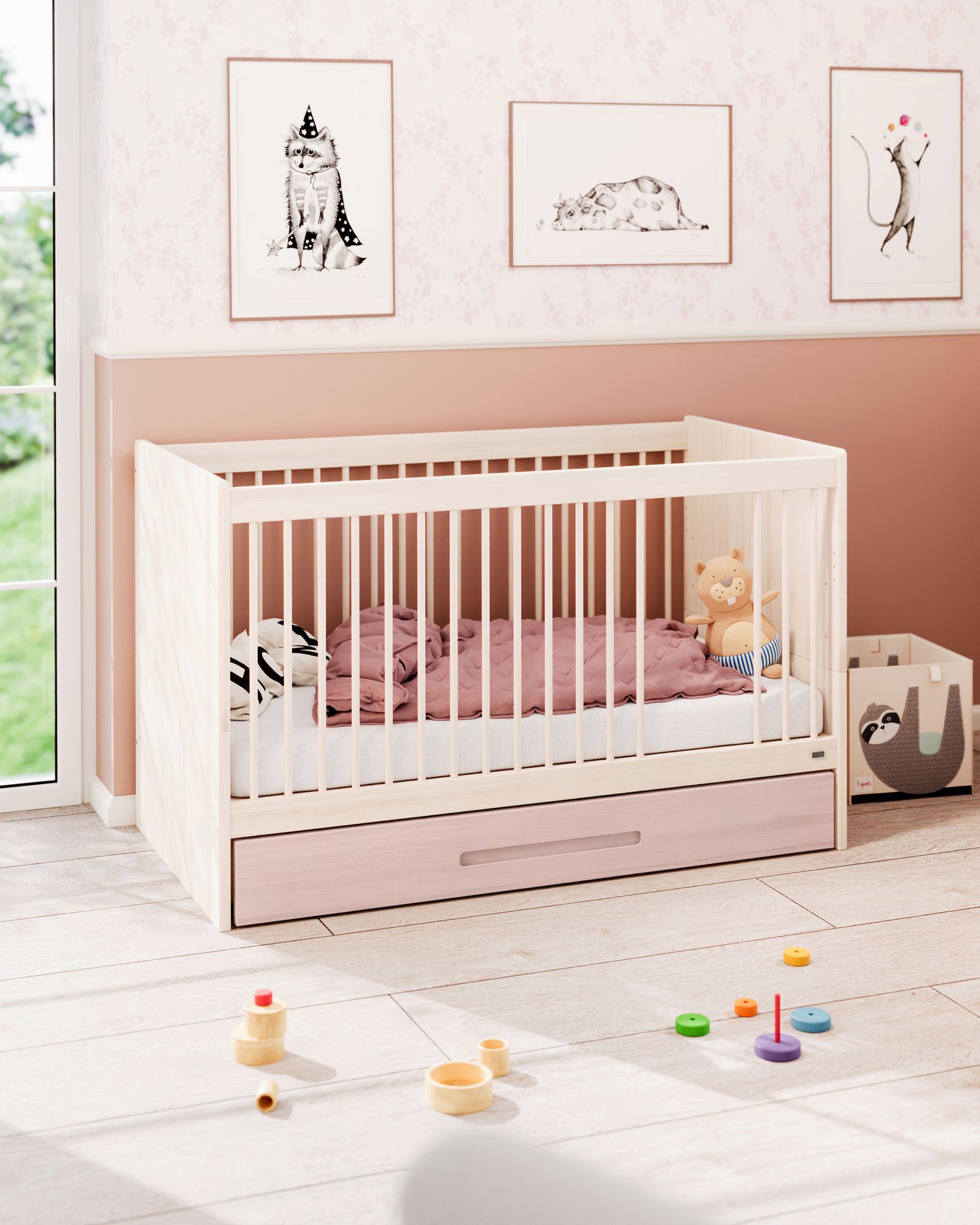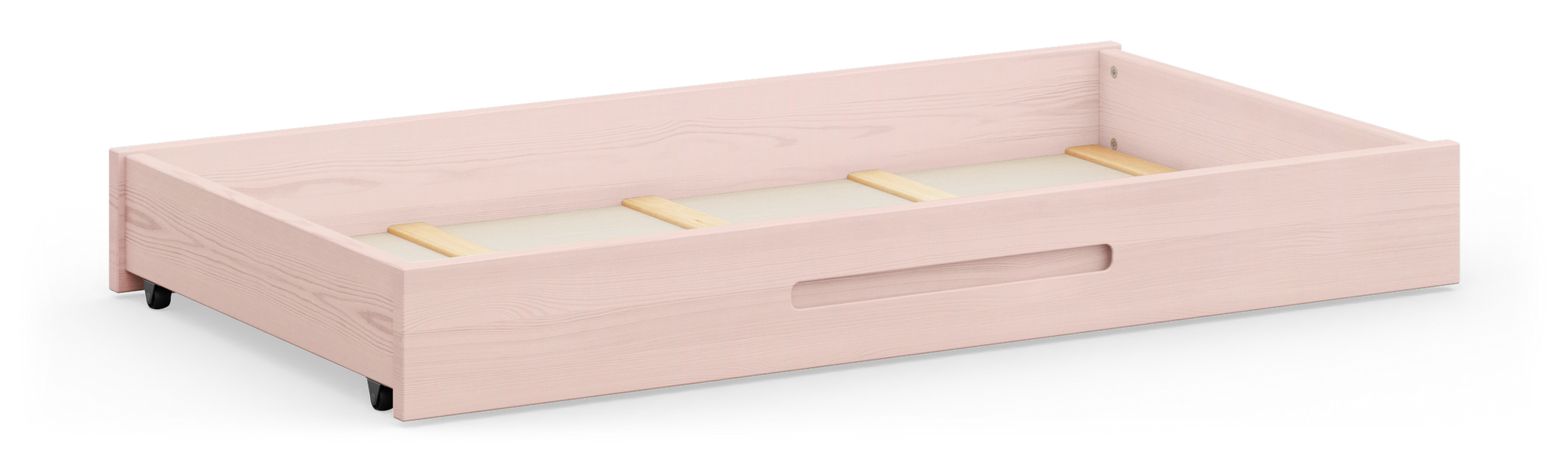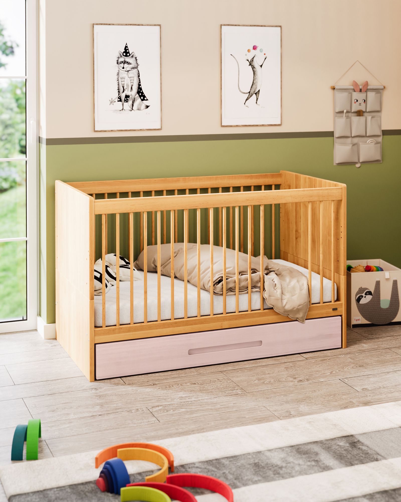 Der Bettkasten aus ökologischem Vollholz schafft zusätzlichen Stauraum unter dem Lina Baby- und Kinderbett und unter allen Betten mit einer Unterhöhe von mindestens 17 cm. Mit Rollen und praktischer Griffmulde zum mühelosen Herausziehen ausgestattet.