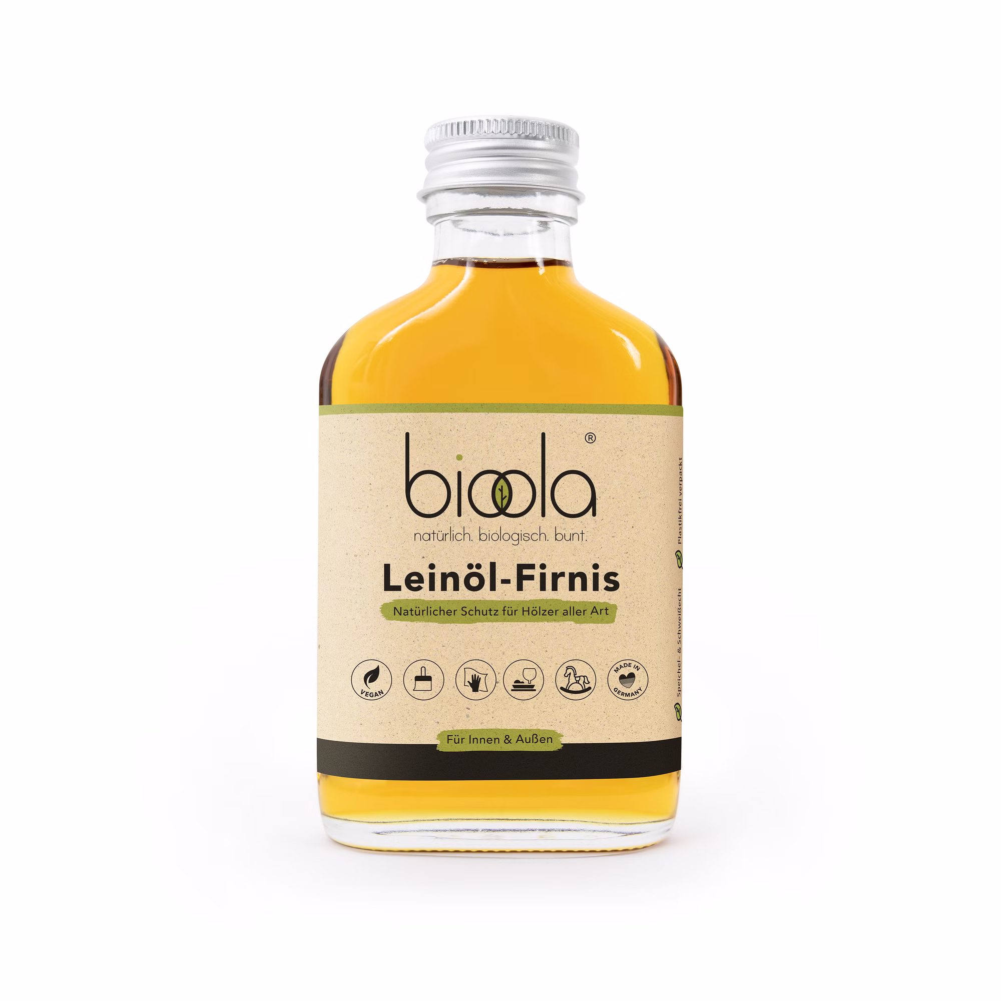 bioola® nature Leinöl-Firnis ist ein natürlicher und biologischer Schutz für Hölzer aller Art sowohl im Innen- als auch im Außenbereich. bioola® nature Leinöl-Firnis wurde vom Institut Fresenius getestet und zertifiziert. Durch die Veredelung mit natürlichem bioola® Öl sind Ihre Möbelstücke speichelecht und gesundheitlich unbedenklich. Die Holzporen bleiben geöffnet, das Holz atmet und filtert die Luft. Außerdem verleiht bioola® Öl Ihren Möbelstücken einen kräftigen und natürlichen Farbton.