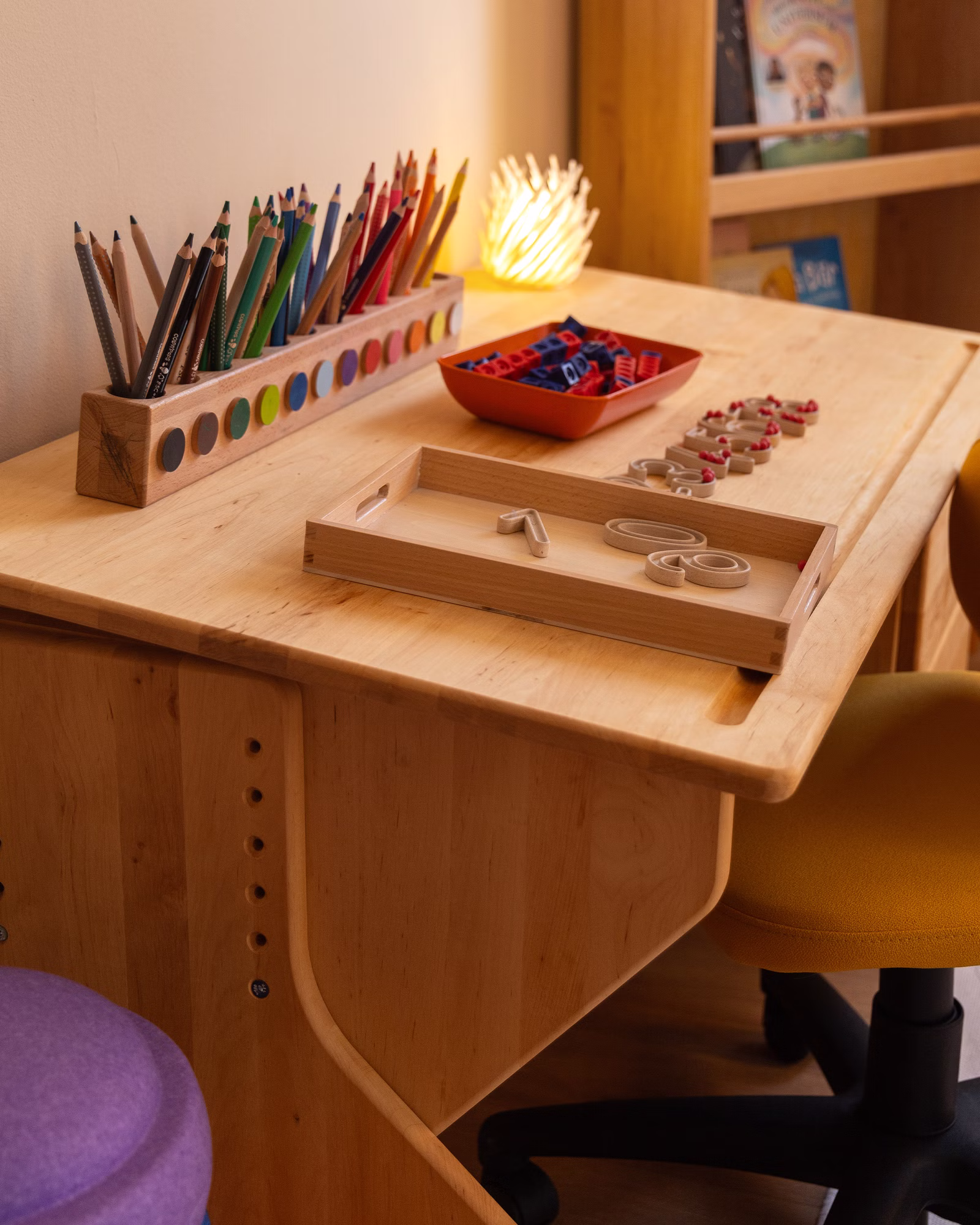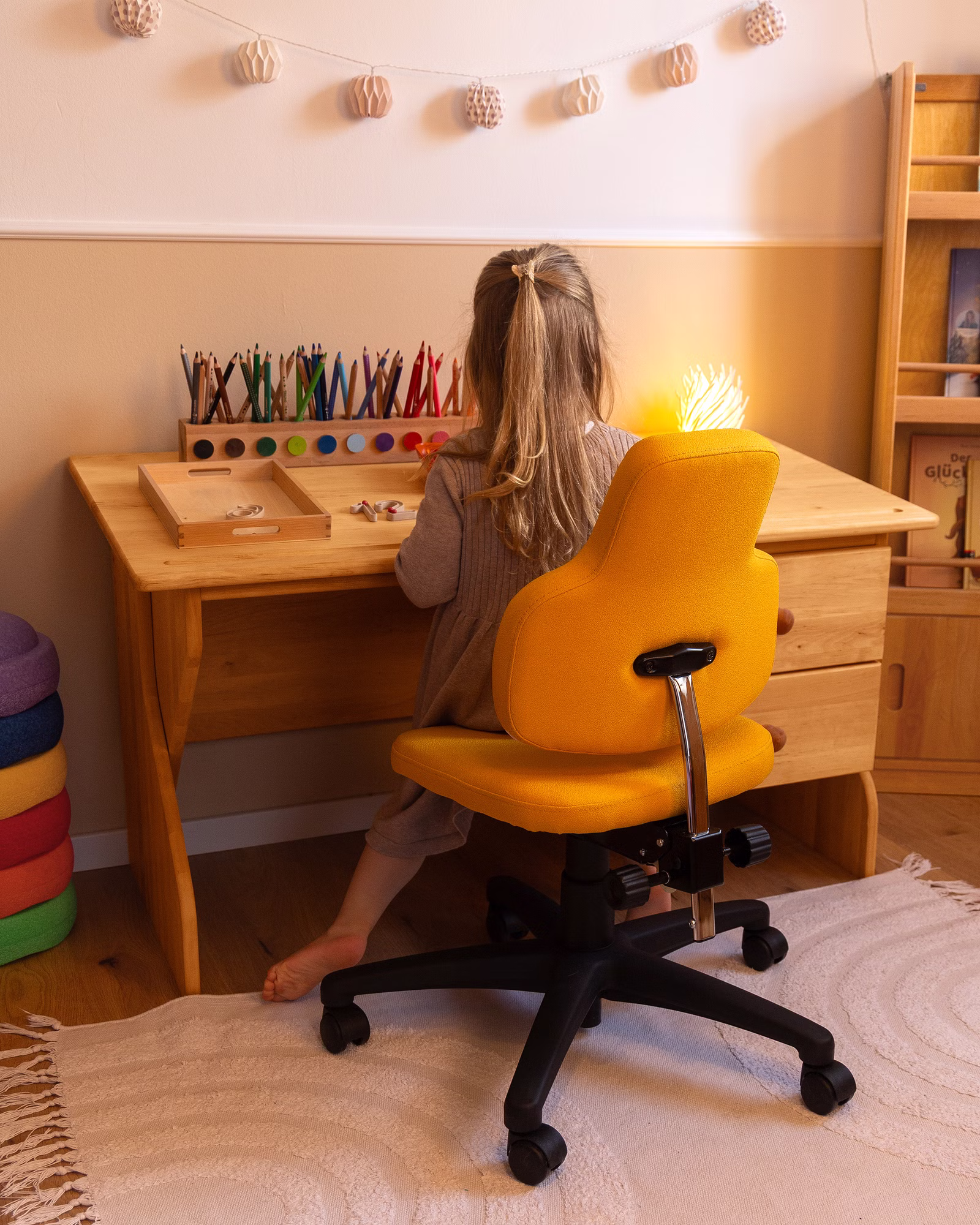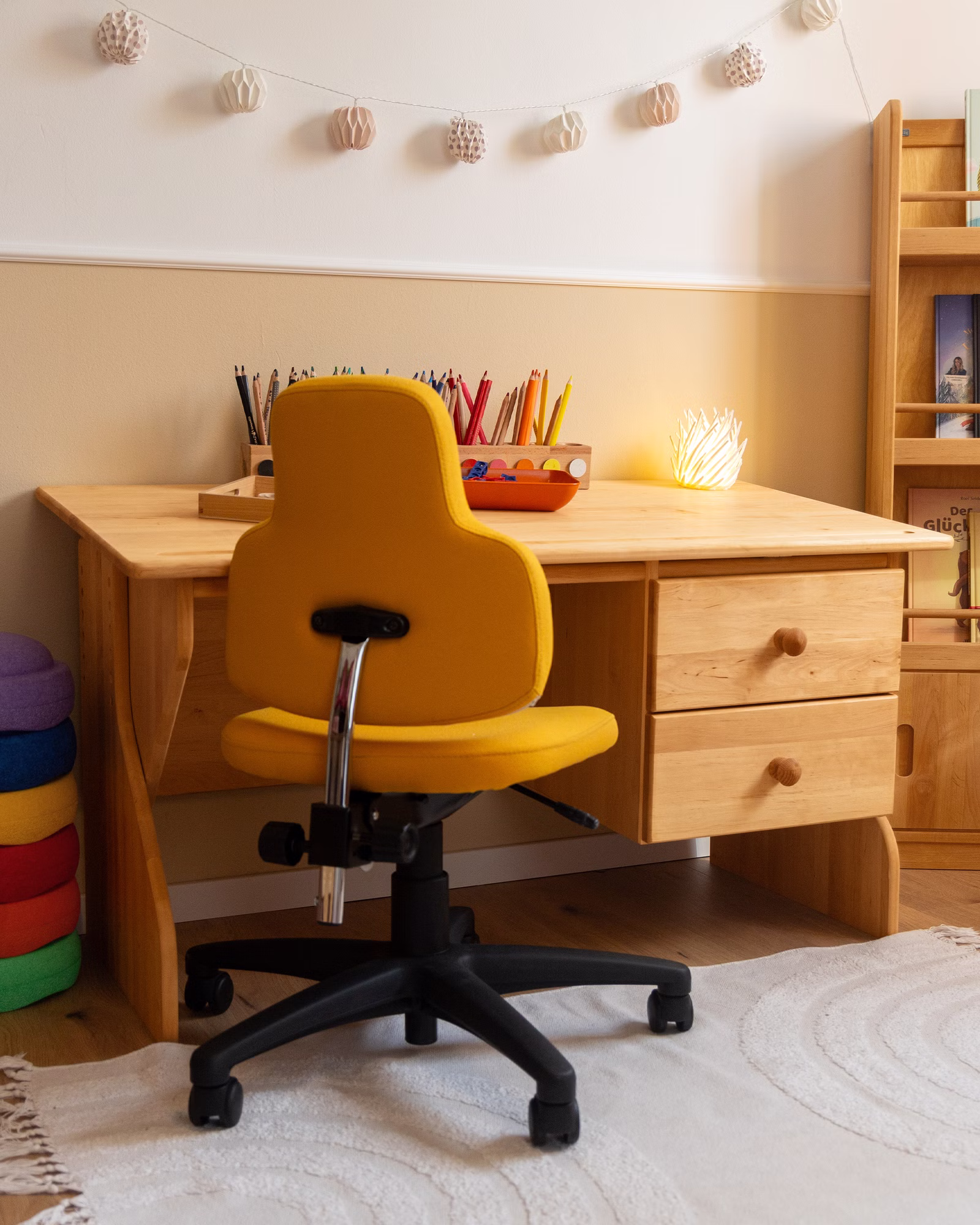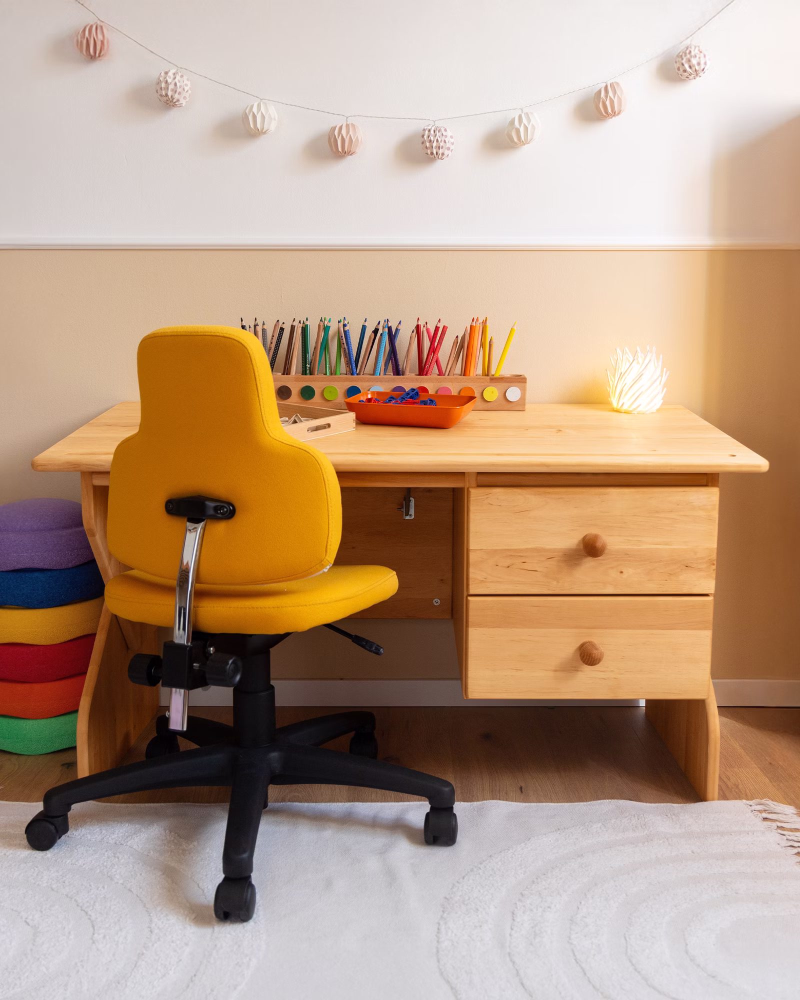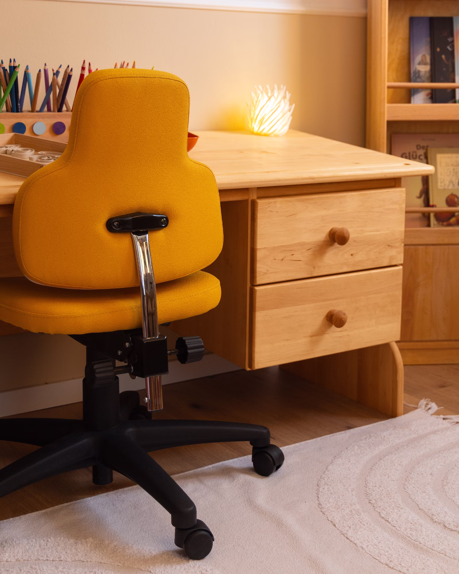Der Schreibtisch ist mit zwei geräumigen Schubkästen auf Leichtlaufschienen ausgerüstet, die ausreichend Platz für Lern- und Bastelsachen bieten. Am unteren Ende der Schreibtischplatte ist eine eingefräste, flache Rille, in der Stifte und Pinsel sicher Halt finden und so auch bei schräg gestellter Platte nicht vom Tisch rollen.