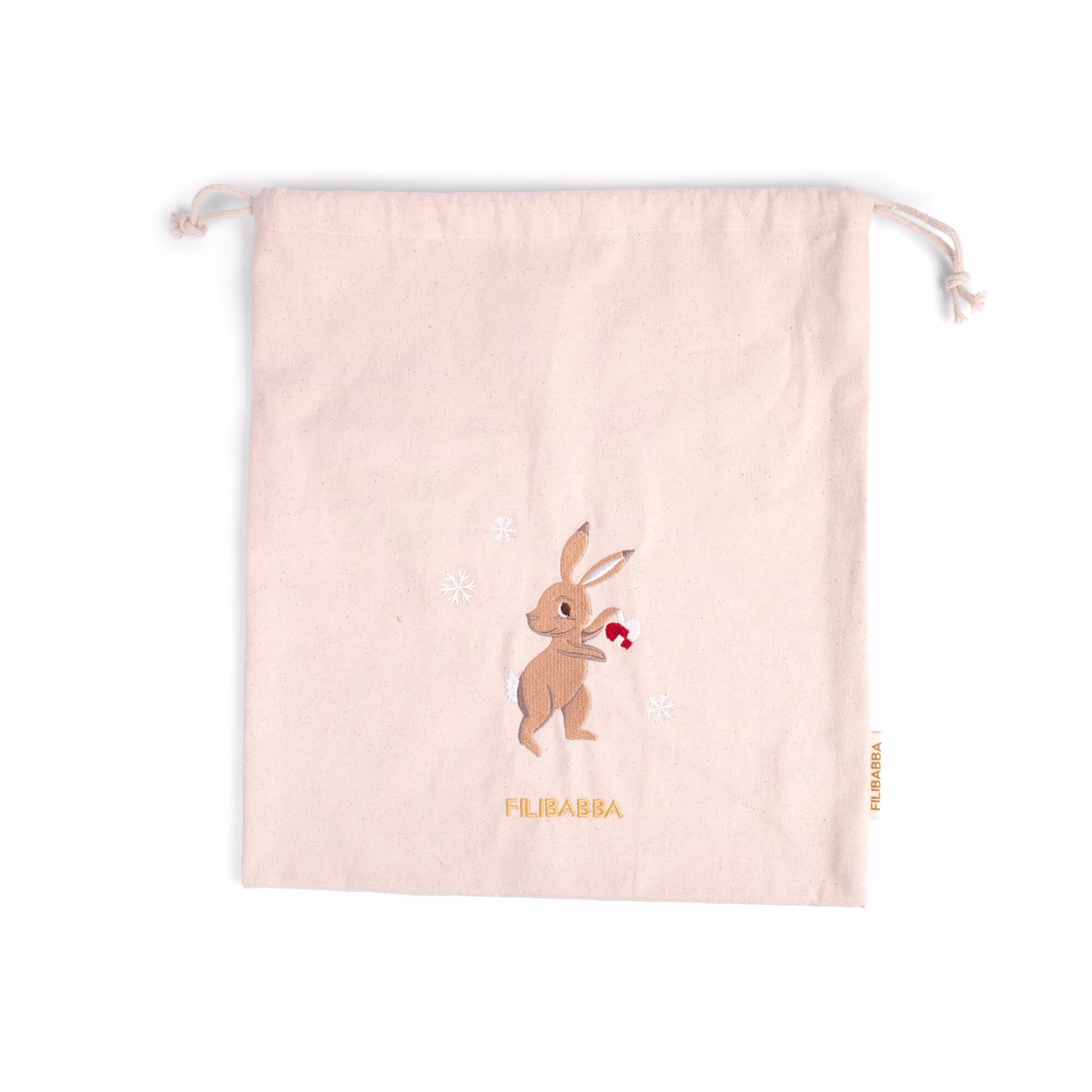 Dank des praktischen Kordelzugverschlusses an der Oberseite lässt sich der Beutel leicht öffnen und schließen, sodass selbst die kleinsten Elfen ihre Geschenke wunderschön verpacken können. Das süße Wintermotiv mit dem kleinen Hasen, das im Schnee tanzt, bringt Freude und verbreitet eine magische Winterstimmung in der ganzen Familie.
