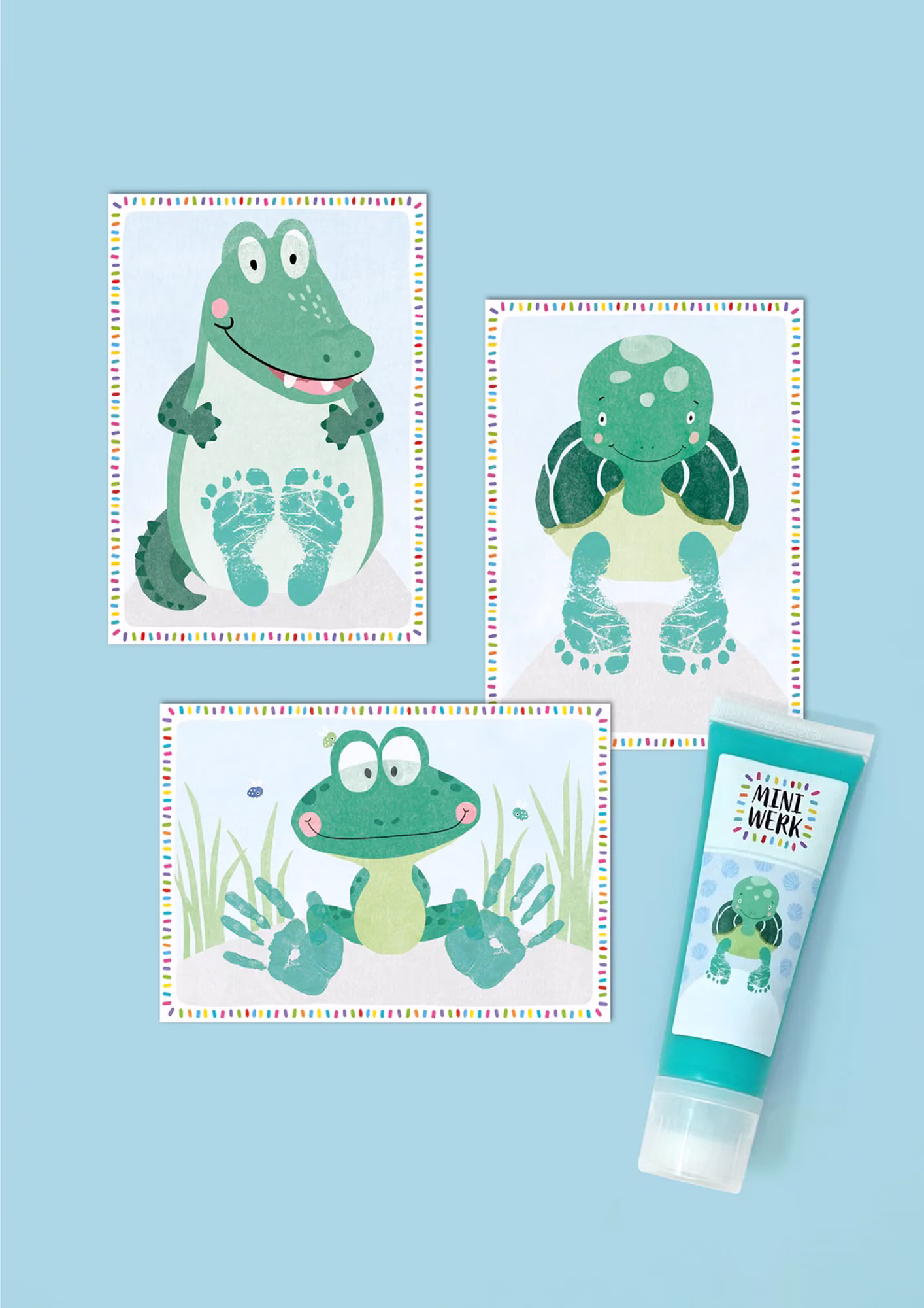 Das 3er Abdruckset, bestehend aus 3 Malfarben (blau, grün und weiß), (rosa, orange und weiß) Schwammaufsätzen und vielen passenden Tier-Motivkarten, bieten euch nicht nur die Möglichkeit Abdrücke zu gestalten, sondern auch jede Menge Mal-und Stempelspaß sowie freie Gestaltungsmöglichkeiten. Der Schwammaufsatz ermöglicht einfaches und gleichmäßiges Auftragen , um damit schöne Hand-, Fuß- und Fingerabdrücke zu kreieren oder freie Experimente, wie direktes Malen und Tupfen aus der Tube. Die beiliegenden Tiermotiv-Karten können dabei, je nach Motiv, mit Hand-, Fuß- oder Fingerabdrücken ergänzt werden und zu wunderschönen Erinnerungen ausgearbeitet werden.
