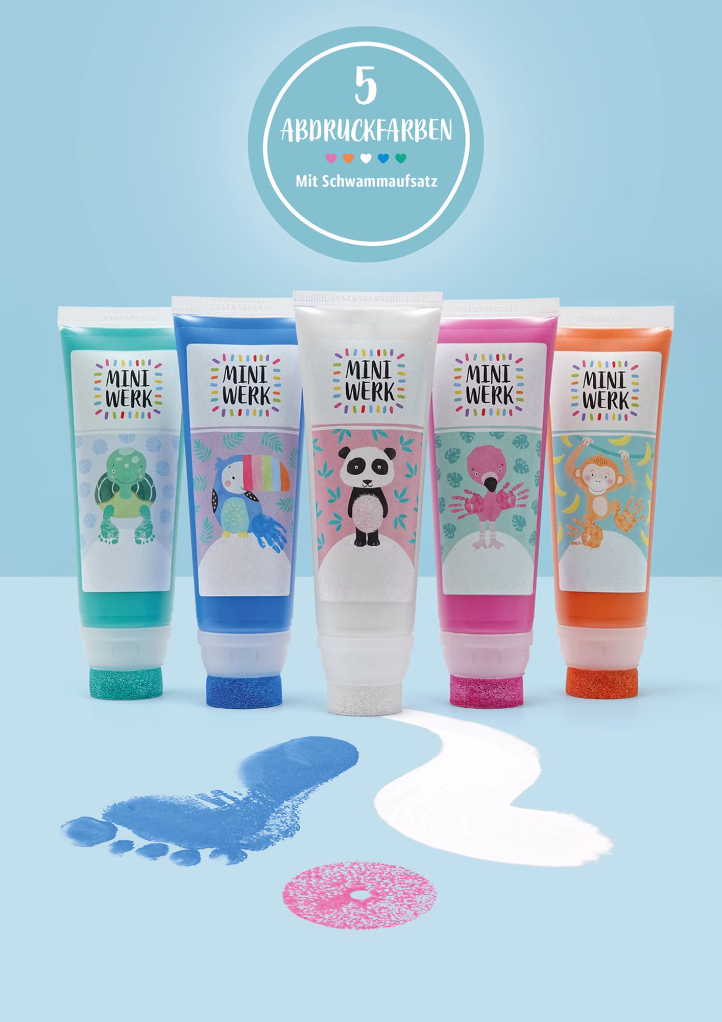 Im großen 5er Set sind die Farben rosa, orange, blau, grün und weiß mit Schwammaufsätzen und 5 doppelseitigen Kreativkarten zum freien Gestalten enthalten. Als Malfarben oder als Stempelfarben zum freien Experimentieren sind der Kreativität keine Grenzen gesetzt! Der Schwammaufsatz ermöglicht gleichmäßiges und einfaches Auftragen der Farbe, um damit wunderschöne Hand- und Fußabdrücke zu gestalten. Oder auch andere Techniken auszuprobieren, wie Tupfen, Stempeln oder direktes Malen aus der Tube. Die Farben sind sicher und bieten jede Menge Spaß und Action.