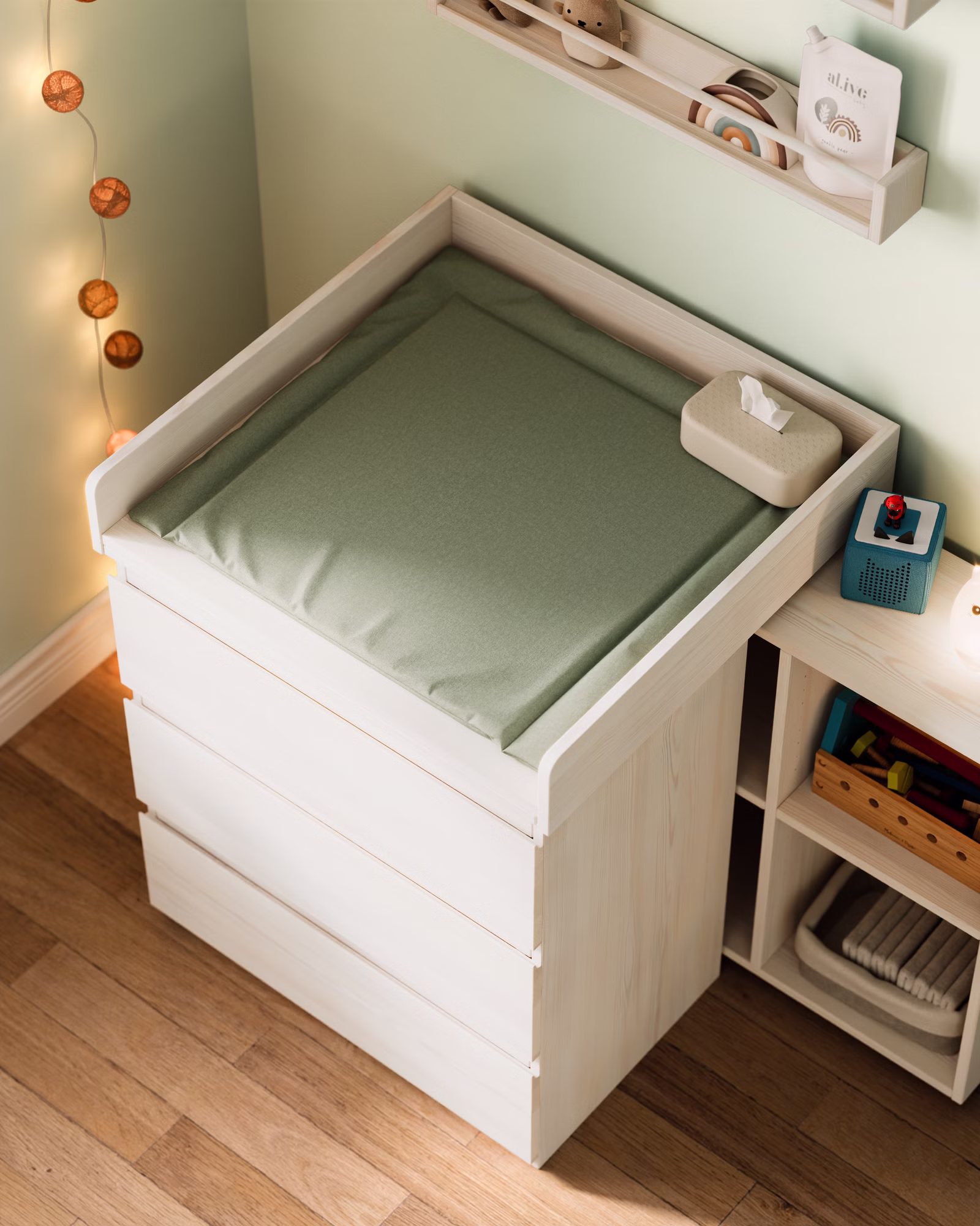 • Wickelaufsatz Finn: Sicherheit und Geborgenheit für Ihr Baby. Für Kommoden bis 80 cm Breite und 50 cm Tiefe. Nach der Wickelzeit einfach abnehmbar.