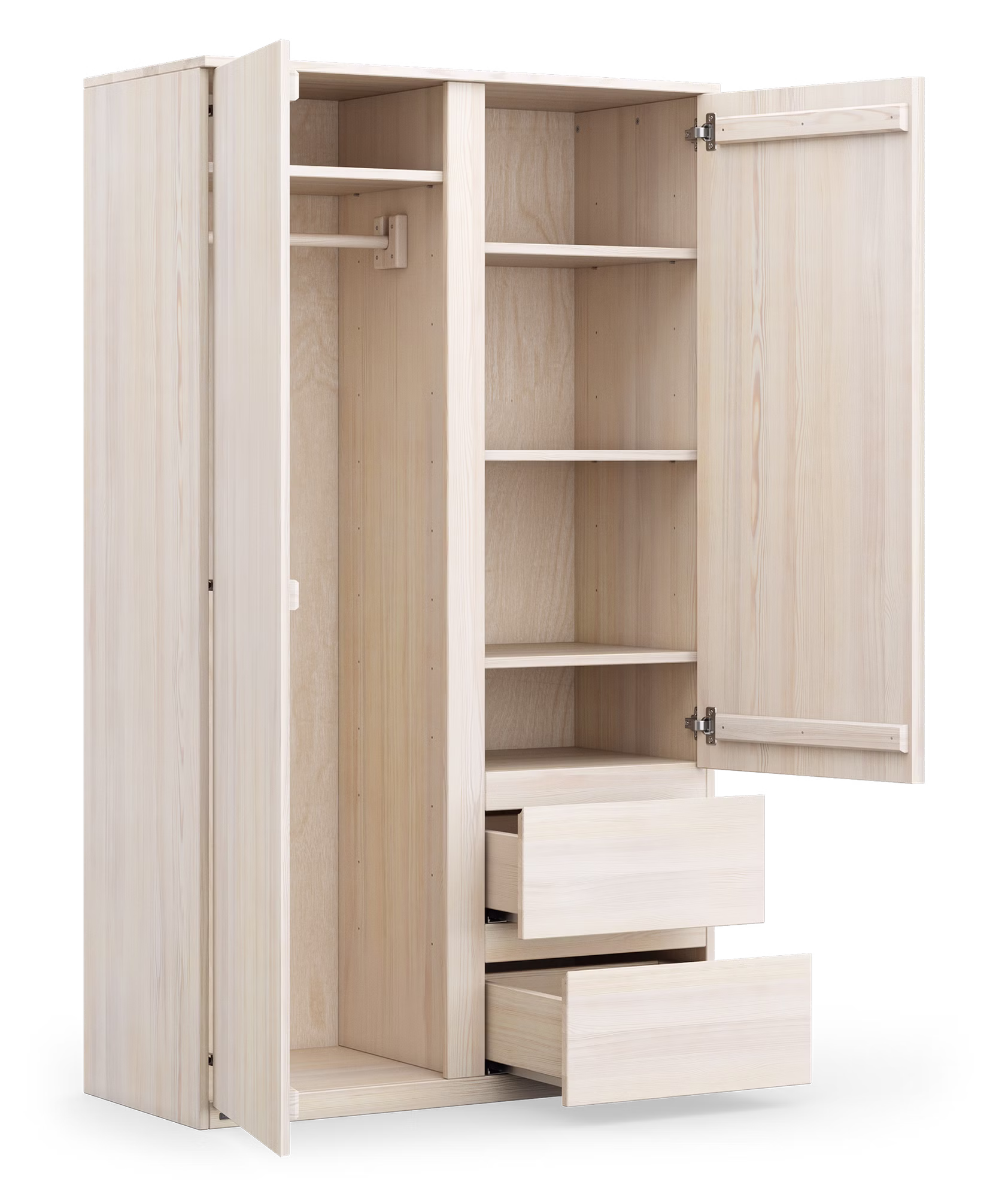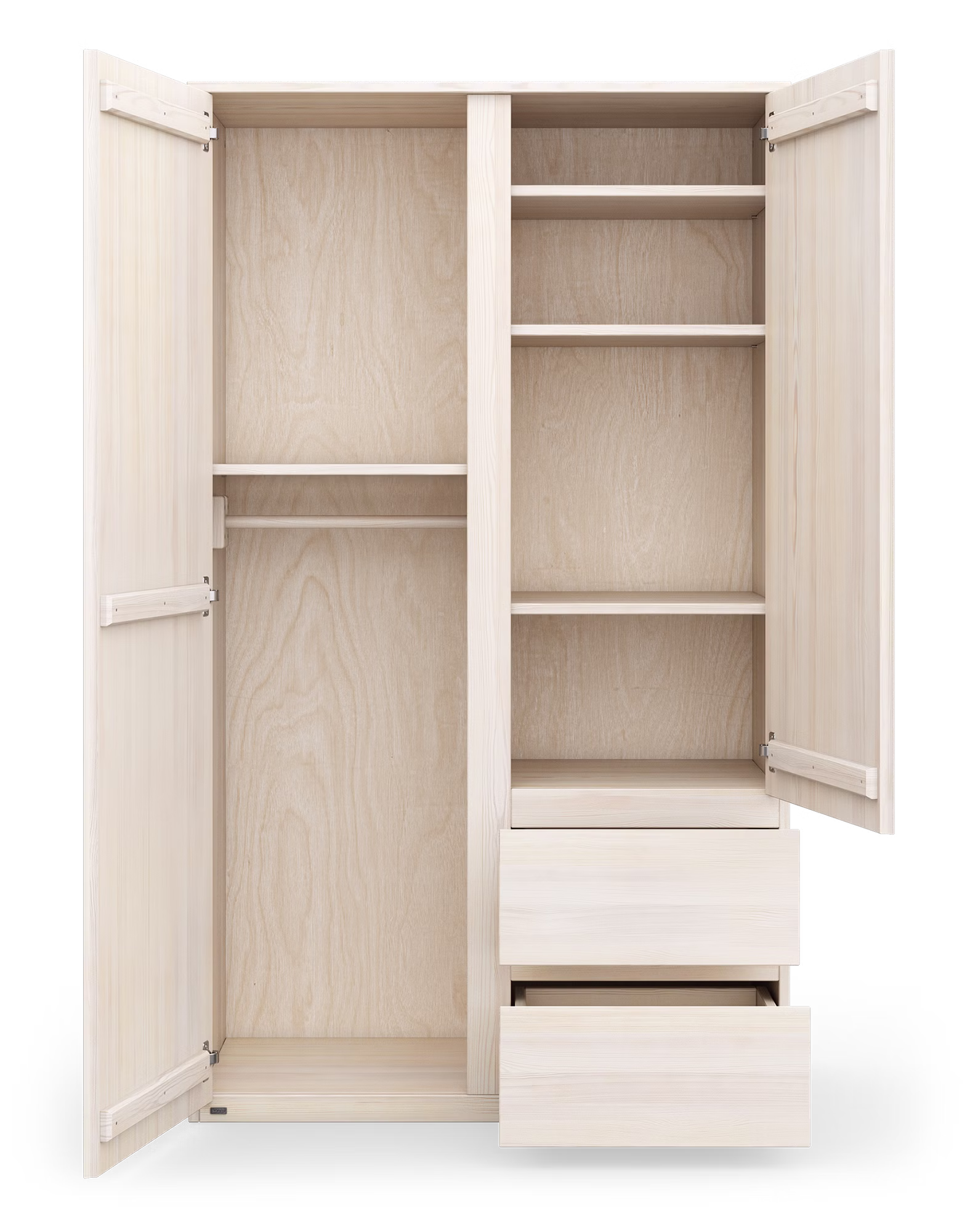 • Zweiteiliger Kleiderschrank Finn: inkl. einer verstellbaren Kleiderstange und vier flexiblen Einlegeböden (weitere Einlegeböden sind erhältlich), 2 Türen + 2 Schubladen mit Vollauszug, großzügiges Innenleben