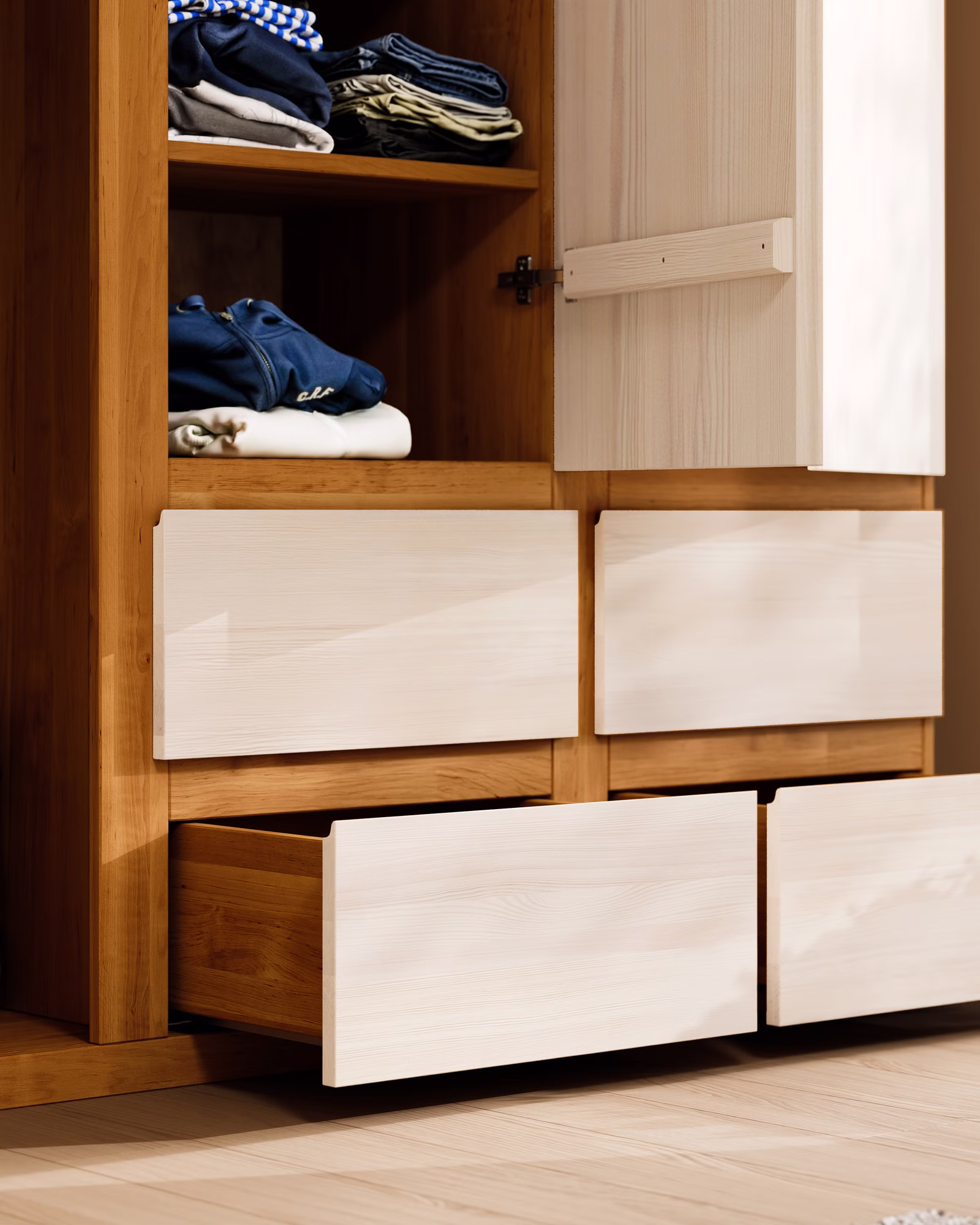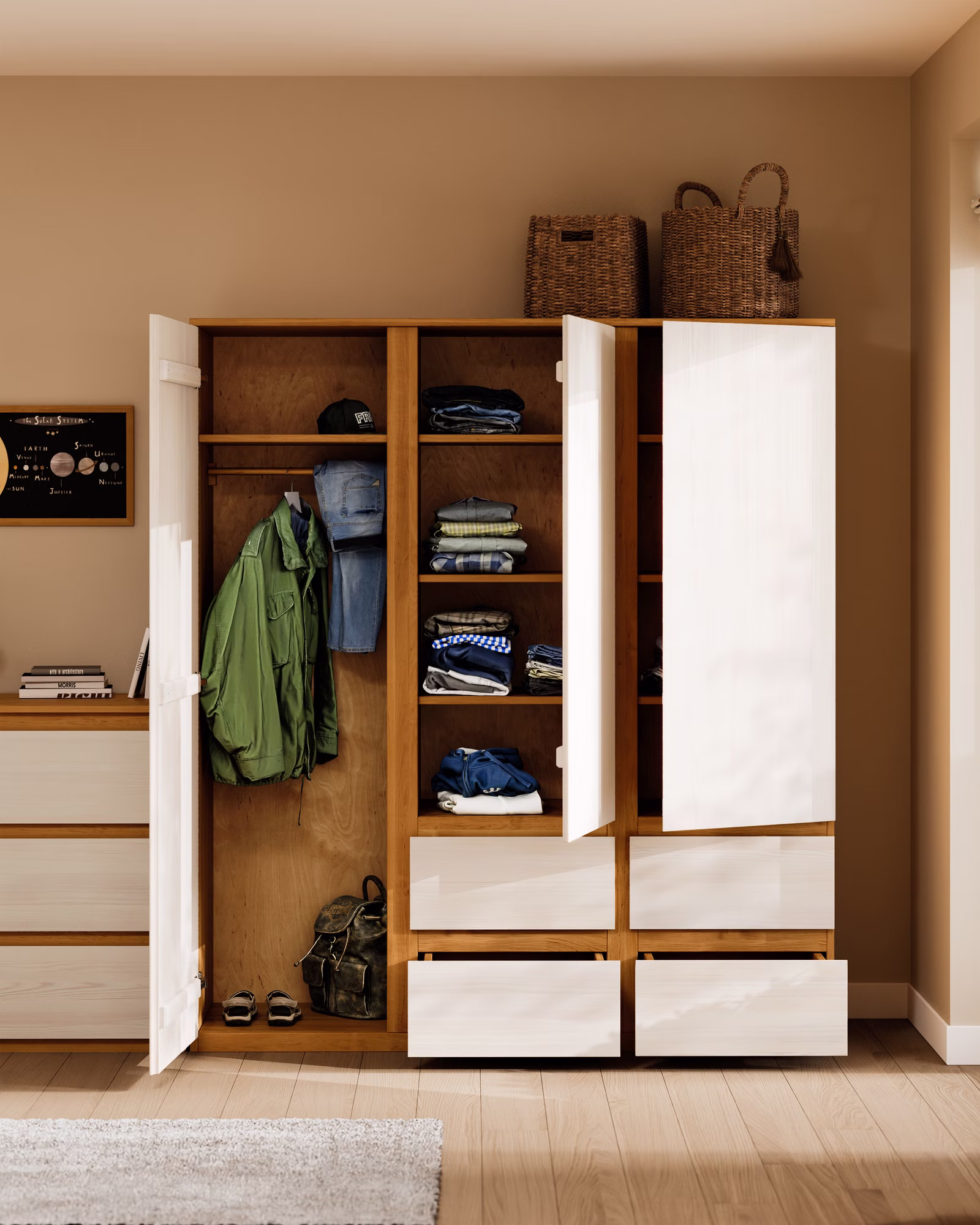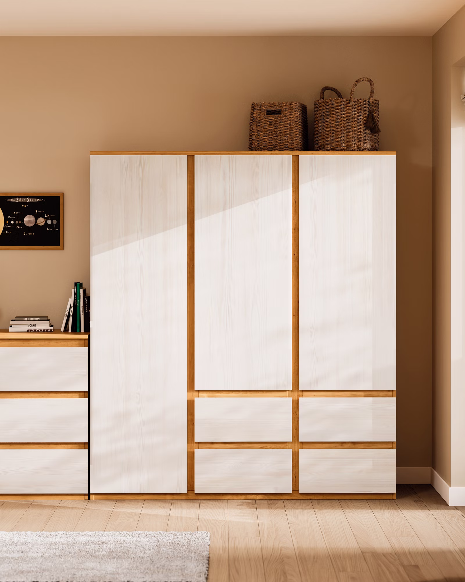 In der neuen, geräumigeren Variante mit drei Türen und vier Schubladen bietet der Schrank noch mehr Platz für Kleidung, Spielzeug und Alltagsgegenstände. Sieben Einlegeböden und eine Kleiderstange sorgen für eine flexible Innenaufteilung. Die Schubladen sind mit Leichtlaufschienen, Soft-Close und Vollauszug ausgestattet, sodass sie sich mühelos und geräuschlos öffnen und schließen lassen. Dank der Griffmulden sind Türen und Schubladen auch für kleine Kinderhände leicht zu bedienen.
