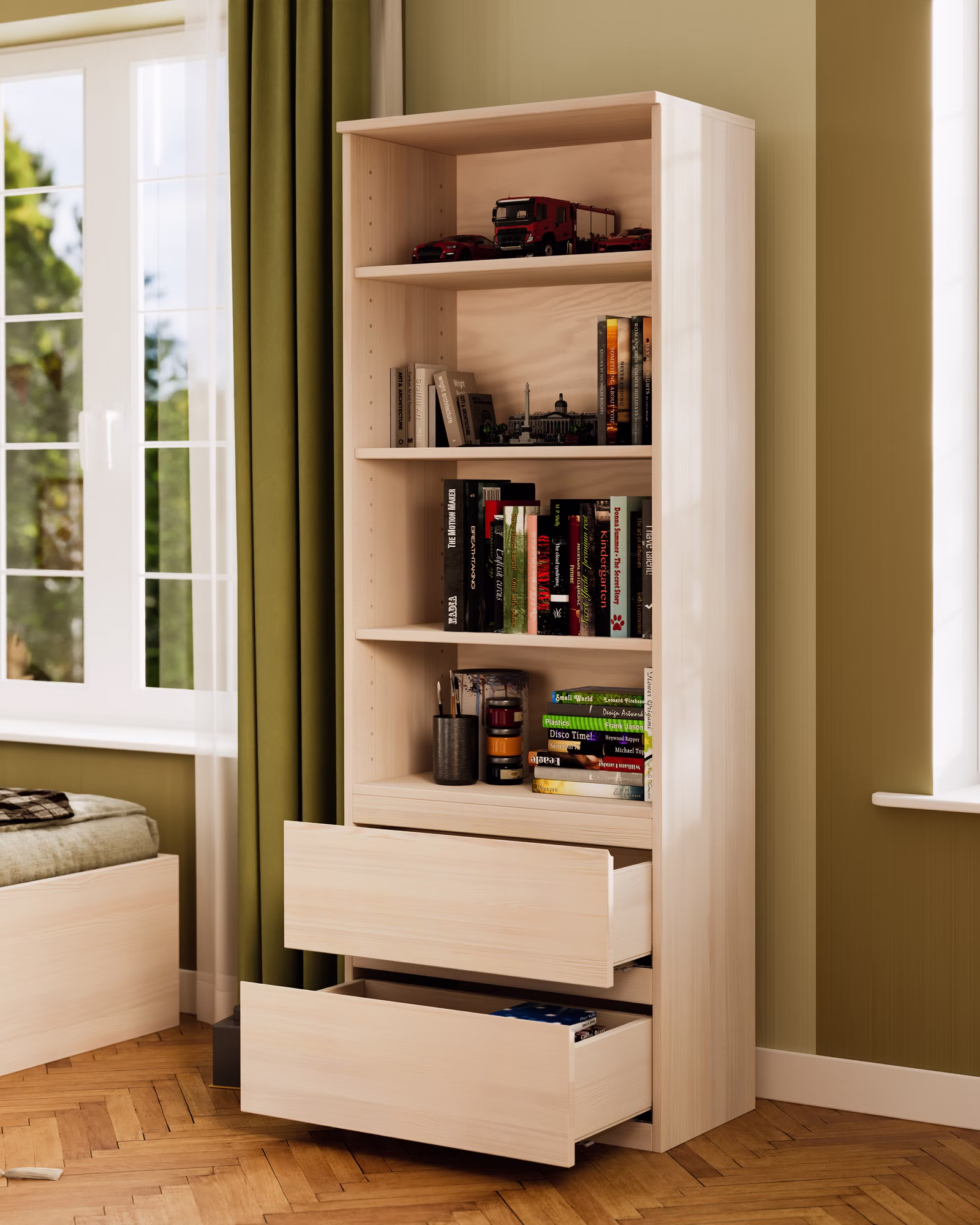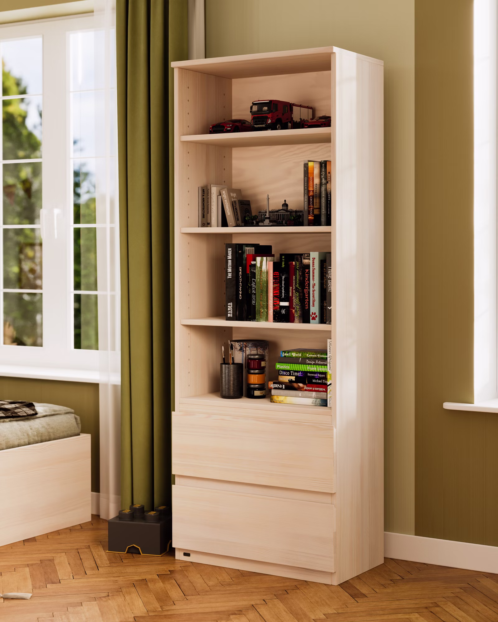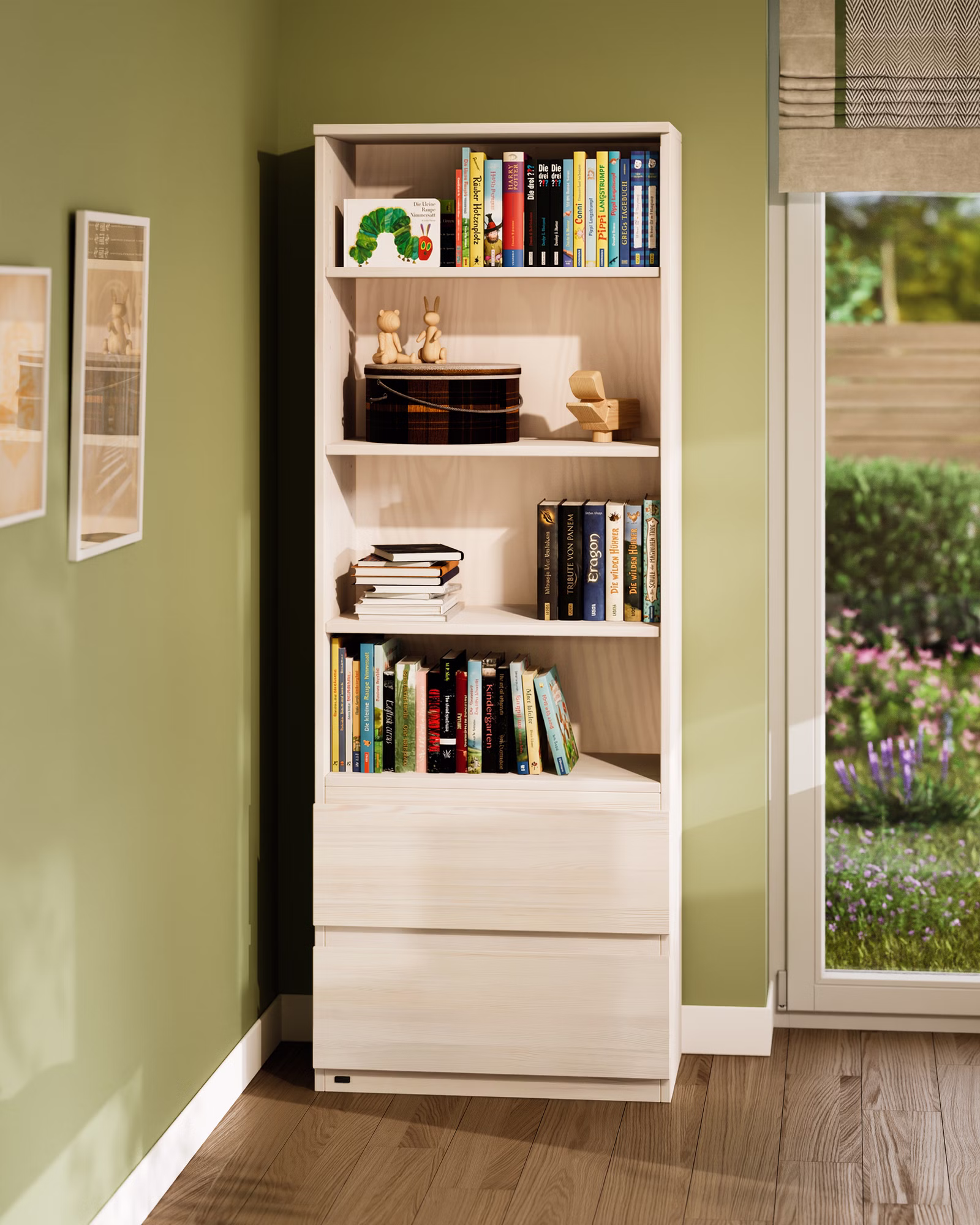 Das Finn Regal ist die perfekte Ausstattung fürs Kinder- und Jugendzimmer! Das schlanke Regal mit angenehmen Proportionen bietet genügend Platz für Bücher, Spiel- und Schulsachen. Die Kombination aus Schubkästen mit Vollauszug und mehreren Regalfächern eröffnet vielfältige Optionen für eine stilvolle und übersichtliche Aufbewahrung. Das schlicht-elegante Design des Finn Regals strahlt einen zeitlosen Charme aus, dank dem es sich harmonisch in jede Kinderzimmereinrichtung einfügt.