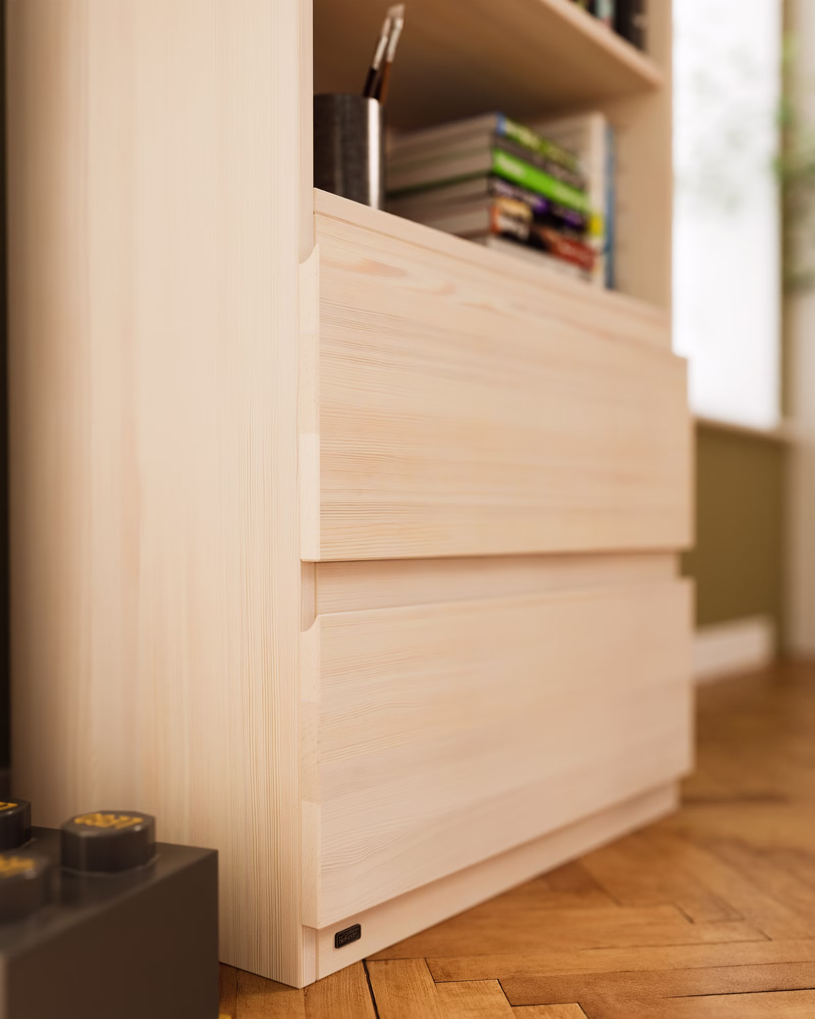 Die Schubladen des Finn Regals verfügen über einen Soft-Close-Mechanismus für ein sicheres und geräuscharmes Schließen sowie über kugelgelagerte Leichtlaufschienen mit Selbsteinzug. Zusätzlich dazu lassen sie sich voll ausziehen und bieten so einen Einblick bis in den hintersten Teil der Schublade.