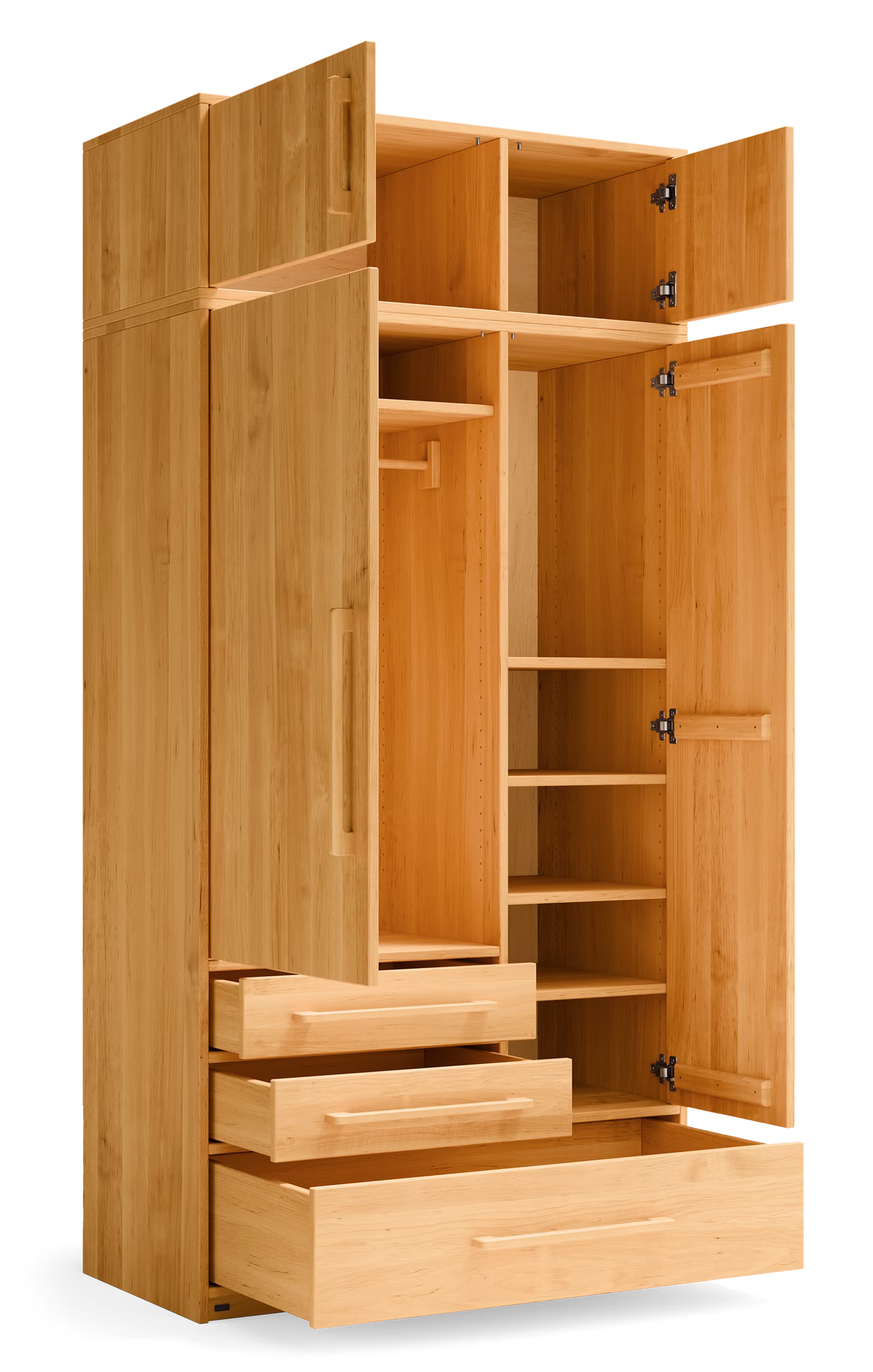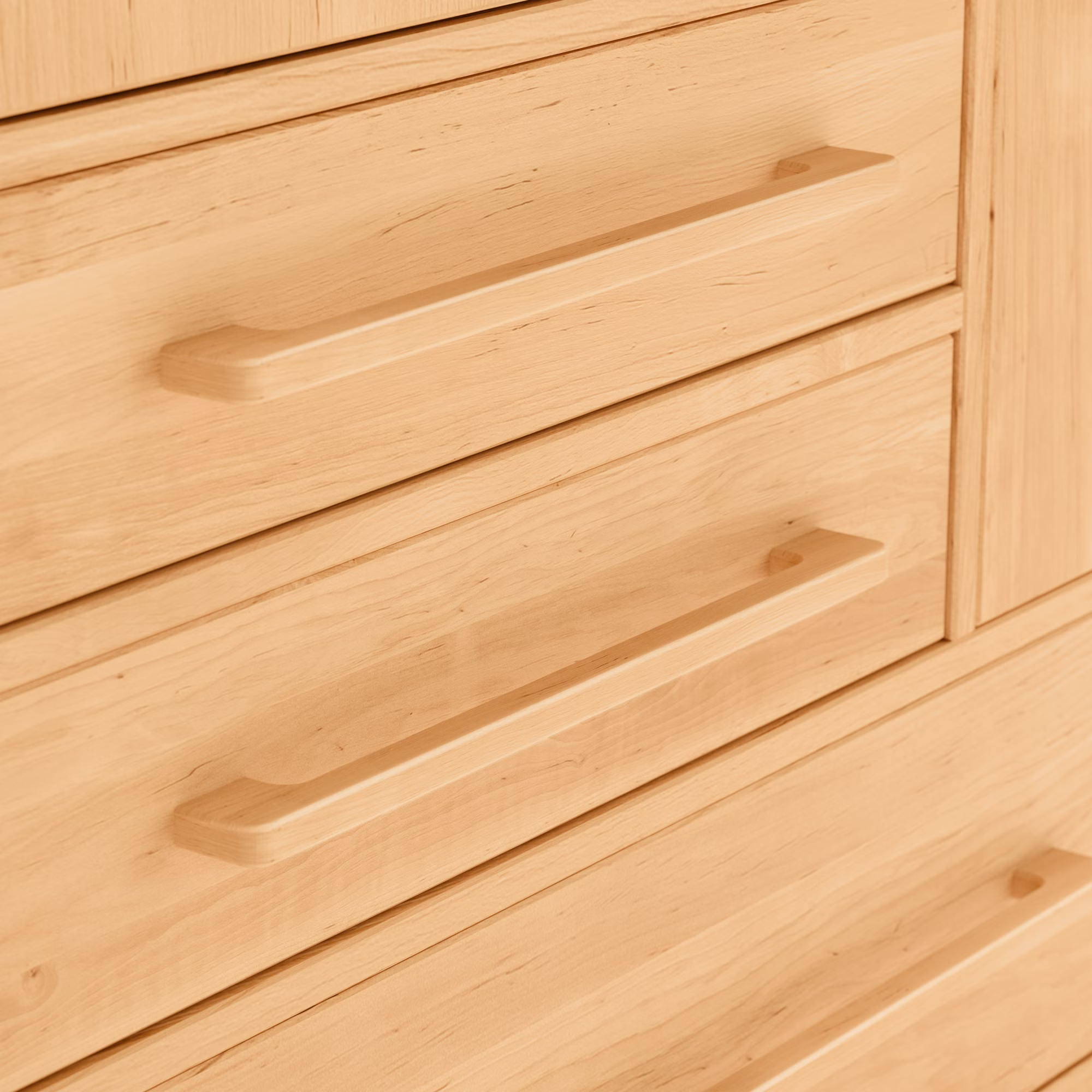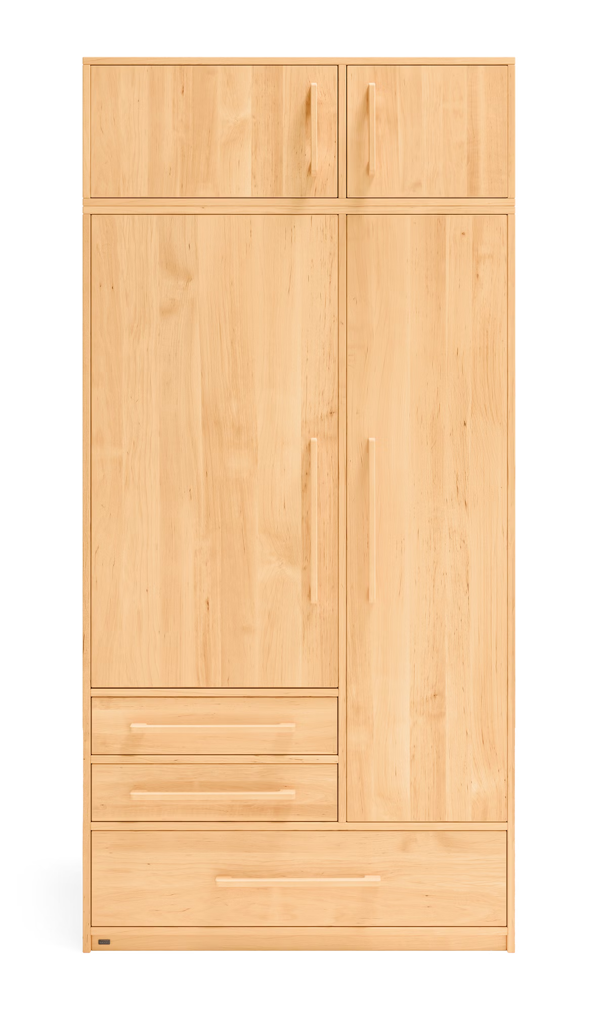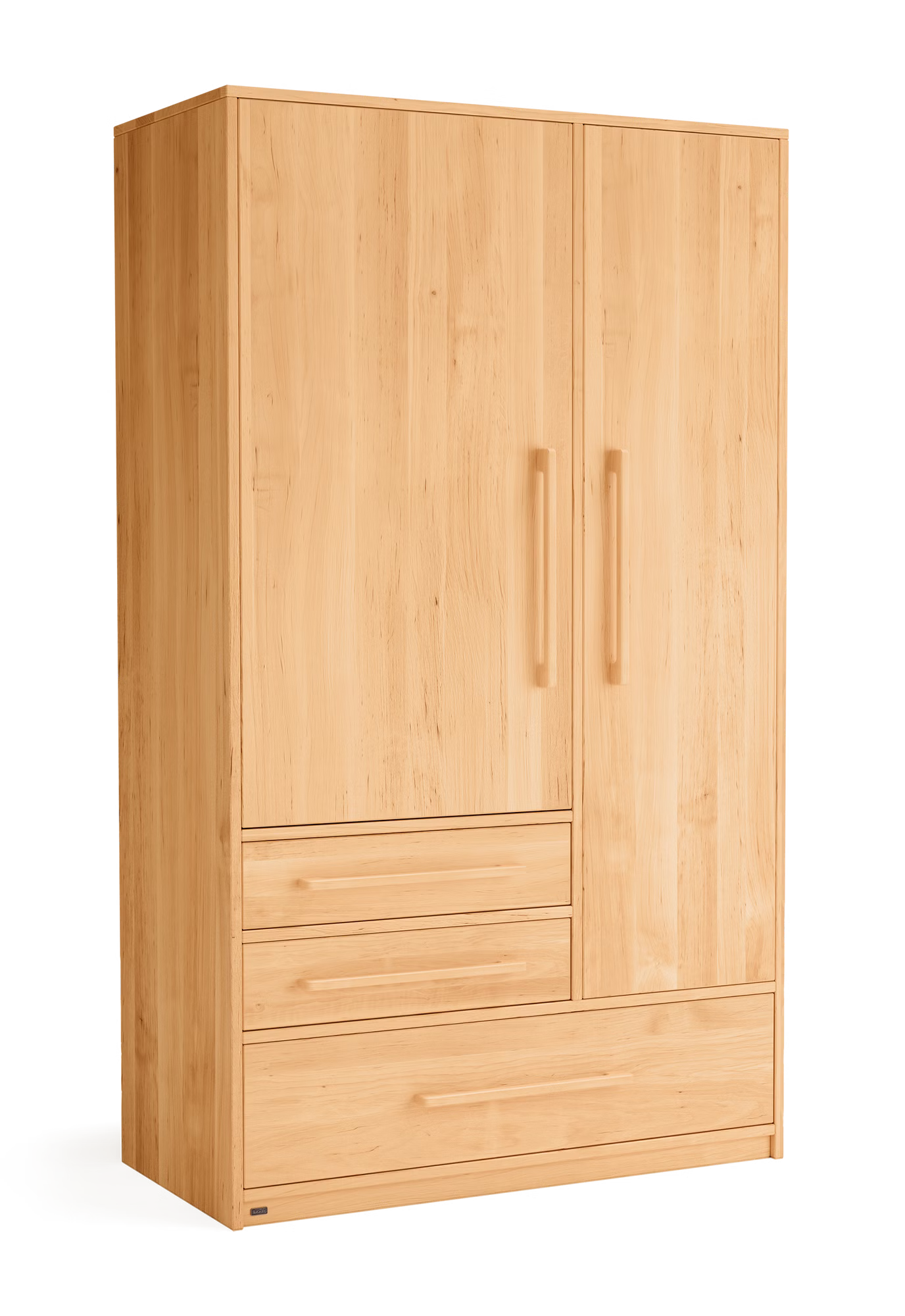 Unser Henry Kleiderschrank ist aus ökologischem Vollholz gefertigt und fällt durch sein modernes, geometrisches Design und die eleganten, gefrästen Griffmulden auf. Eine große Schublade, zwei kleine Schubladen, eine verstellbare Kleiderstange sowie flexible Schrankböden sorgen für eine durchdachte und praktische Innenaufteilung.