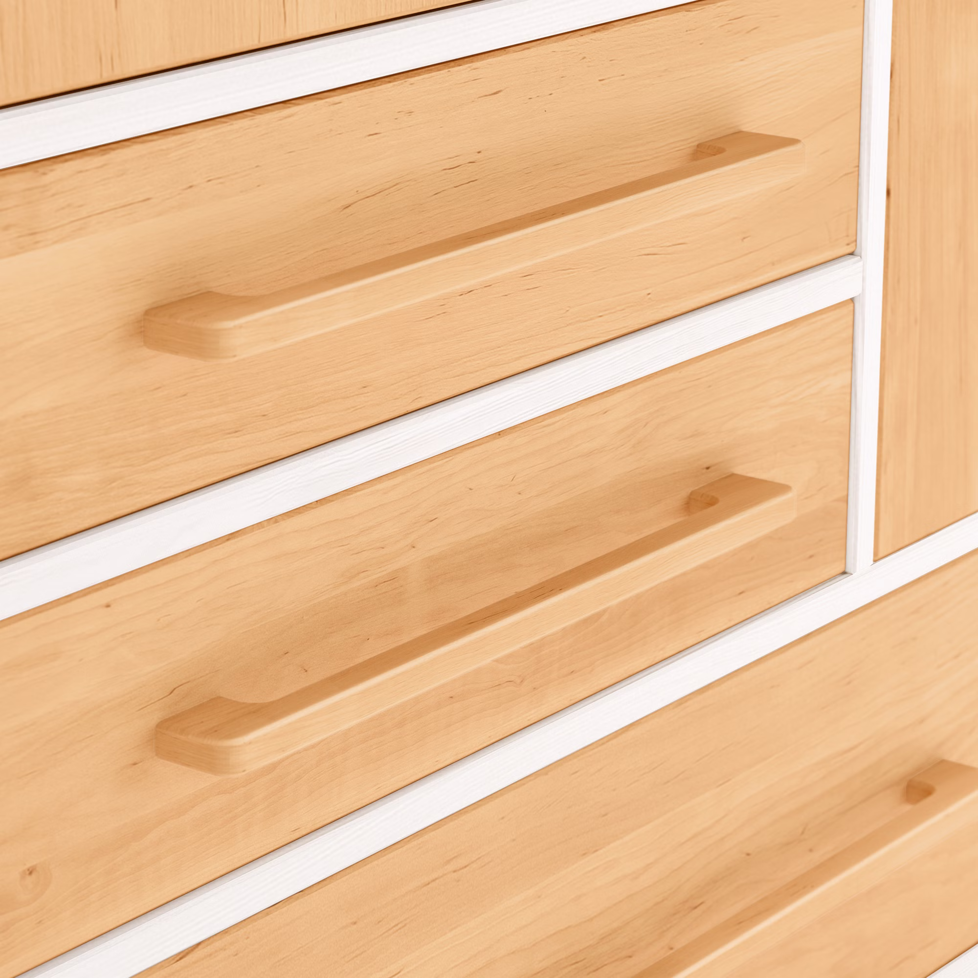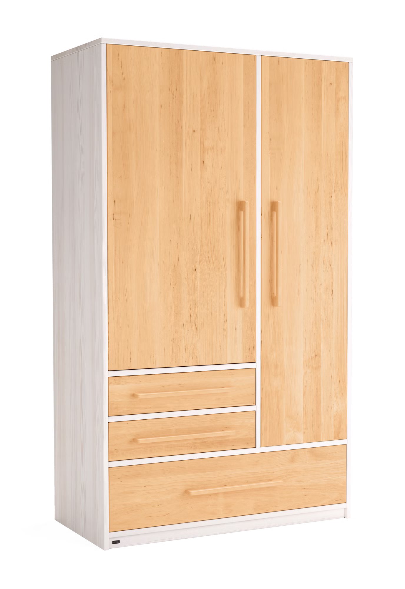 Unser Henry Kleiderschrank ist aus ökologischem Vollholz gefertigt und fällt durch sein modernes, geometrisches Design und die eleganten, gefrästen Griffmulden auf. Eine große Schublade, zwei kleine Schubladen, eine verstellbare Kleiderstange sowie flexible Schrankböden sorgen für eine durchdachte und praktische Innenaufteilung.