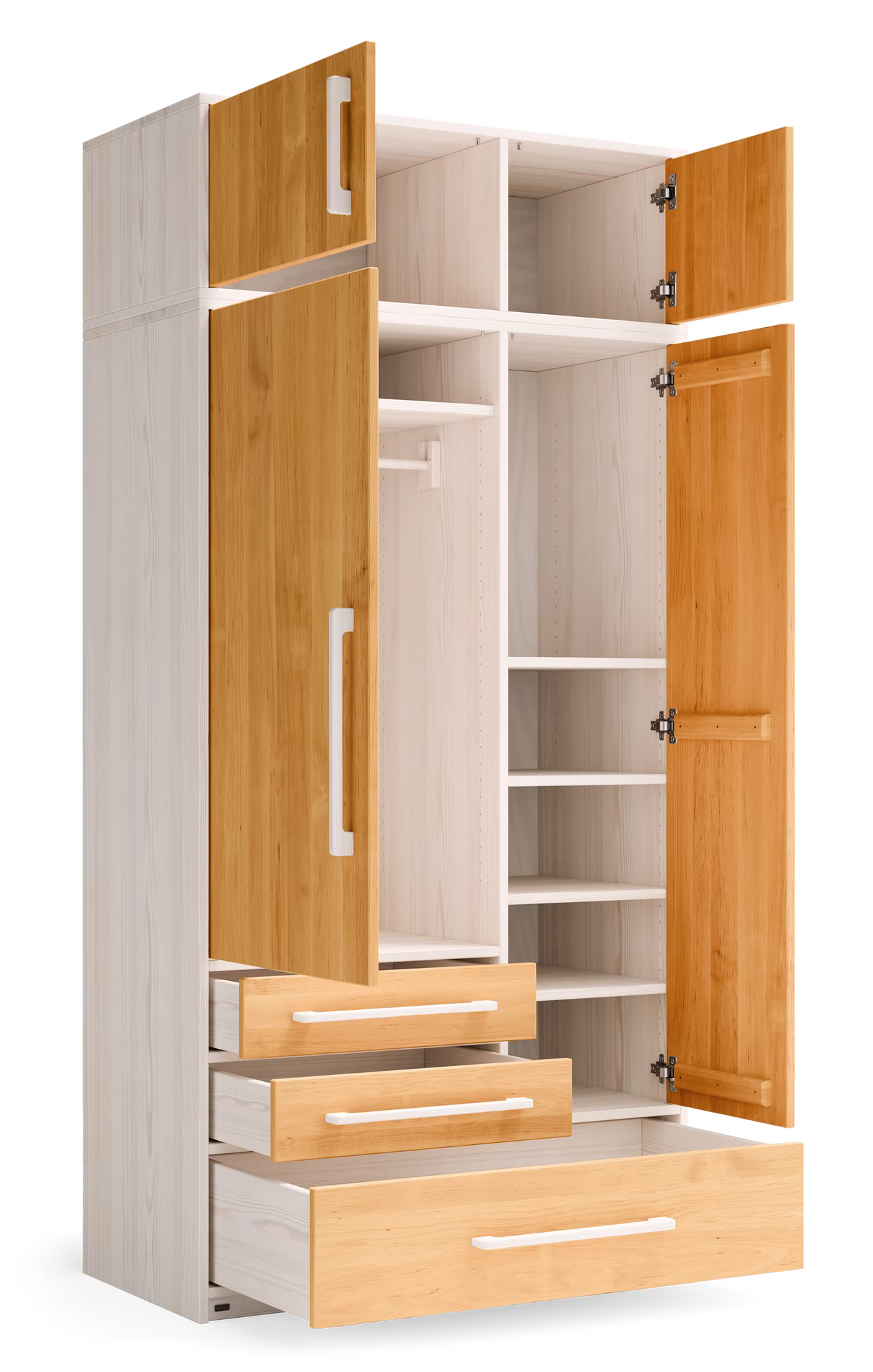 Der Schrank wird mit unserem praktischen Henry Schrankaufsatz geliefert. Dieser Aufsatz ist mit zwei Türen ausgestattet und sorgt für zusätzlichen Stauraum in der Höhe.