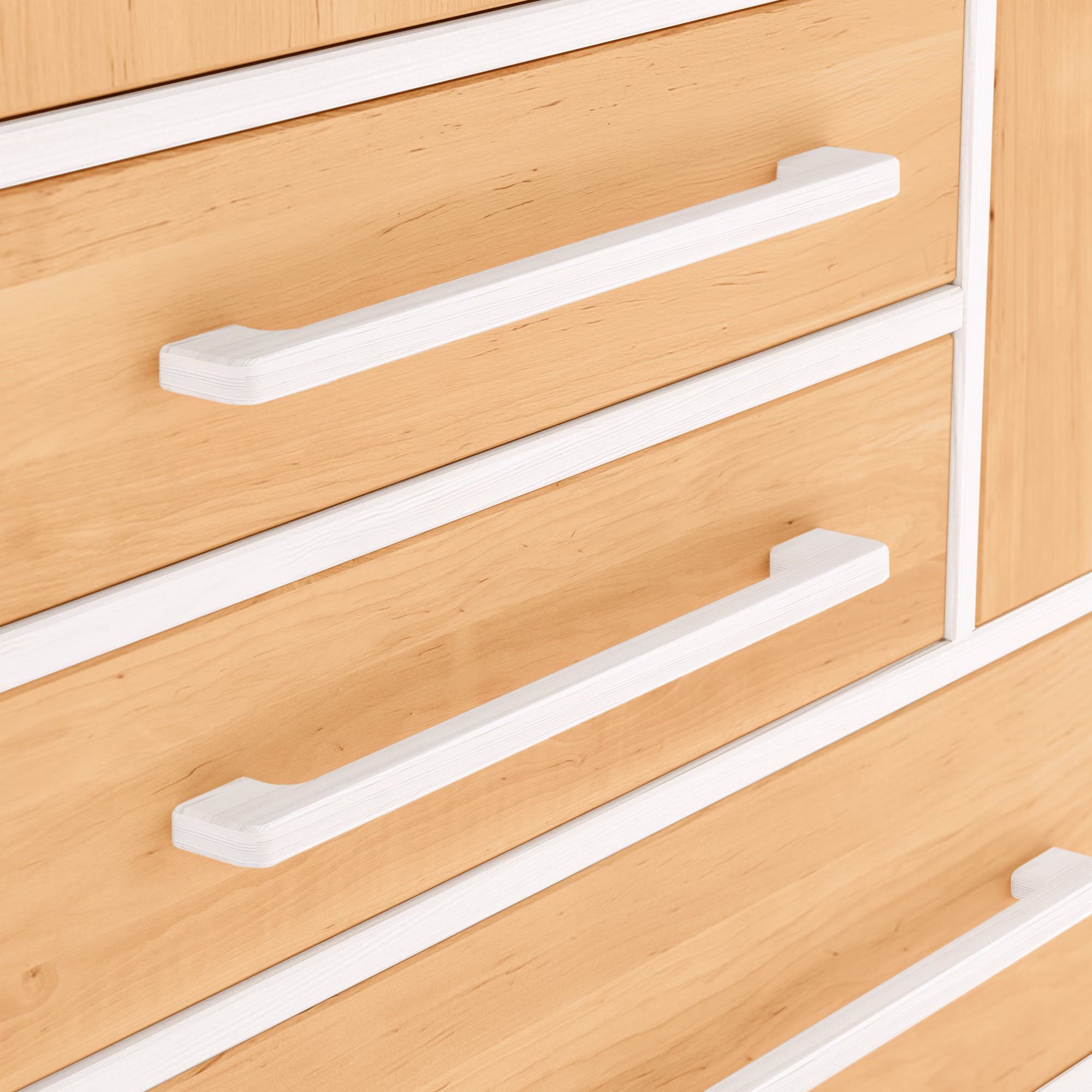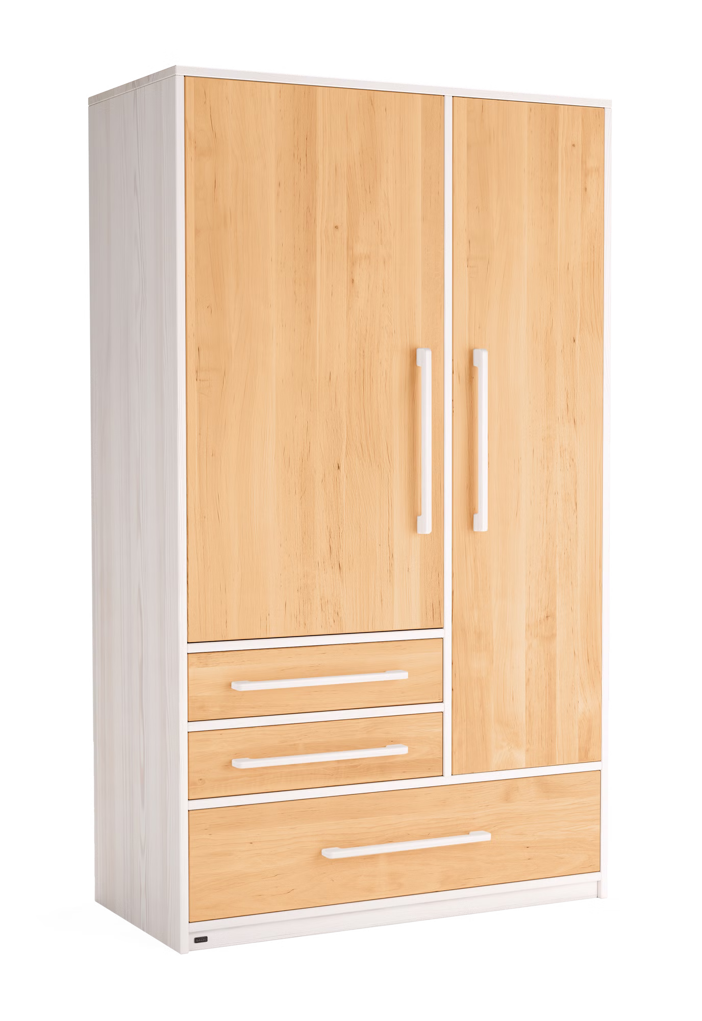 Unser Henry Kleiderschrank ist aus ökologischem Vollholz gefertigt und fällt durch sein modernes, geometrisches Design und die eleganten, gefrästen Griffmulden auf. Eine große Schublade, zwei kleine Schubladen, eine verstellbare Kleiderstange sowie flexible Schrankböden sorgen für eine durchdachte und praktische Innenaufteilung.