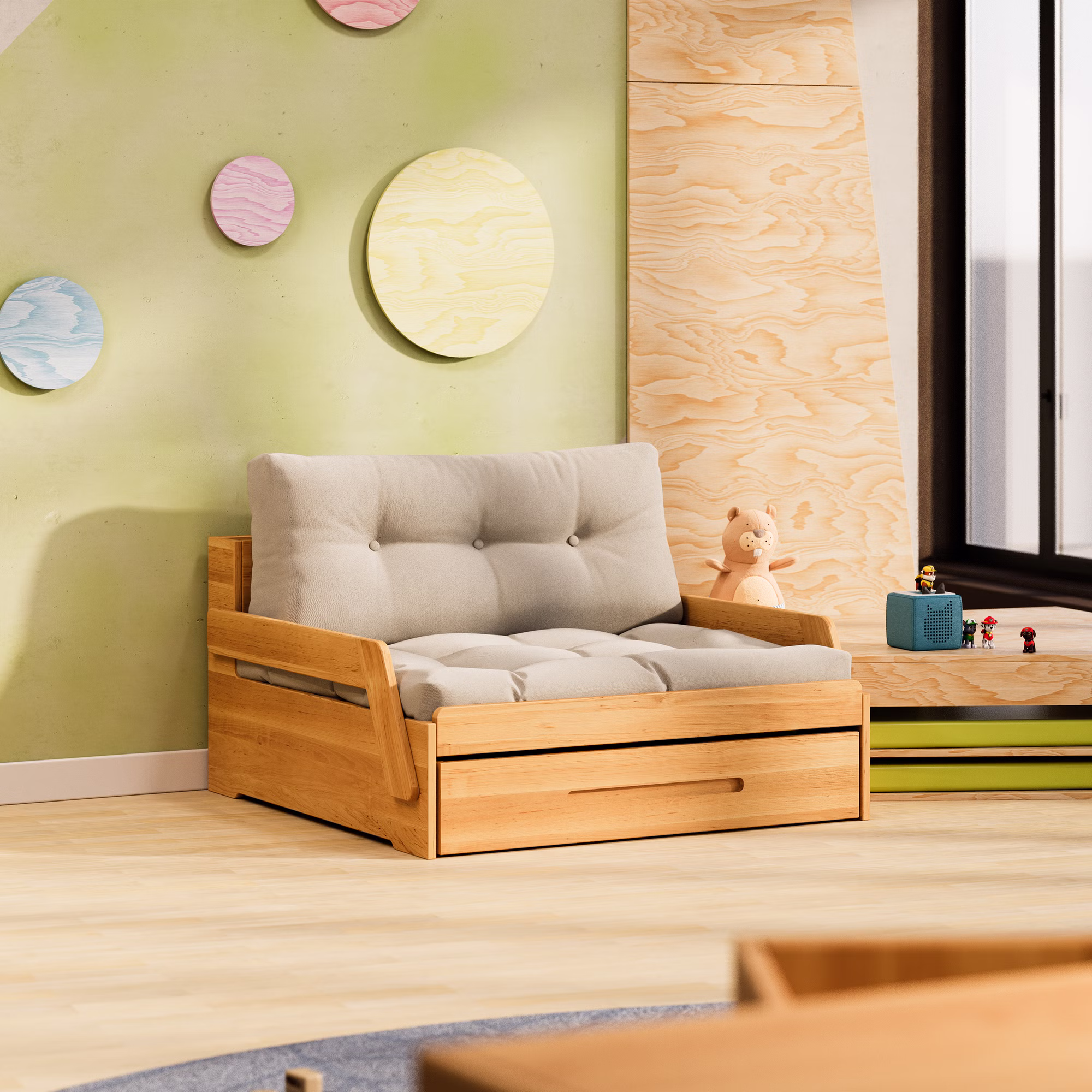 Optional lässt sich das Set mit dem passenden Lina Bettkasten ergänzen. Der praktische Bettkasten auf Rollen wird platzsparend unter dem Sofamodul verstaut und bietet viel Stauraum für Bettwäsche, Kissen, Spielzeug oder andere Utensilien – eine durchdachte Lösung für mehr Ordnung im Kinderzimmer.