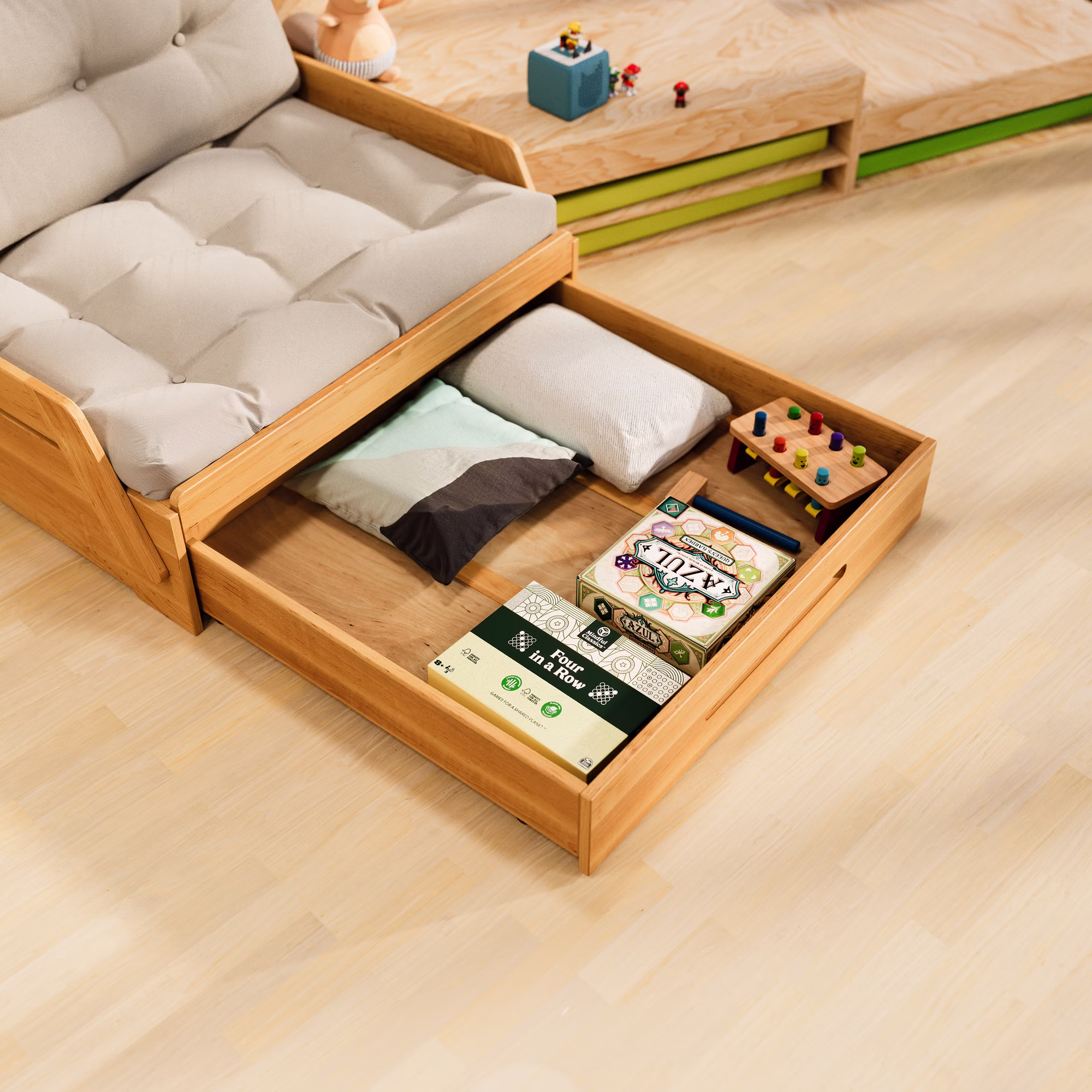 Das Set aus drei Lina Schlafsofa-Modulen mit passenden Armlehnen verwandelt das Kinderzimmer in eine großzügige, vielseitig nutzbare Wohlfühloase. Zusätzlich sind die Module jeweils mit einem praktischen Bettkasten auf Rollen ausgestattet. Diese lassen sich platzsparend unter dem Sofamodul verstauen und bieten viel Stauraum für Bettwäsche, Kissen, Spielzeug oder andere Utensilien - ideal, um Ordnung zu schaffen, ohne auf Wohnlichkeit zu verzichten.