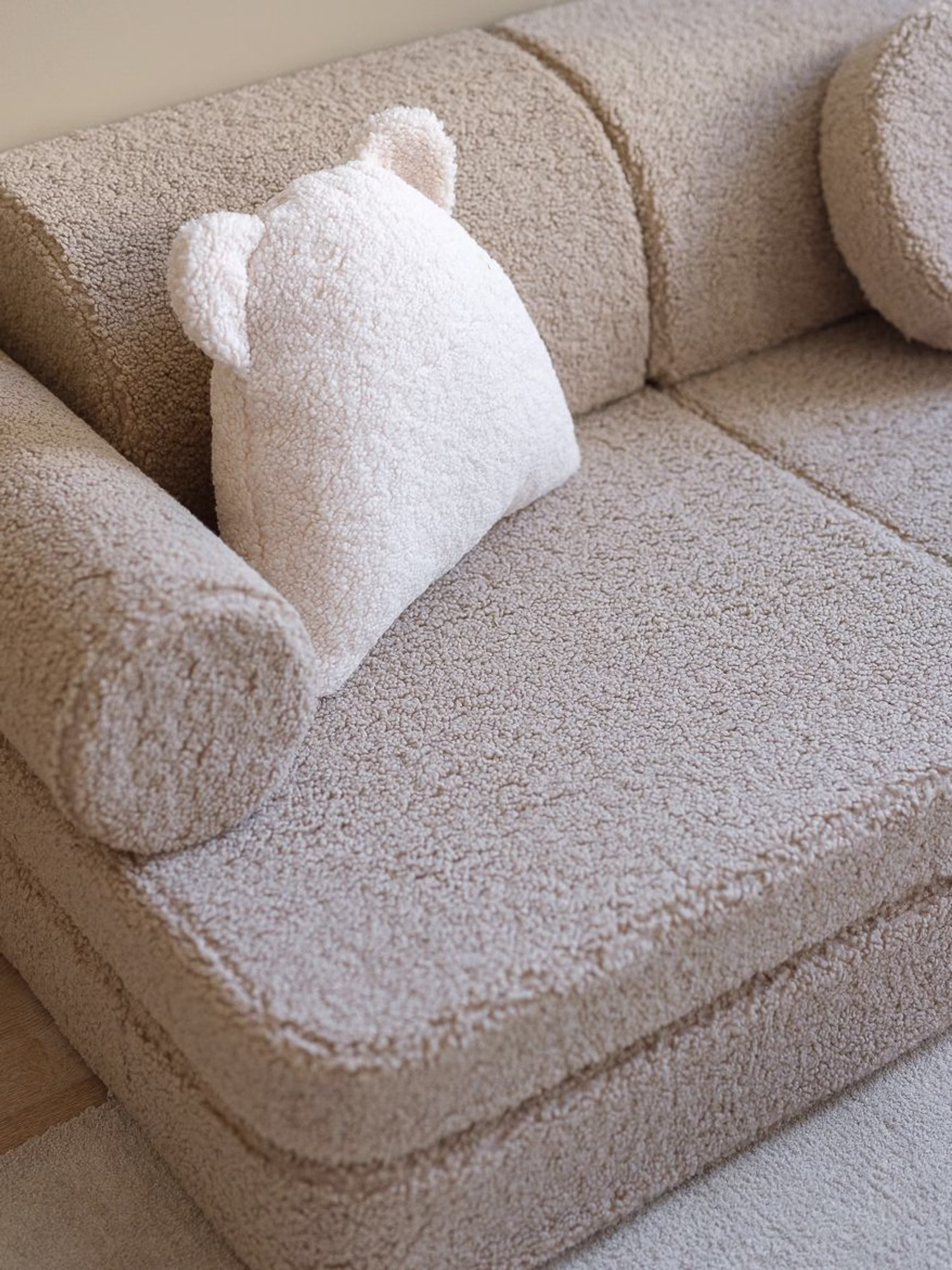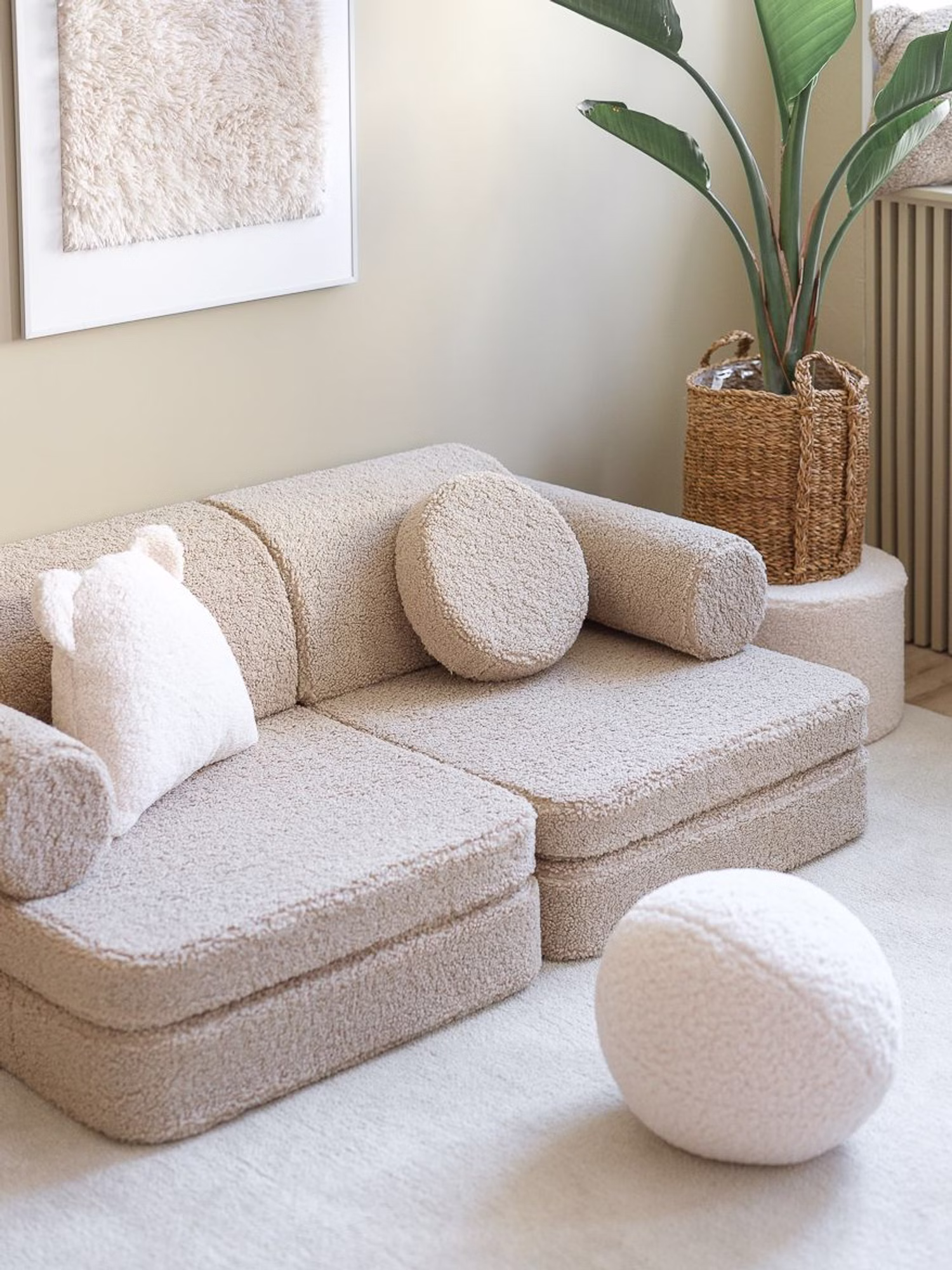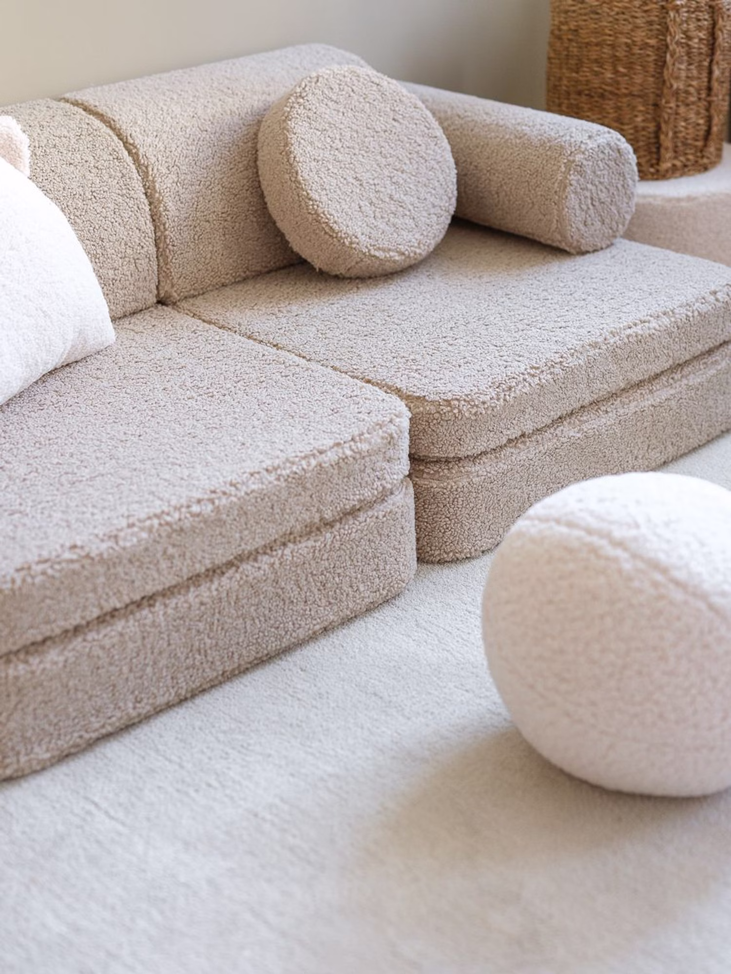 Das Sofa besteht aus 10 Teilen - zwei kleine Sitzkissen, zwei große Sitzkissen, zwei dreieckige Kissen als Rückenlehnen, zwei Rollkissen als Armlehnen und zwei runde Kissen - eine perfekte Kombination mit grenzenlosem Potenzial für fantasievolles Spiel und Entspannung. Das Spielsofa ist nicht nur ein Möbelstück - es ist eine Einladung in eine Welt voller Freude und Entdeckungen!