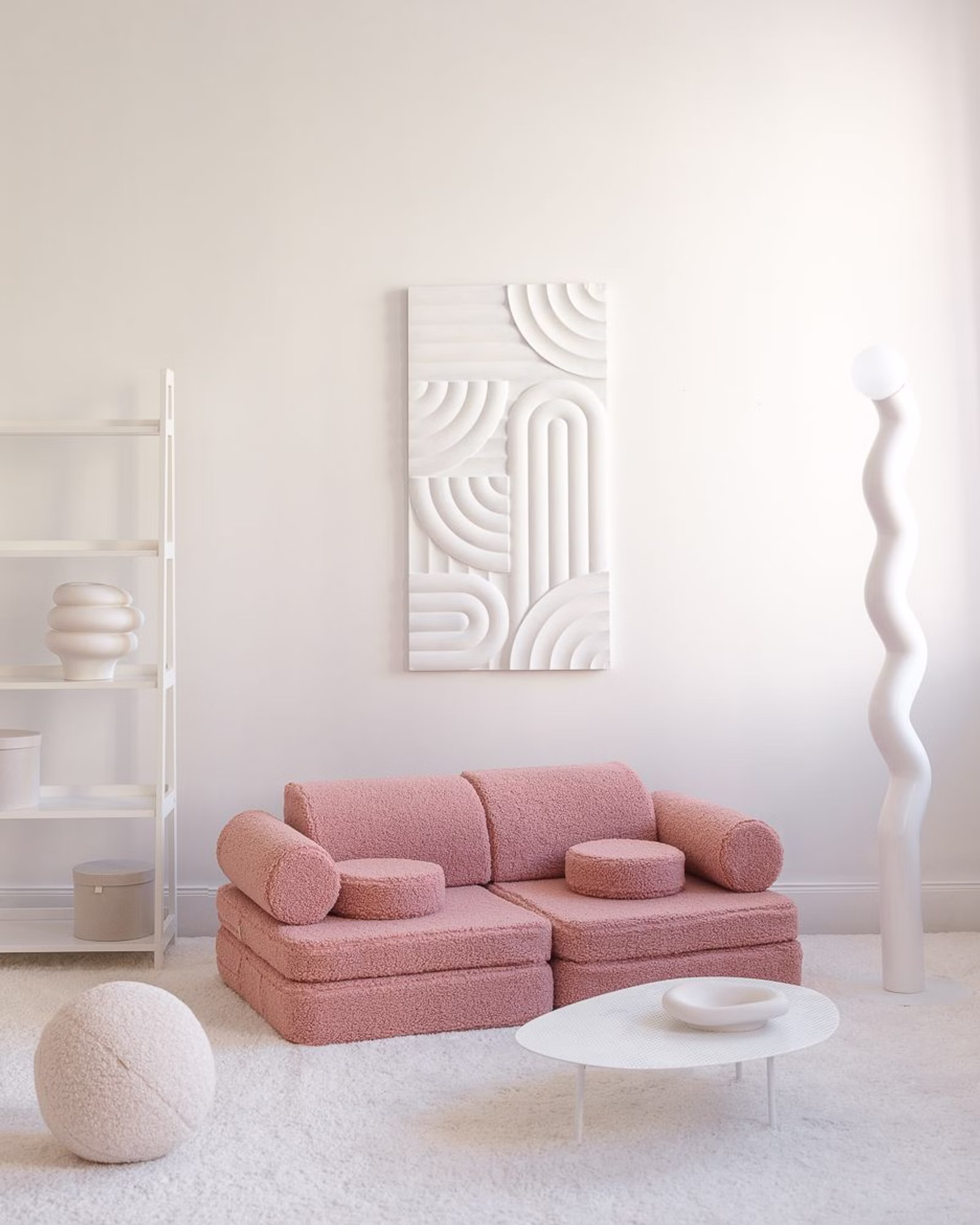 Das Sofa besteht aus 10 Teilen - zwei kleine Sitzkissen, zwei große Sitzkissen, zwei dreieckige Kissen als Rückenlehnen, zwei Rollkissen als Armlehnen und zwei runde Kissen - eine perfekte Kombination mit grenzenlosem Potenzial für fantasievolles Spiel und Entspannung. Das Spielsofa ist nicht nur ein Möbelstück - es ist eine Einladung in eine Welt voller Freude und Entdeckungen!