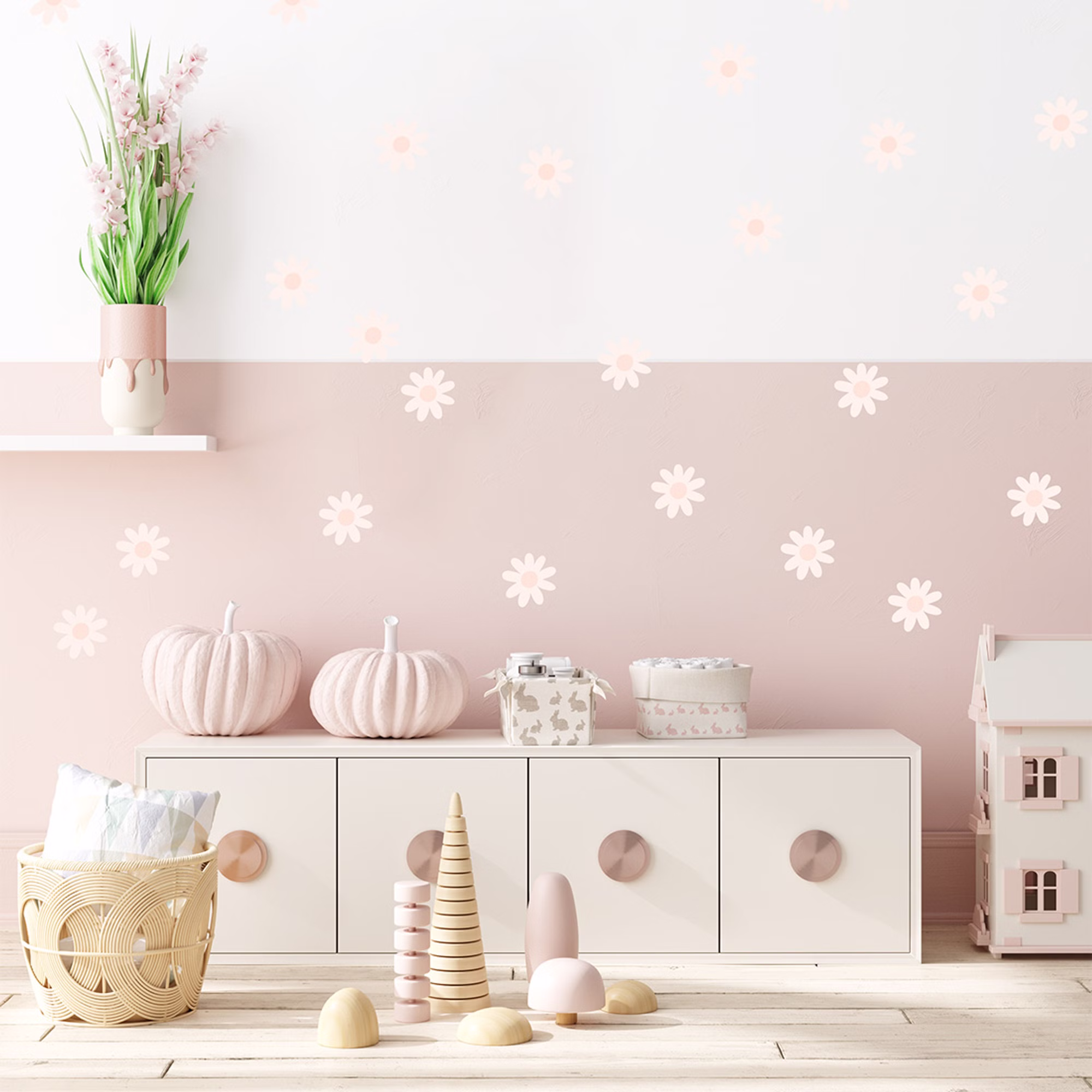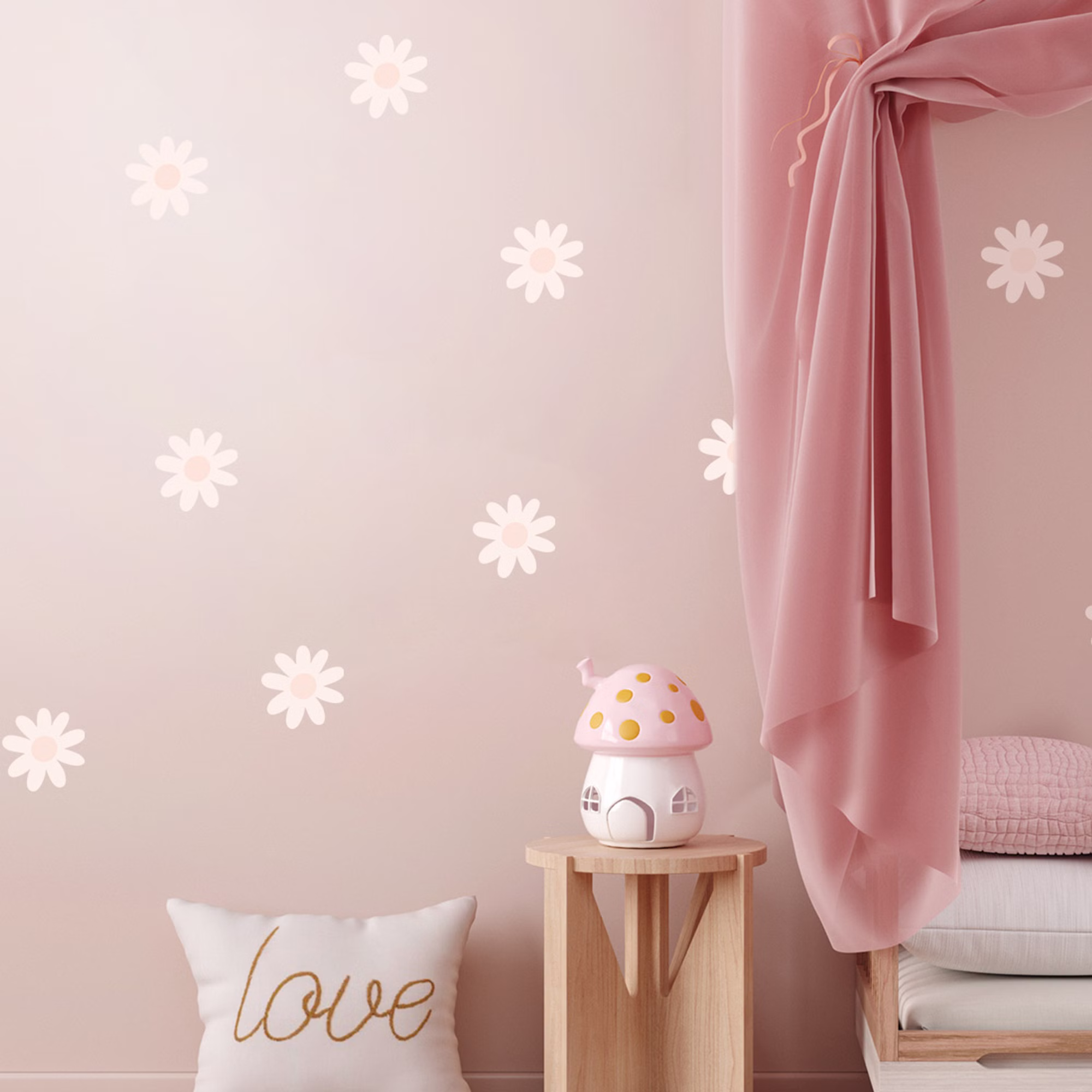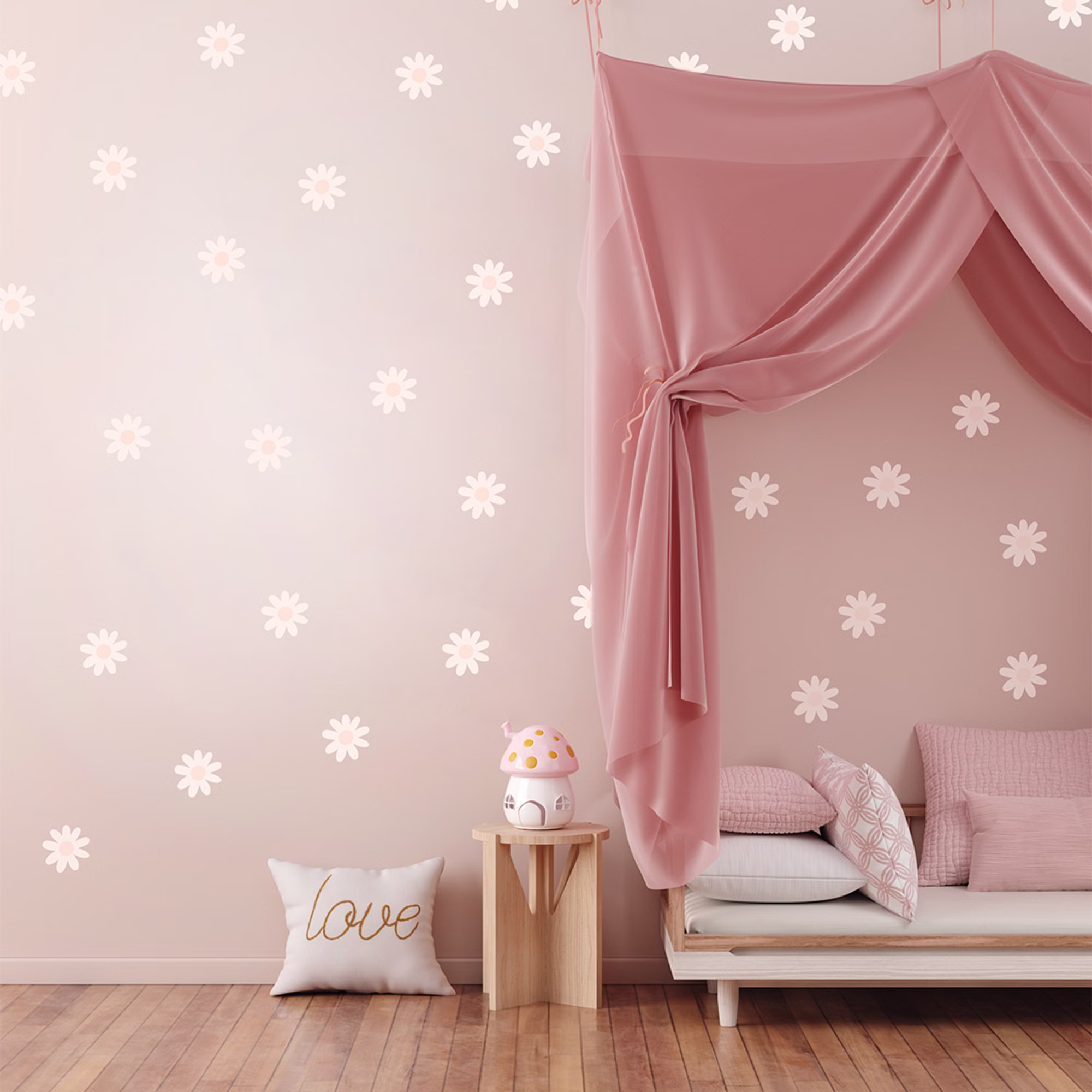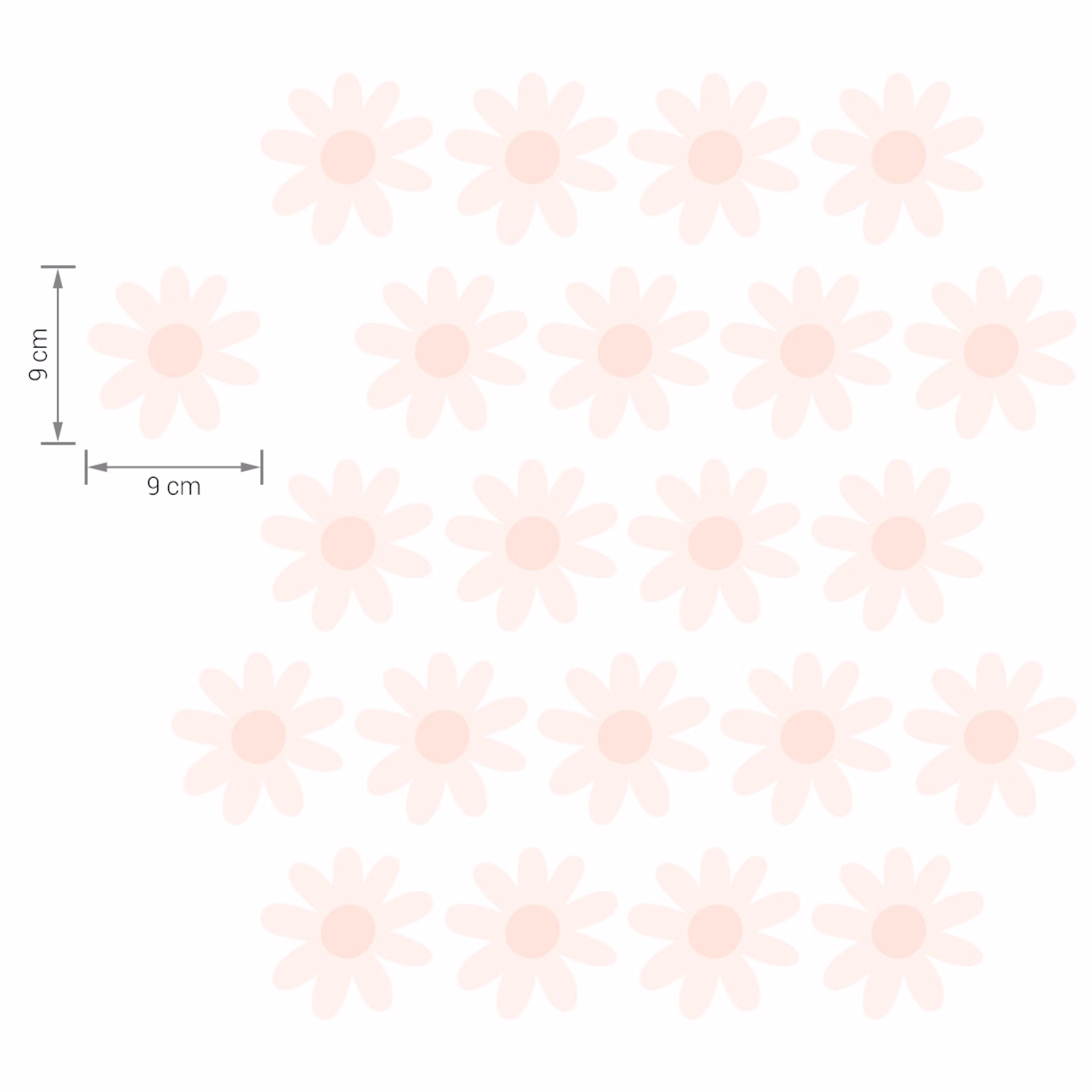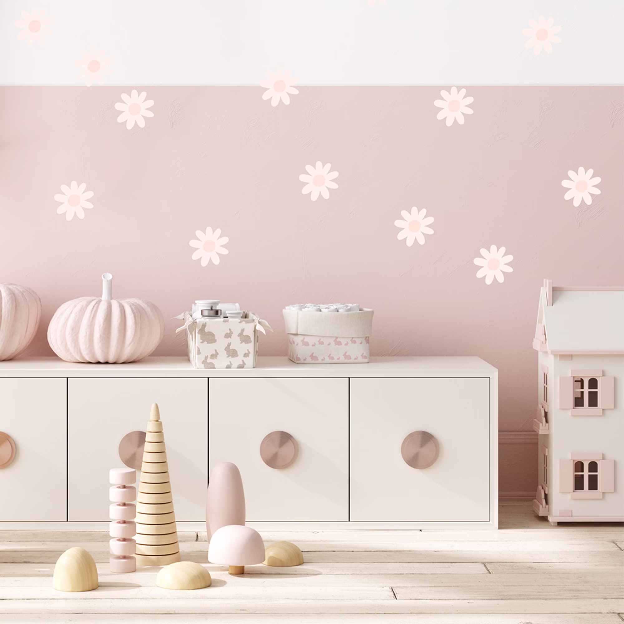 Diese bezaubernden Gänseblümchen können frei an der Wand angeordnet werden und schaffen einen wunderschönen Tapeten-Effekt. Zarte, sehr helle Farben verleihen der Wand einen besonderen Charakter.