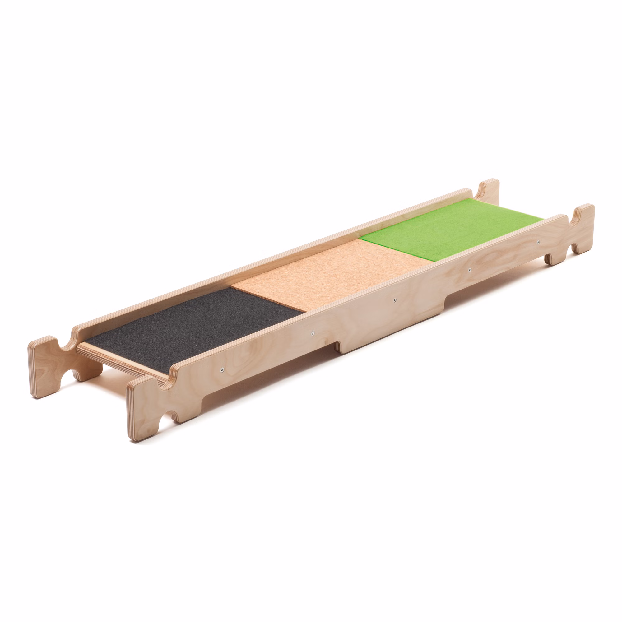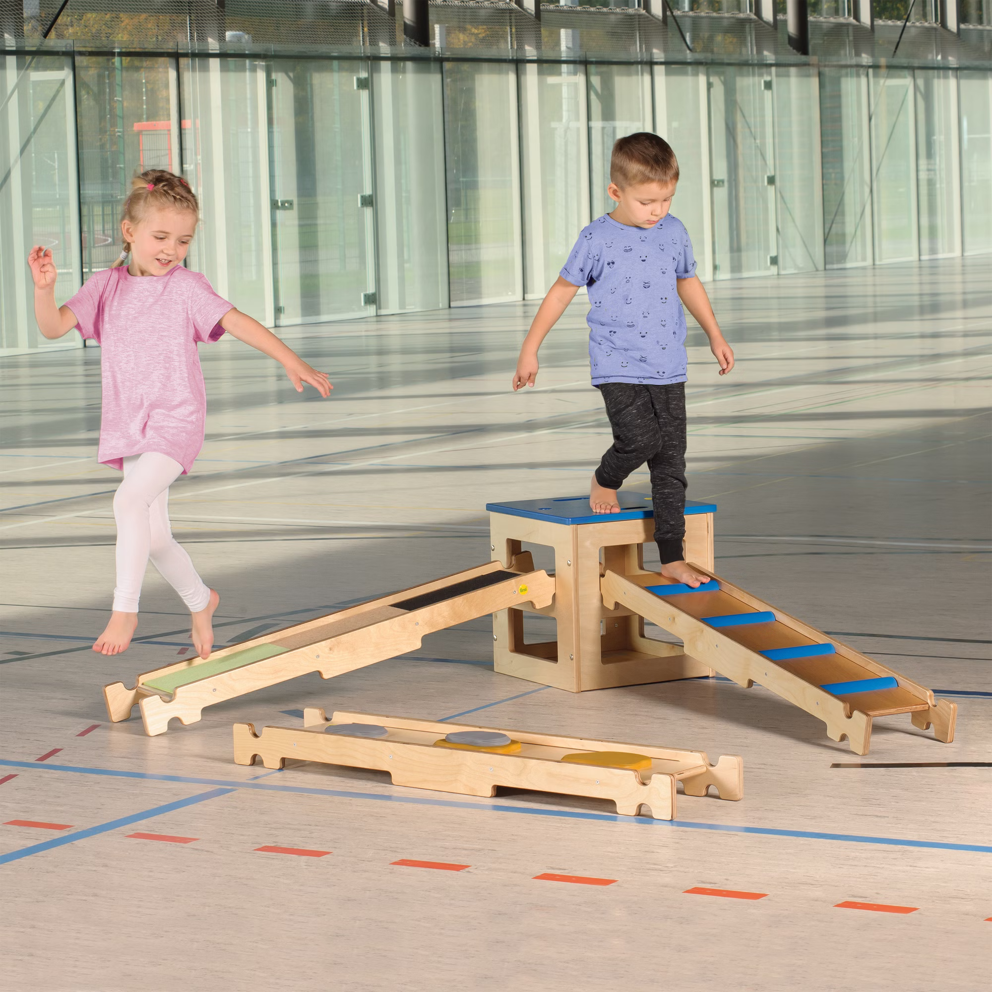 Diese kreative Sportbox ist superpraktisch in der Sporthalle und fordert zum Klettern und Balancieren auf. Mit den allseitigen Öffnungen kann die Sportbox mit Balancierbrettern kombiniert werden. So entstehen großartige Parcours mit hohem Aufforderungscharakter. Das farbige Rollbrett mit leisen, bodenschonenden Lenkrollen kann als Sportgerät für bis zu zwei Kinder, als Abdeckung oder für den Transport der Sportbox genutzt werden, die optimale Zusammenstellung mit unserem Podest für die Sprossenwand. Auf dem Balancierbrett mit den Steinen lässt es sich wunderbar hochsteigen. Wer sich traut, kann das Balancierbrett Materialmix ohne Schuhe und Socken erkunden - und so fühlen, welche Oberfläche den besten Halt bietet.