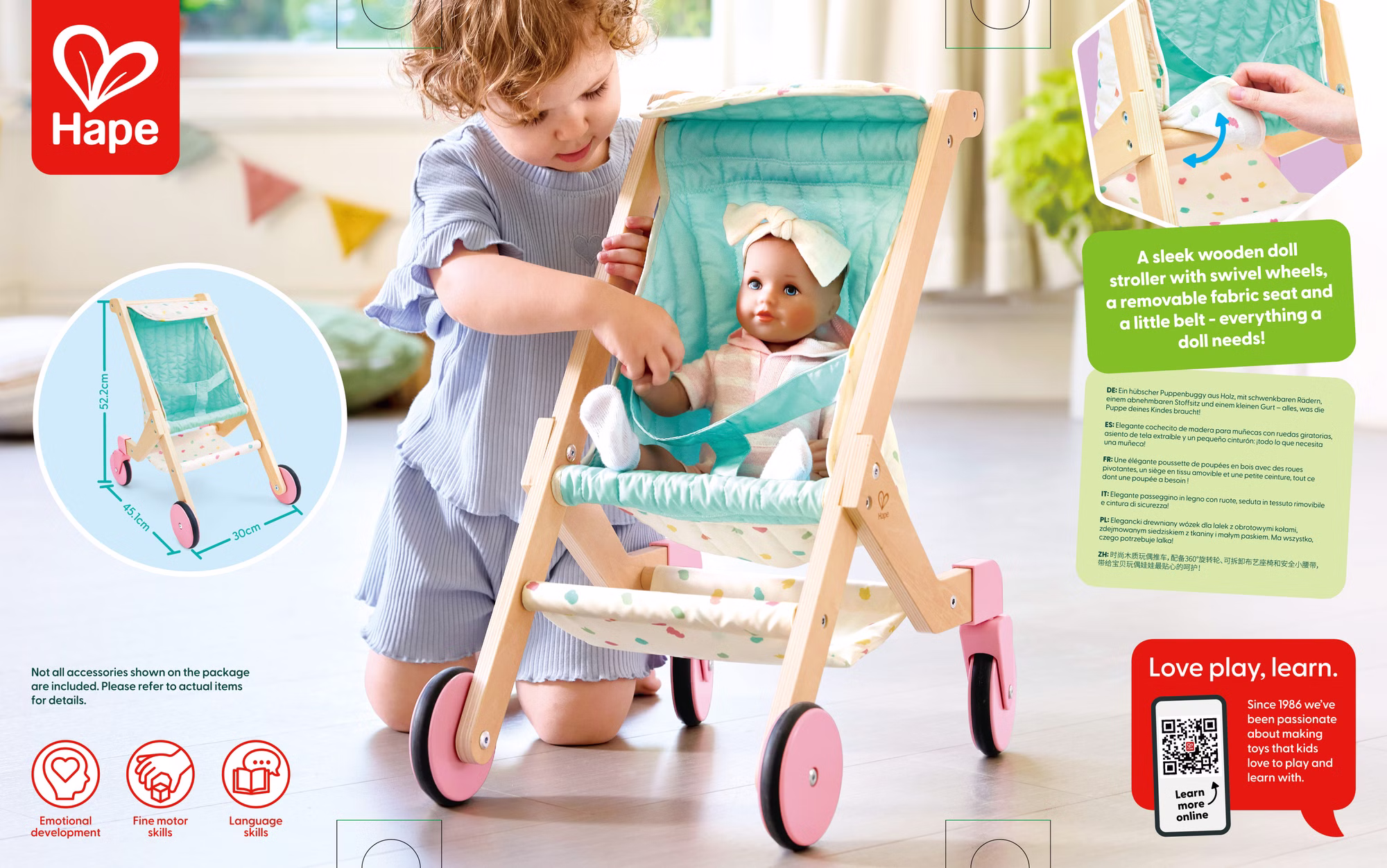 Dank der kindgerechten Größe und der stabilen Bauweise lässt sich der Puppenbuggy leicht schieben und bequem handhaben. Beim Spielen werden Fantasie, Kreativität und soziale Fähigkeiten gefördert, während Kinder liebevolle Rollenspiele nachstellen. Der Puppenbuggy ist damit eine tolle Ergänzung für jede Puppenausstattung und sorgt für viele fröhliche Abenteuer im Alltag.