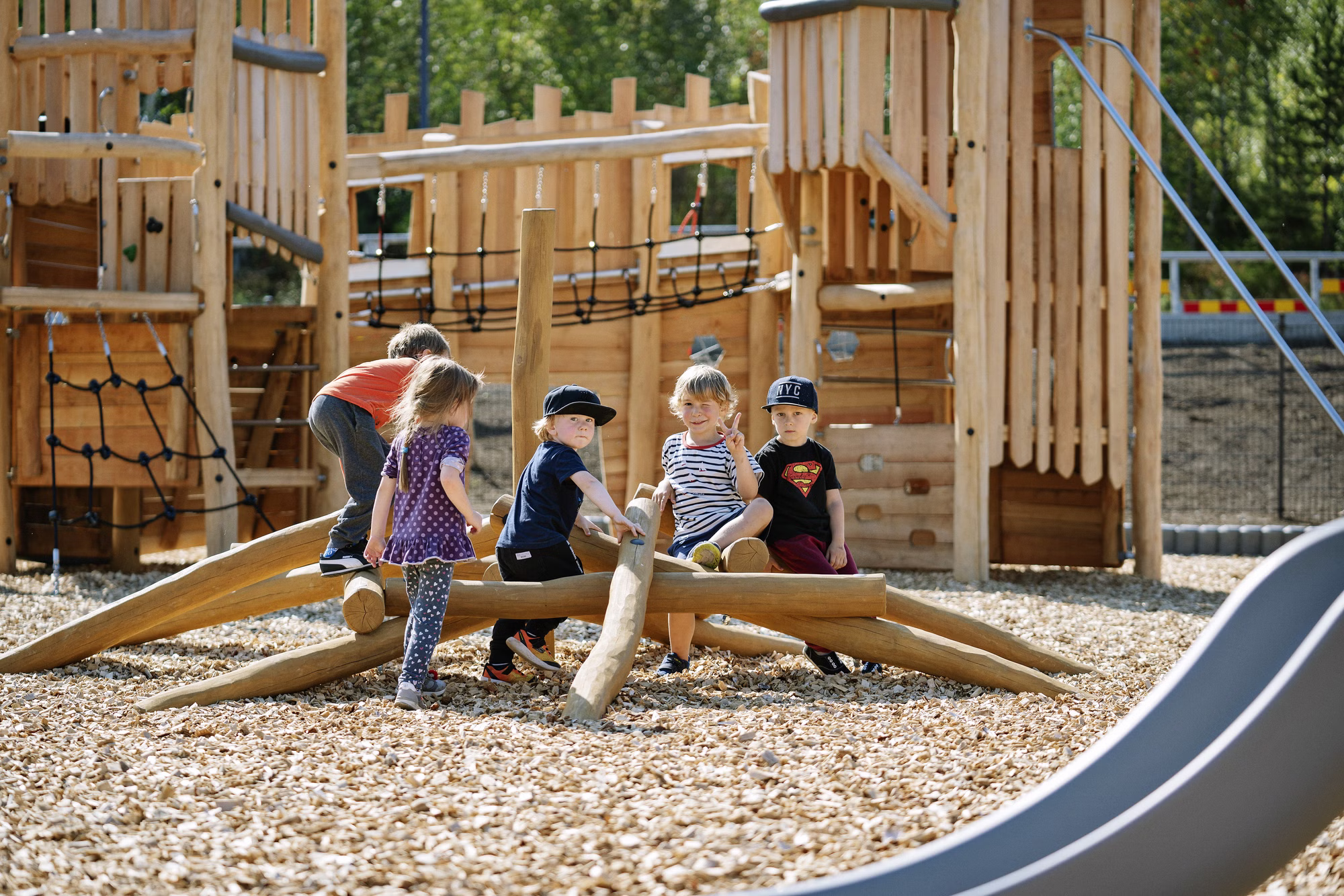 Die vielen waagerechten Balken des Kletter- und Balancierspiels laden zum Pausieren und Kennenlernen ein. Dies ist wichtig für die sozial-emotionalen Fähigkeiten der Kinder und die Bildung von Freundschaften.