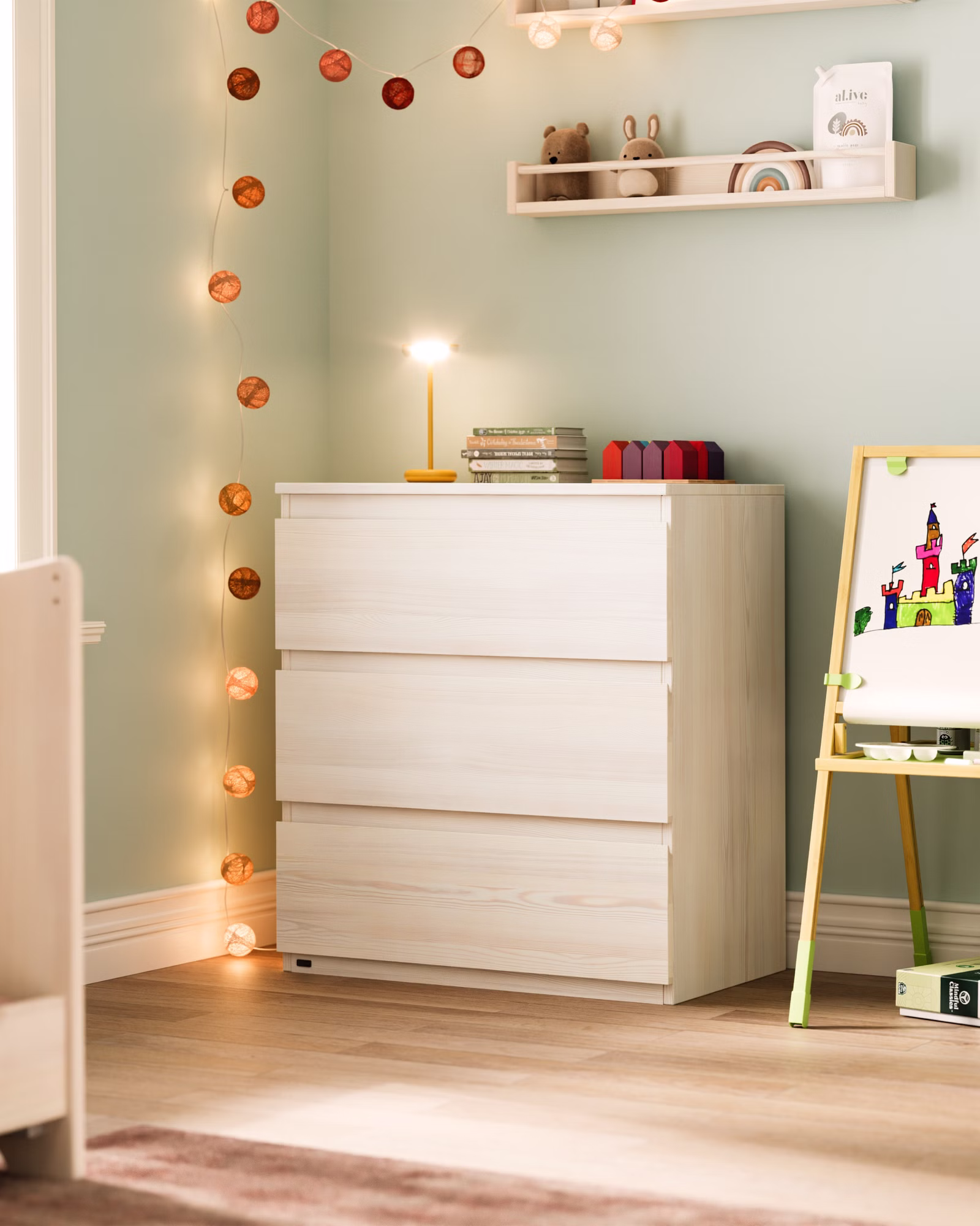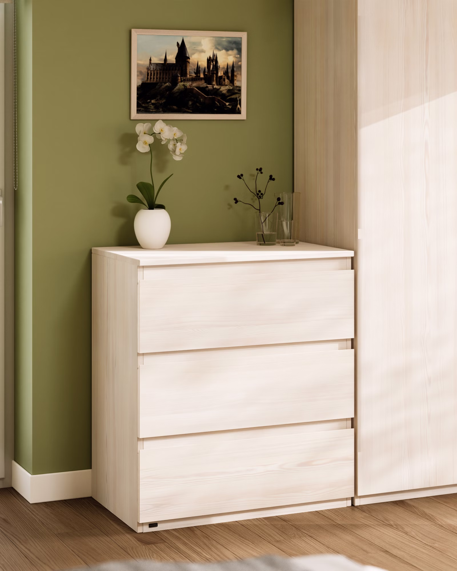 Die drei Schubladen mit kugelgelagerten Leichtlaufschienen und Vollauszug bieten genügend Stauraum und ermöglichen einen Einblick bis in den hintersten Teil der Schublade. Durch die Griffmulden sind sie auch für kleine Kinderhände leicht zu öffnen. Die Kommode sowie die Schubladen sind aus ganzen Massivholzplatten gefertigt und somit äußerst stabil und bruchsicher.